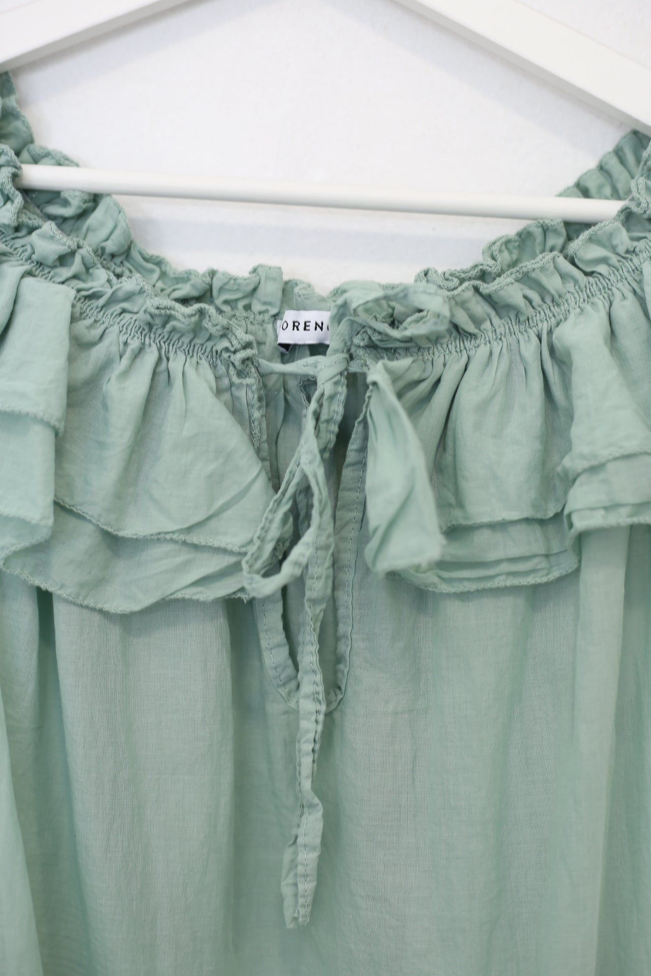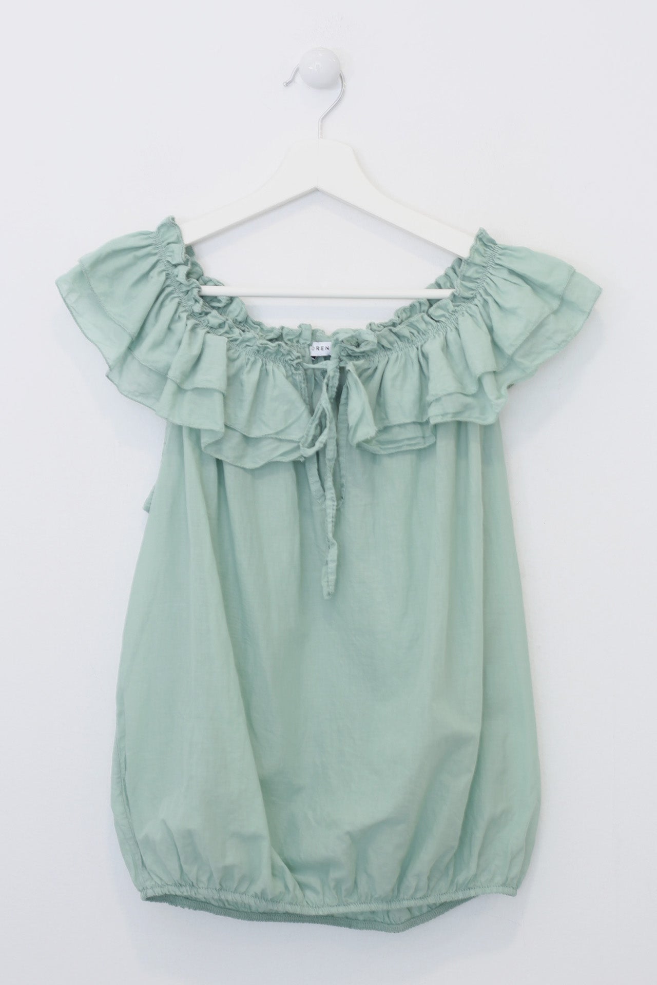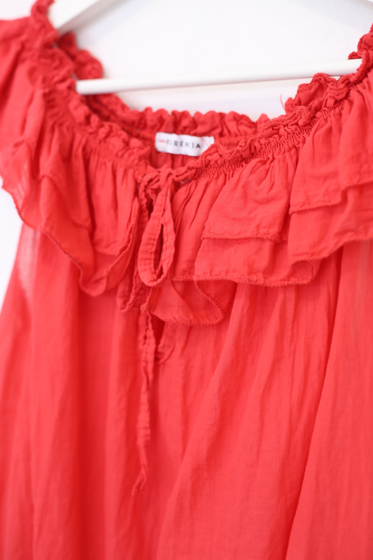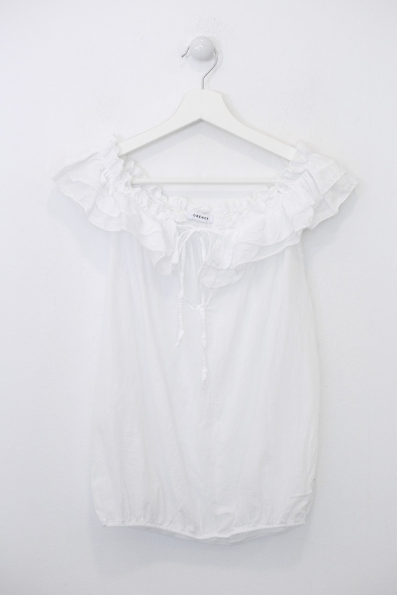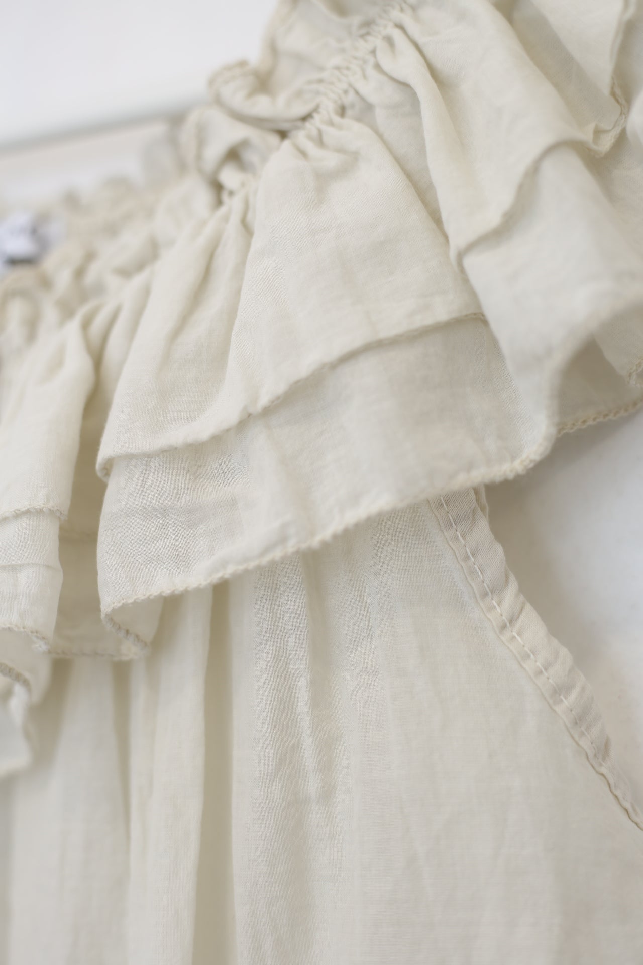 Top sin mangas con cuello redondo elástico y fruncido y con detalle de volantes. Abertura en el pecho con cierre acordonado. Bajo elástico.