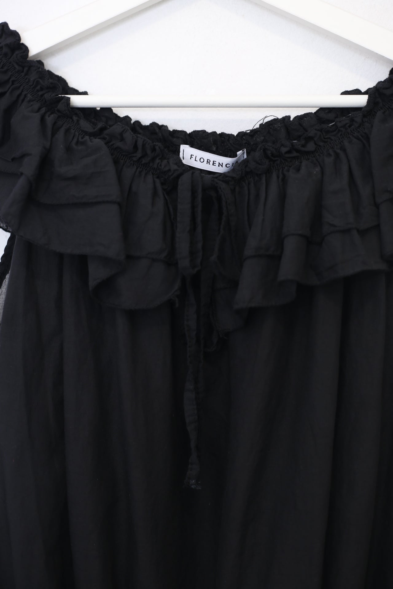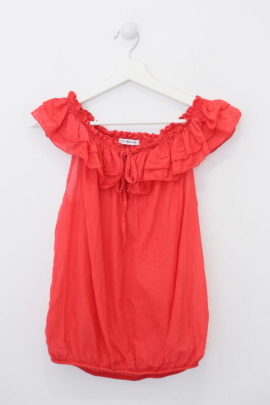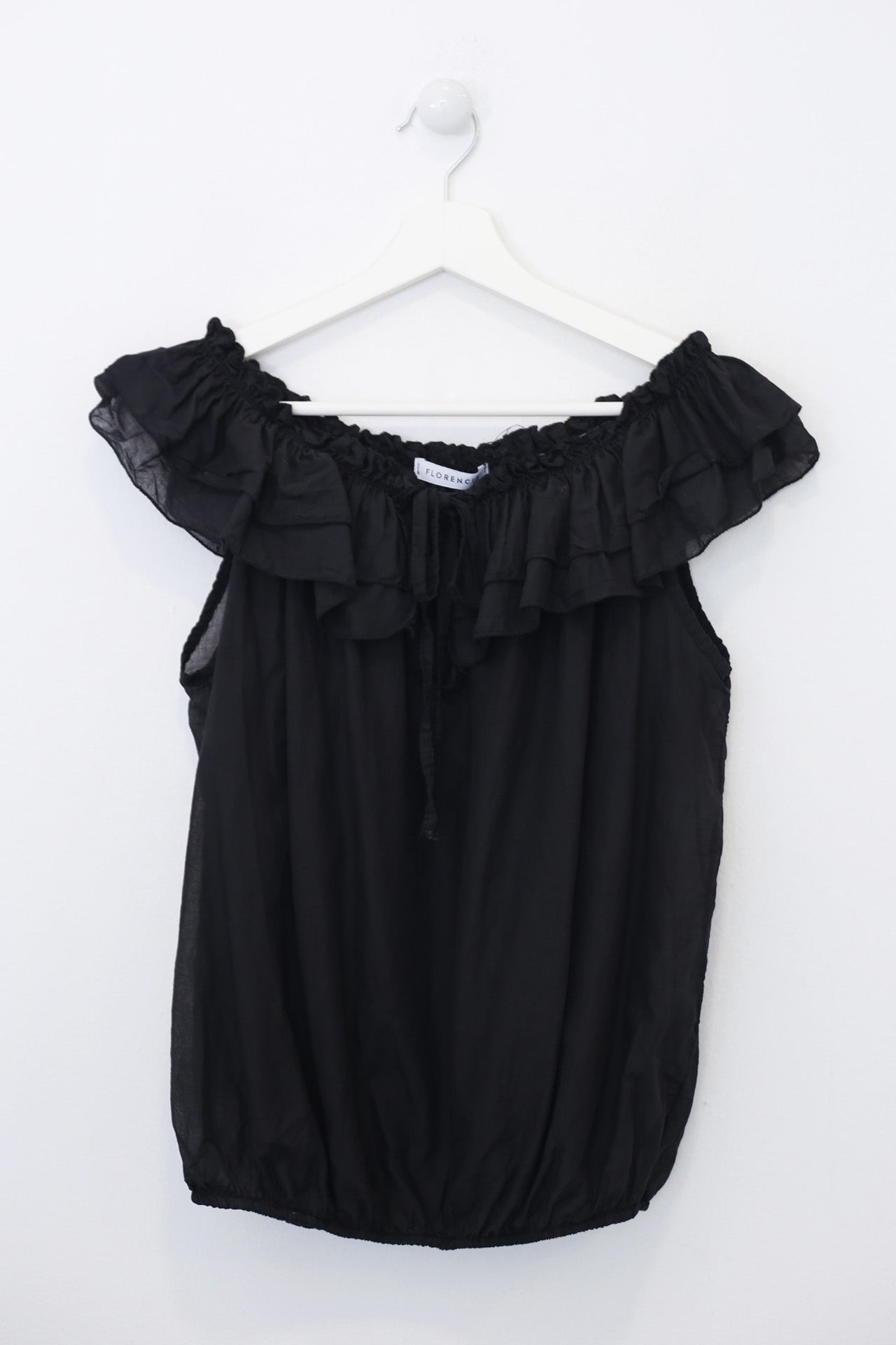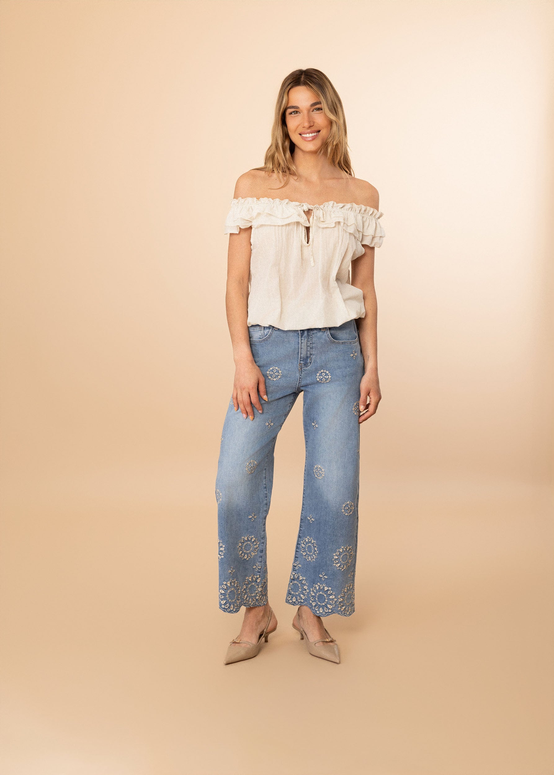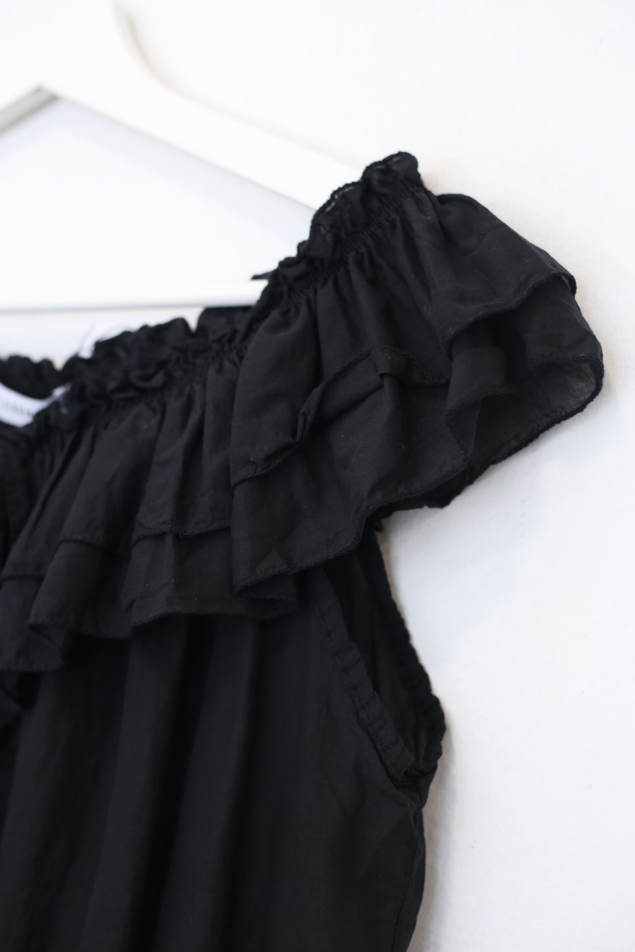 Top sin mangas con cuello redondo elástico y fruncido y con detalle de volantes. Abertura en el pecho con cierre acordonado. Bajo elástico.