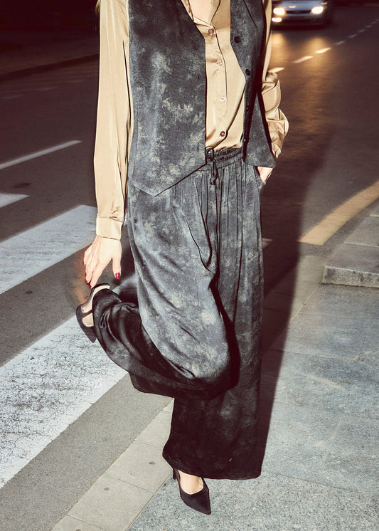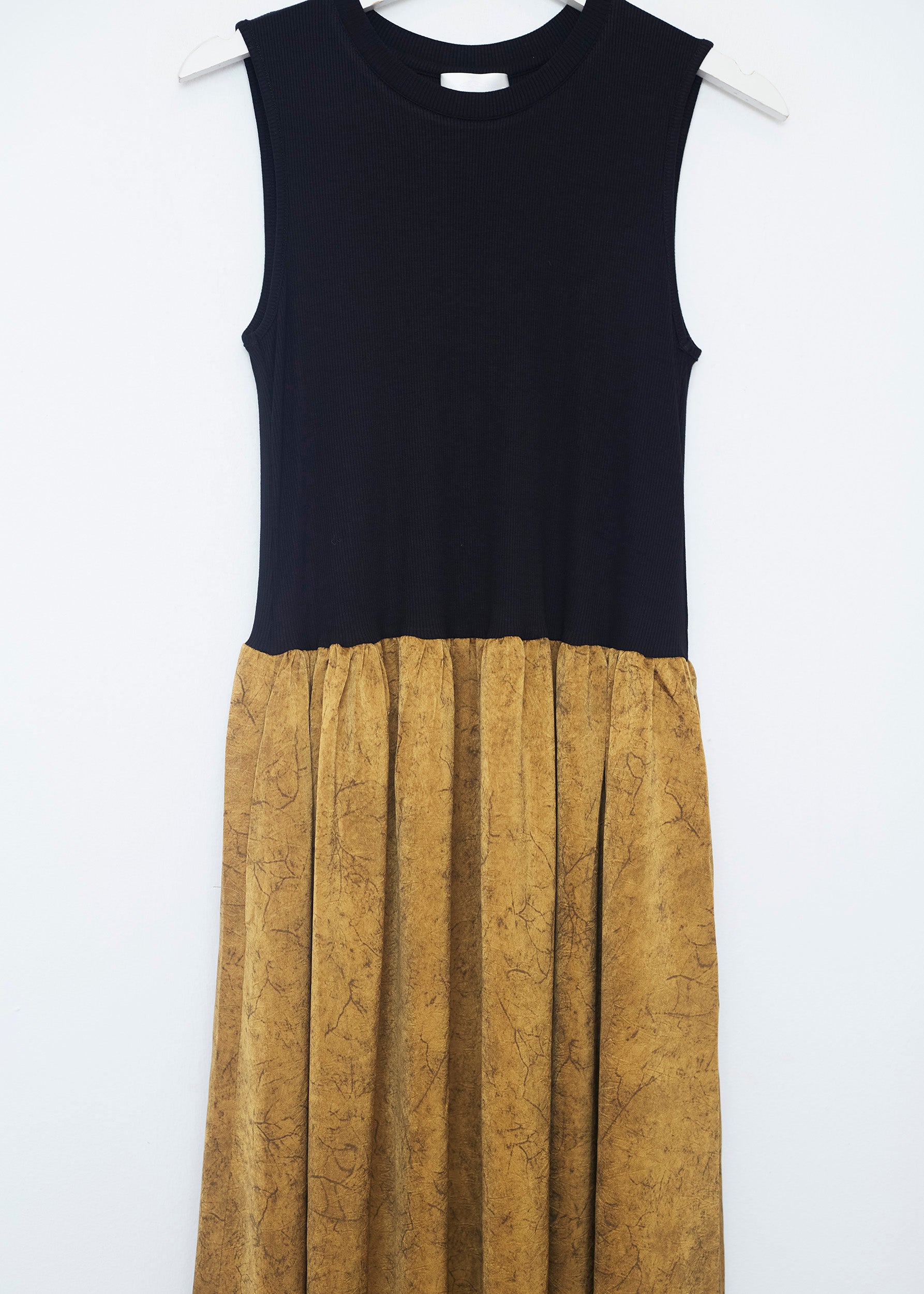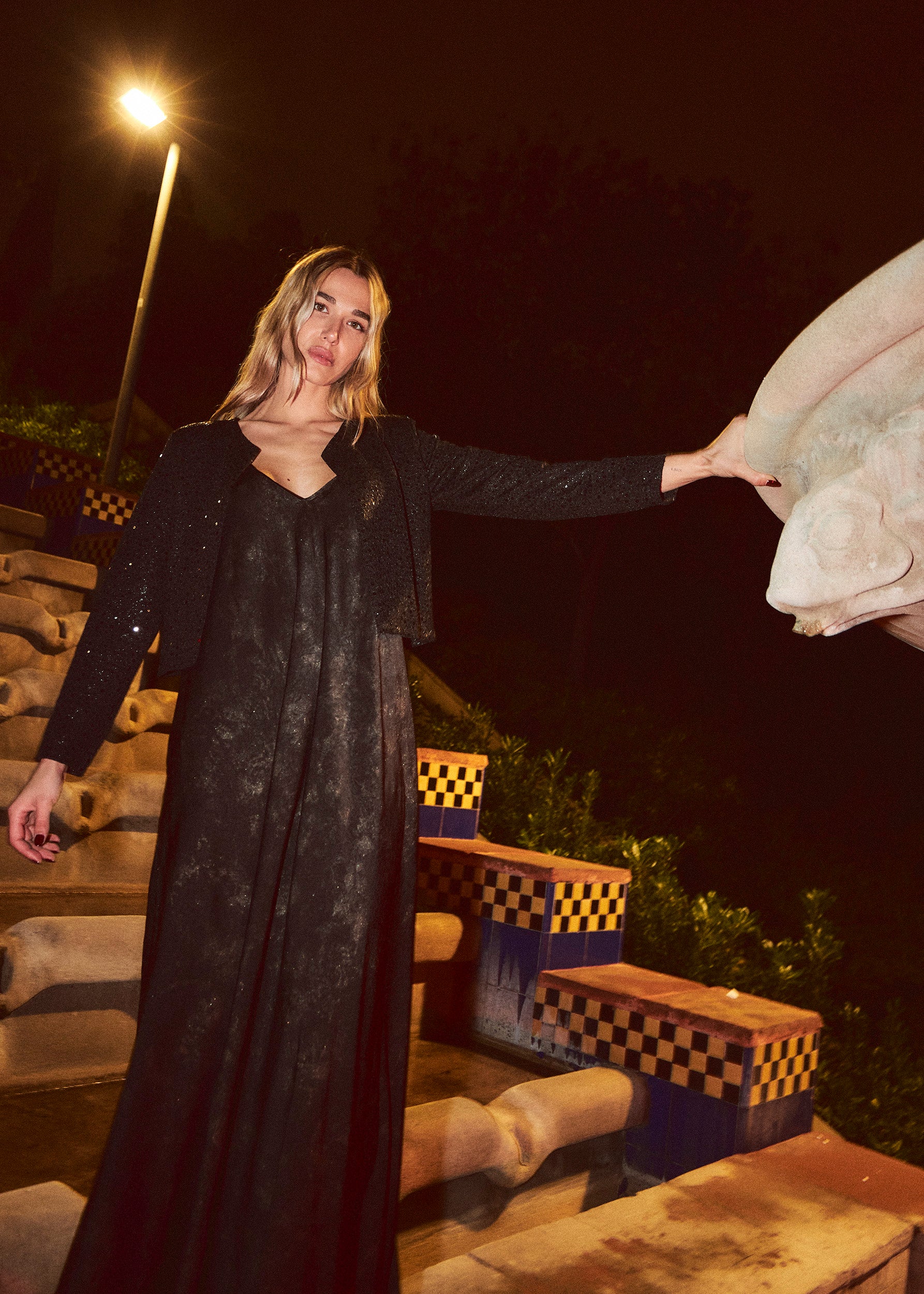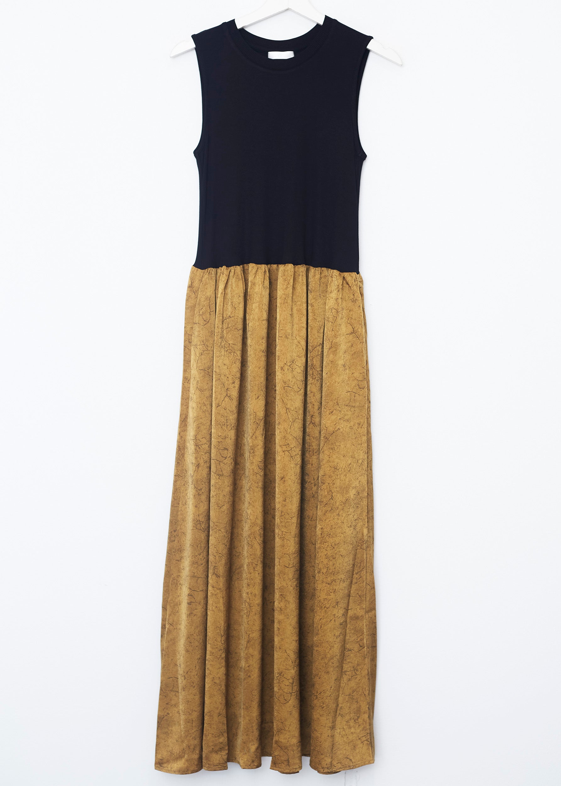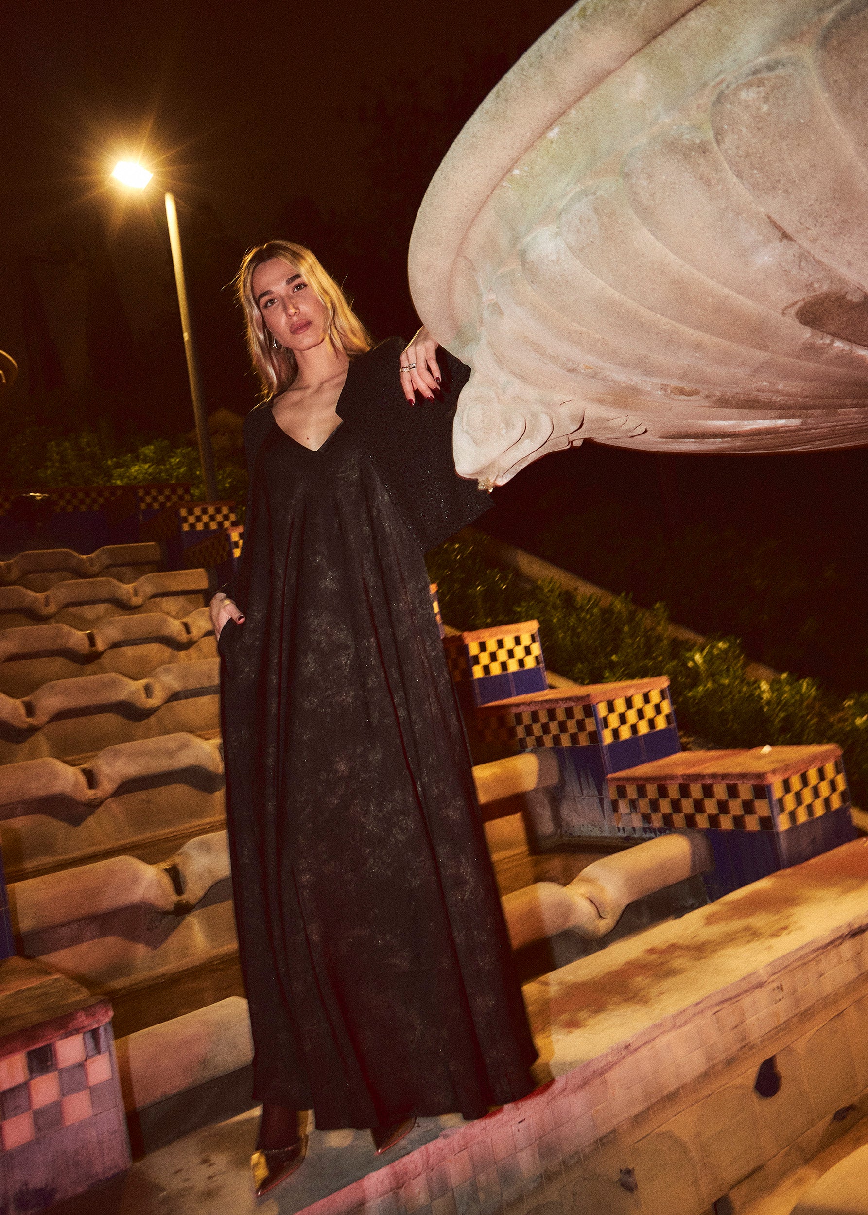 Long dress with adjustable thin straps and pointed neckline. A-line cut. Brocade print.