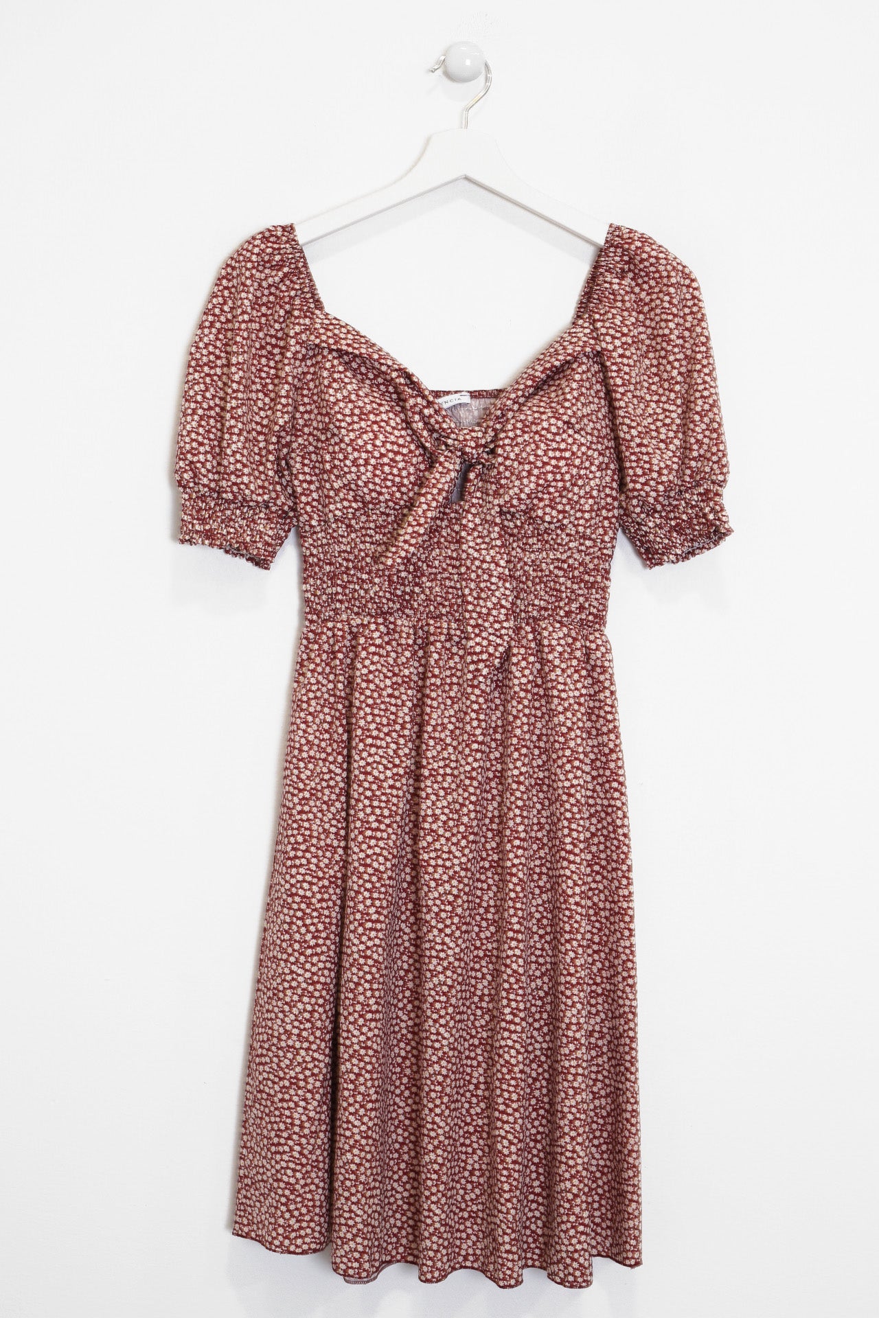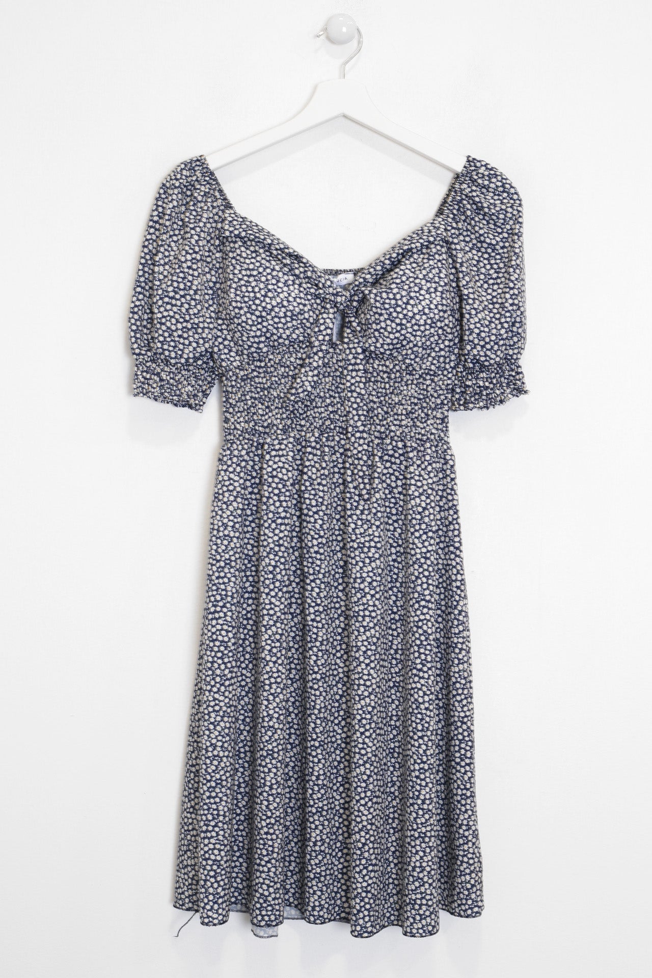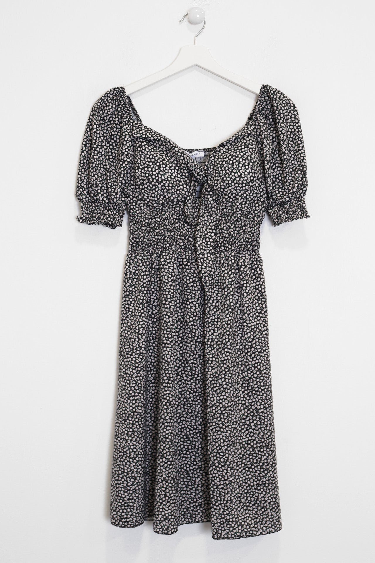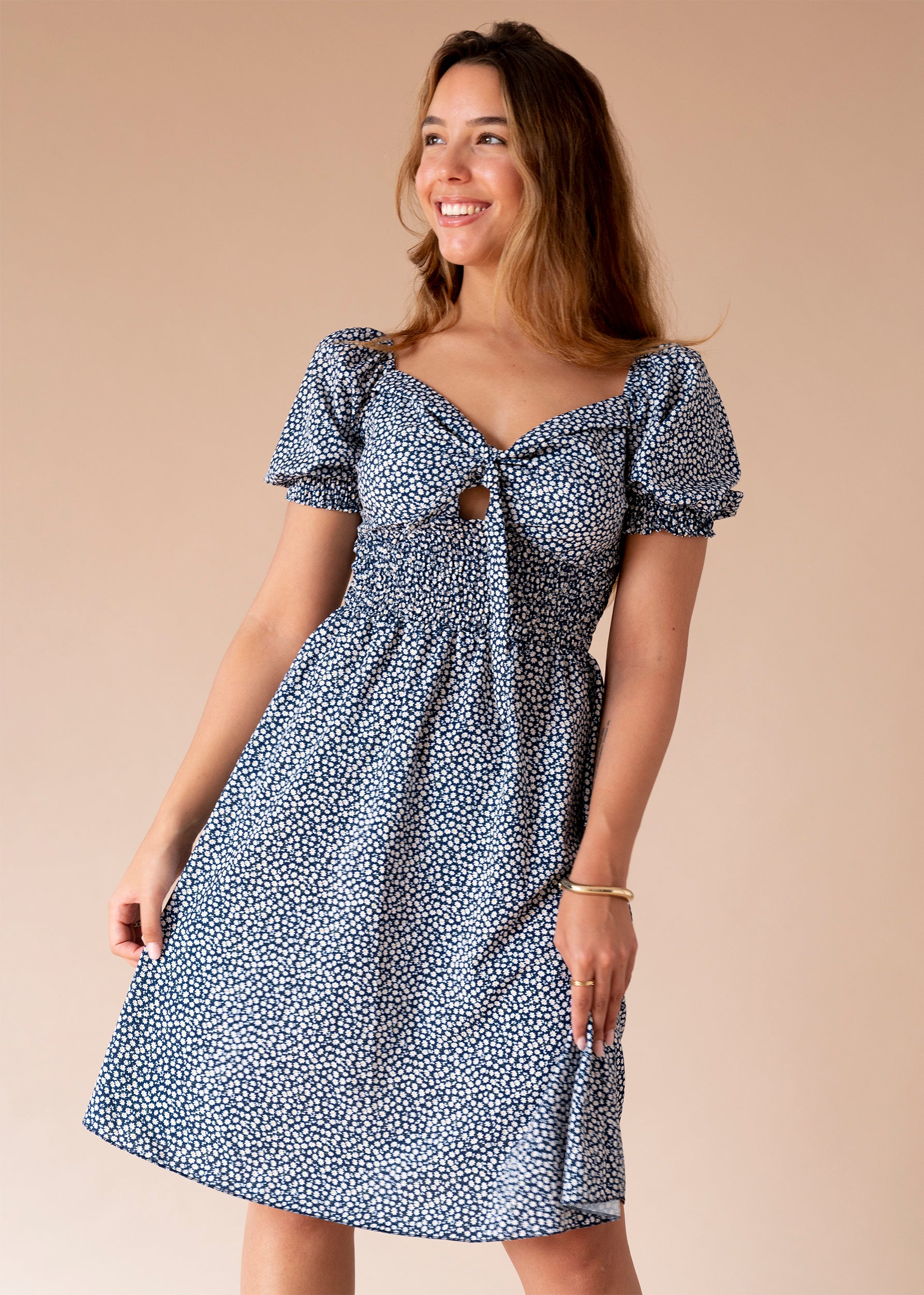 Vestido corto con escote en punta y manga corta abullonada acabada en elástico. Detalle de tejido elástico tipo nido de abeja bajo pecho y en espalda. Detalle de lazo en escote. Detalle de relleno oculto en el pecho.