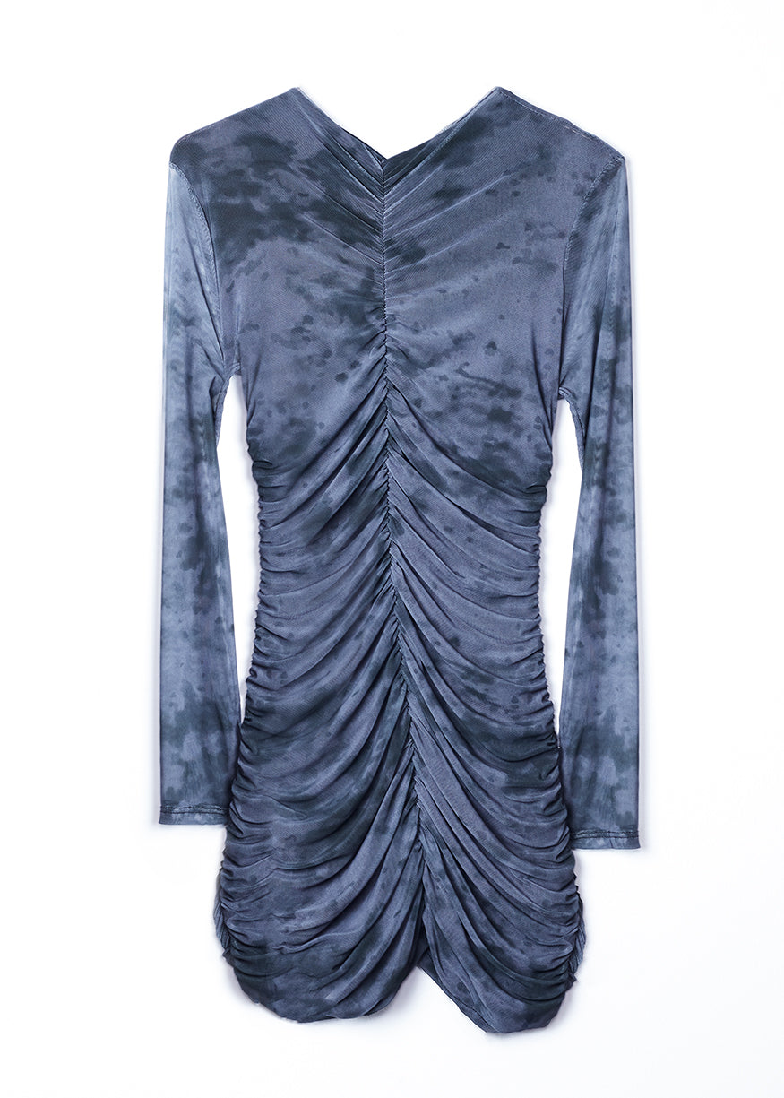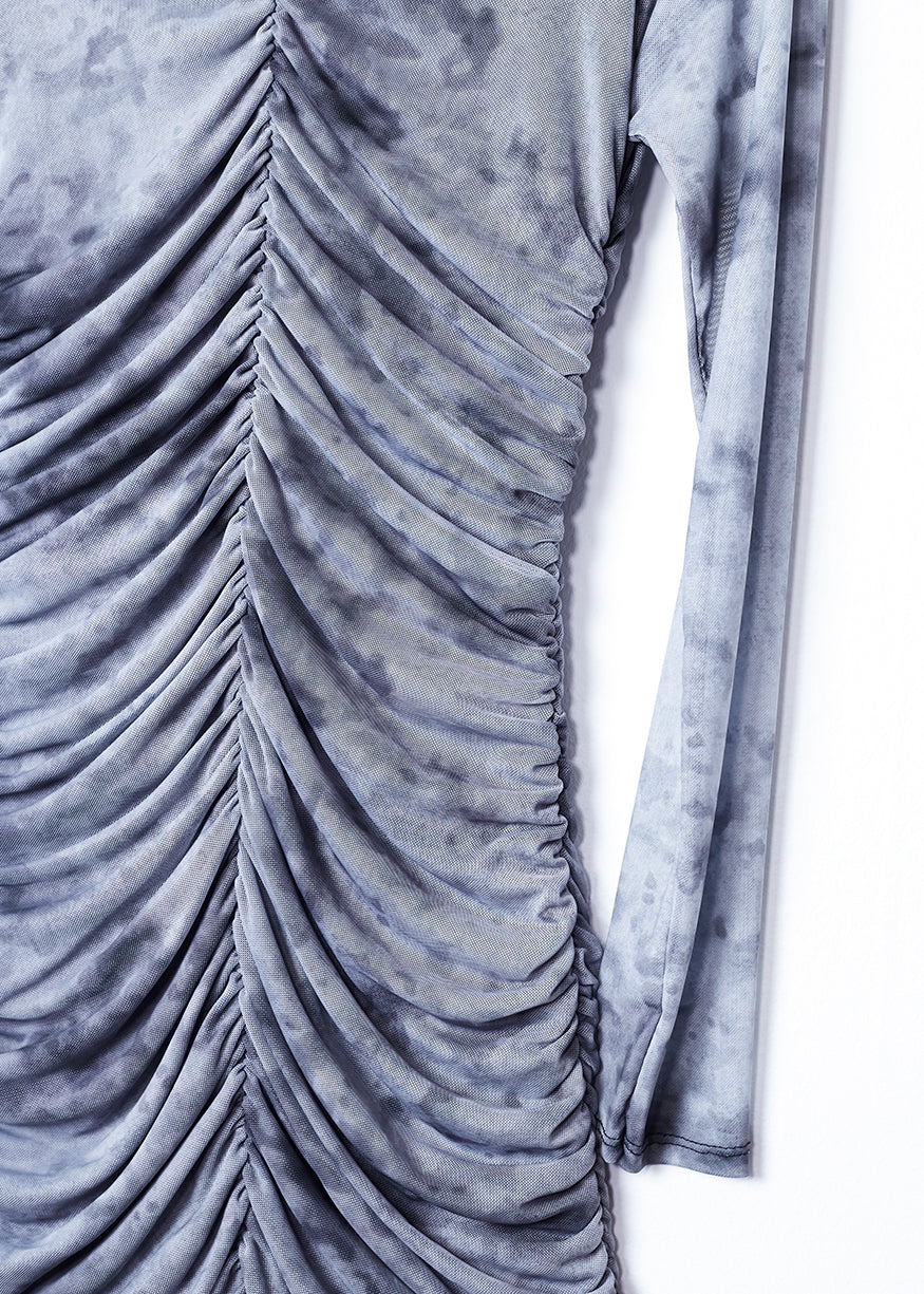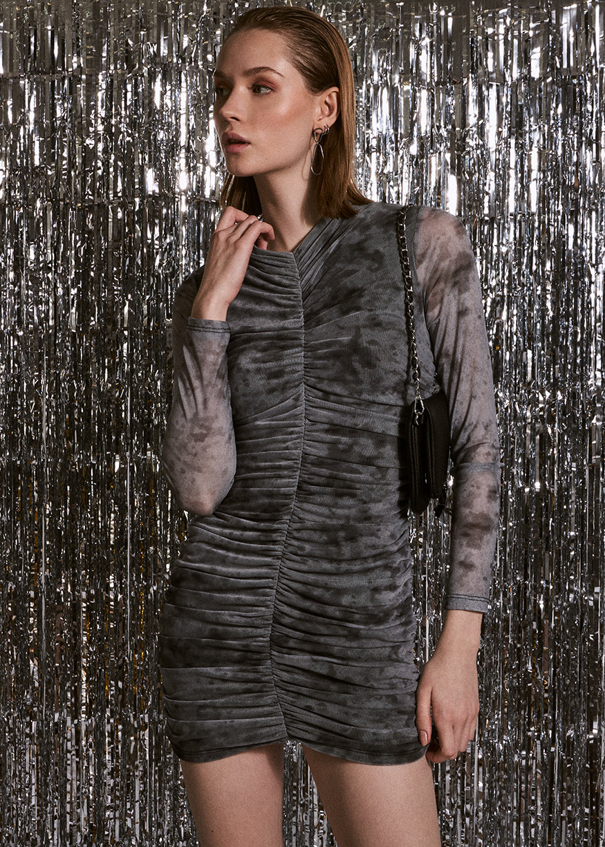 Semi-transparent draped dress with a round neckline and long sleeves. Interior lining on body. Gathered details. Textured print and elastic fabric.