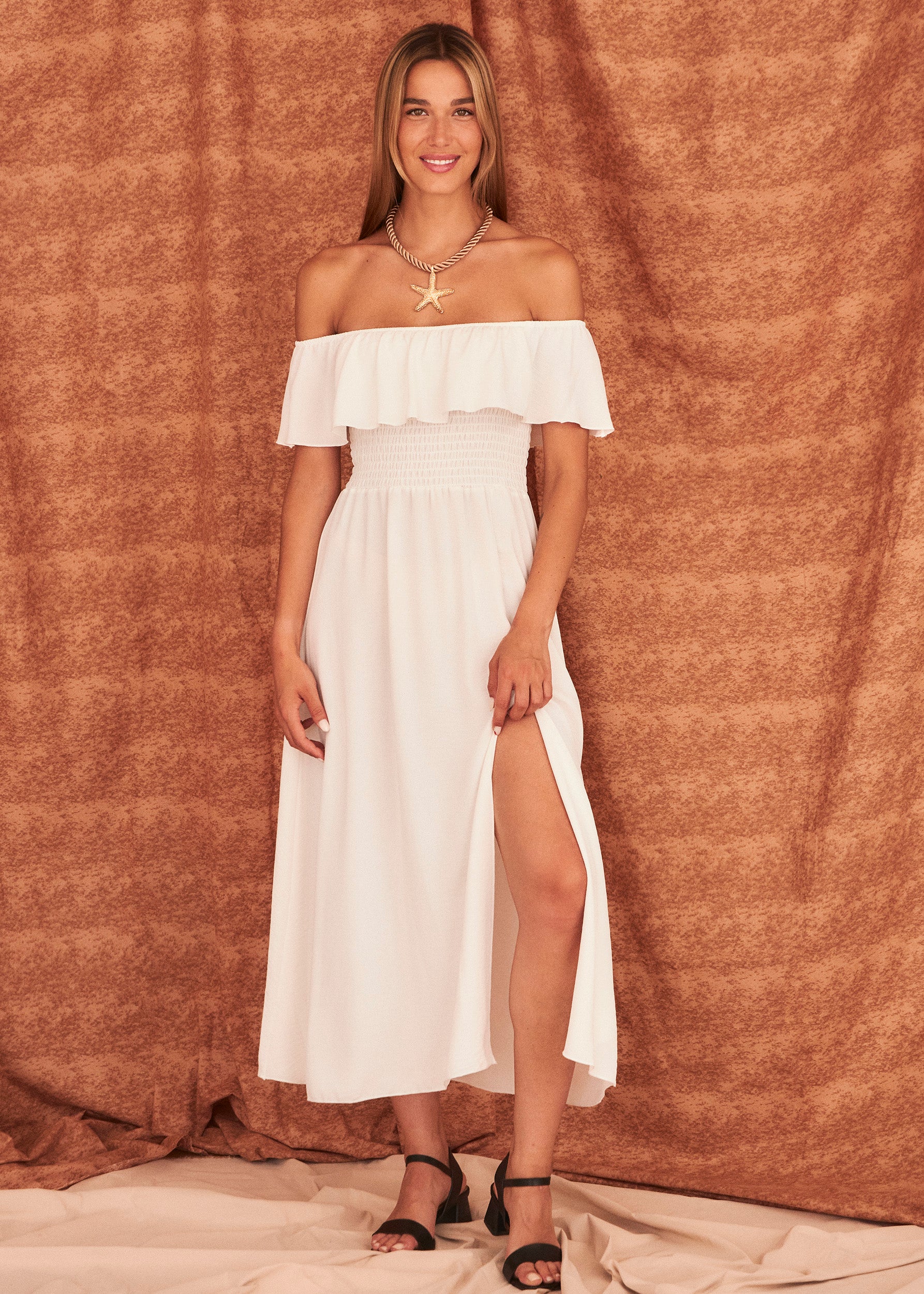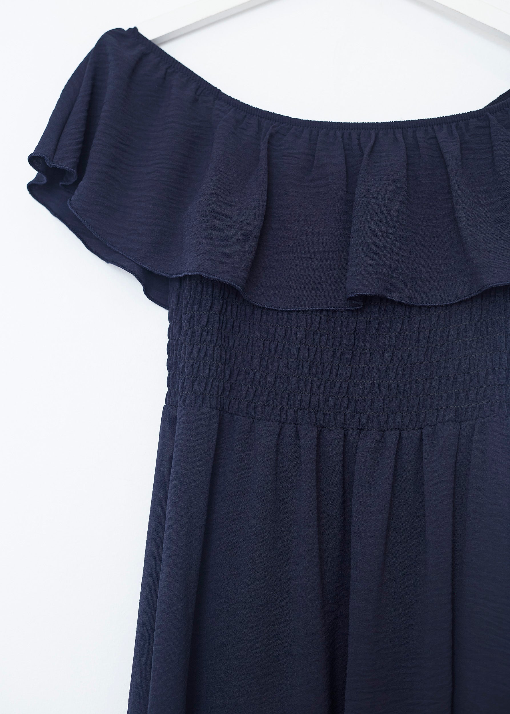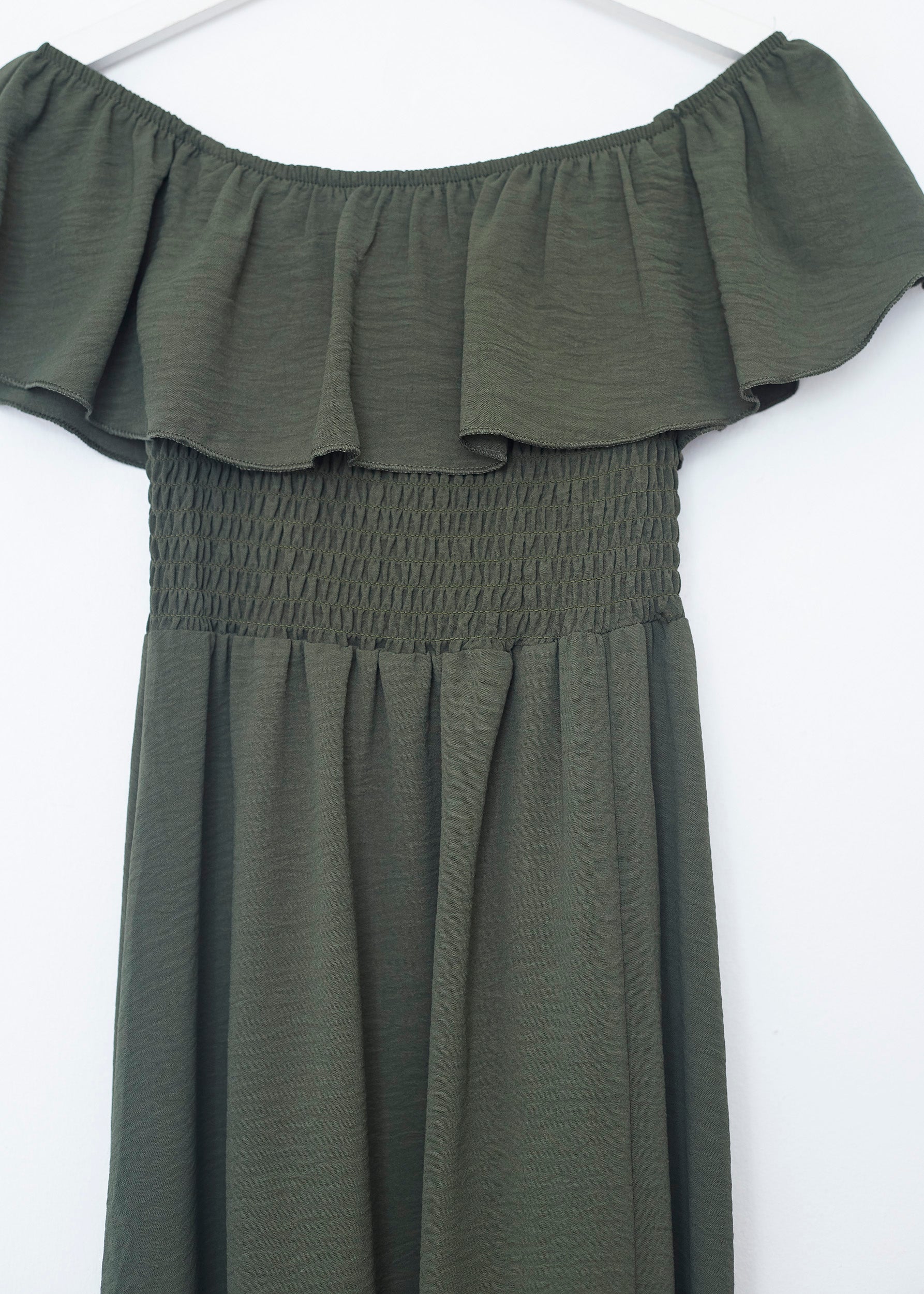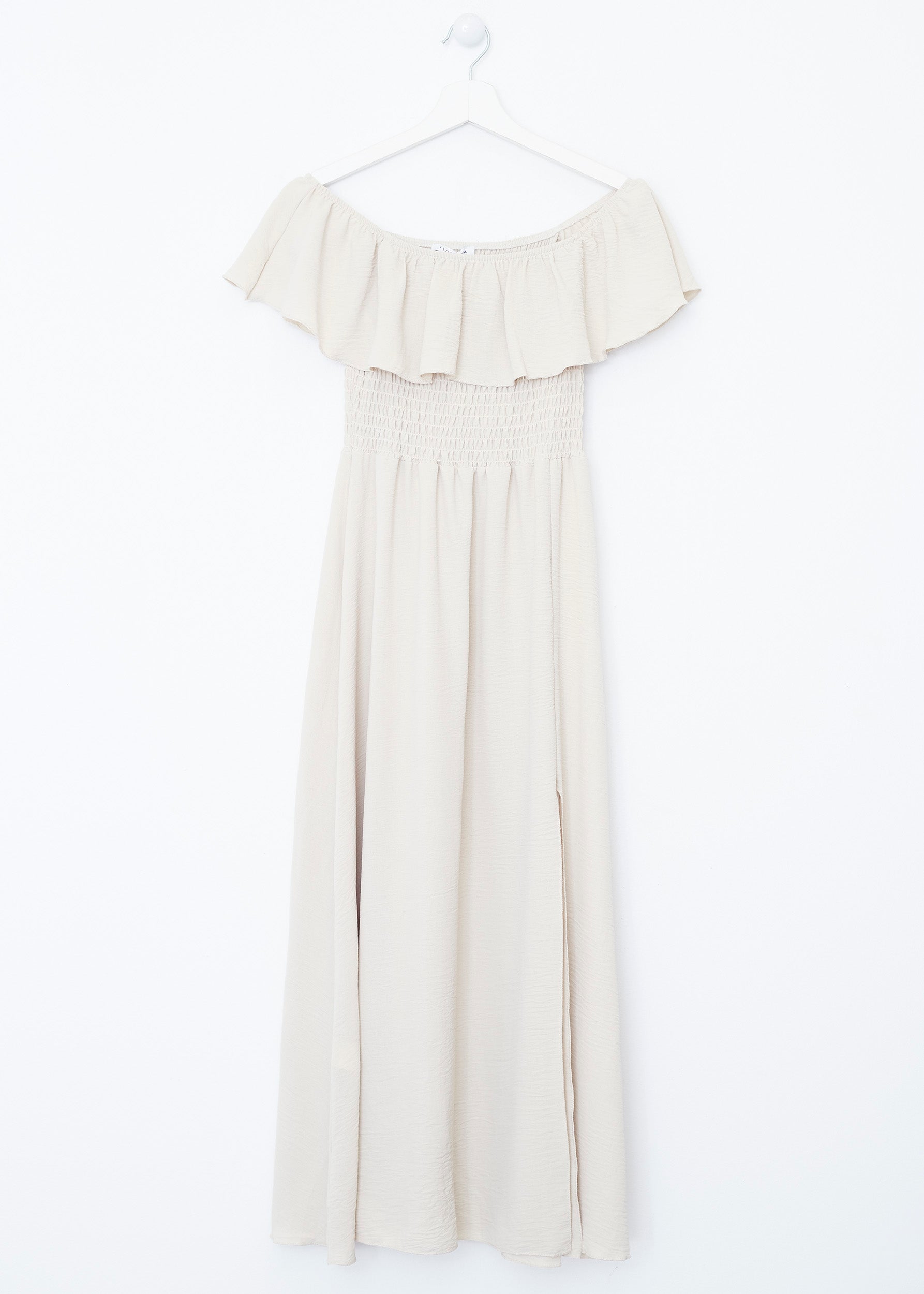 Long dress with a straight neckline and flounce. Elastic honeycomb fabric detail. Opening at the bottom.
