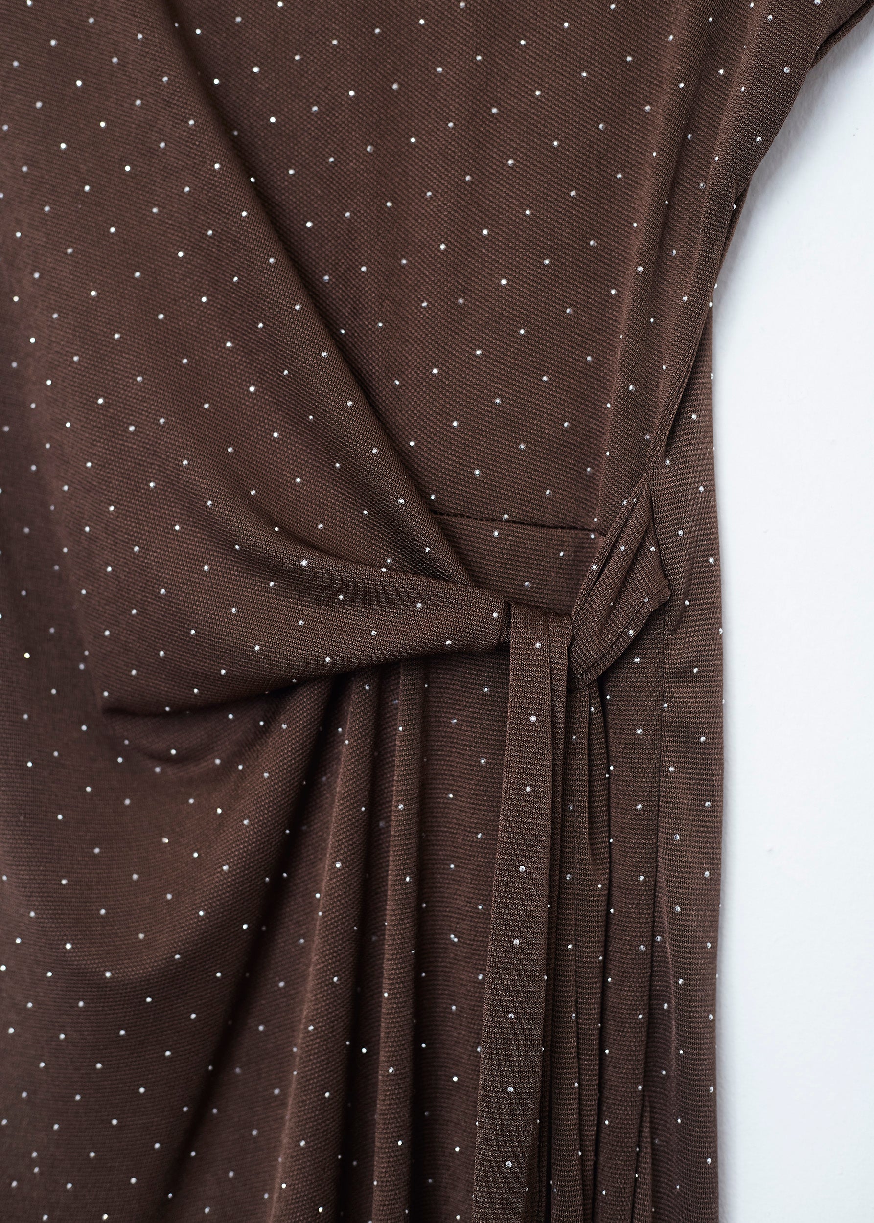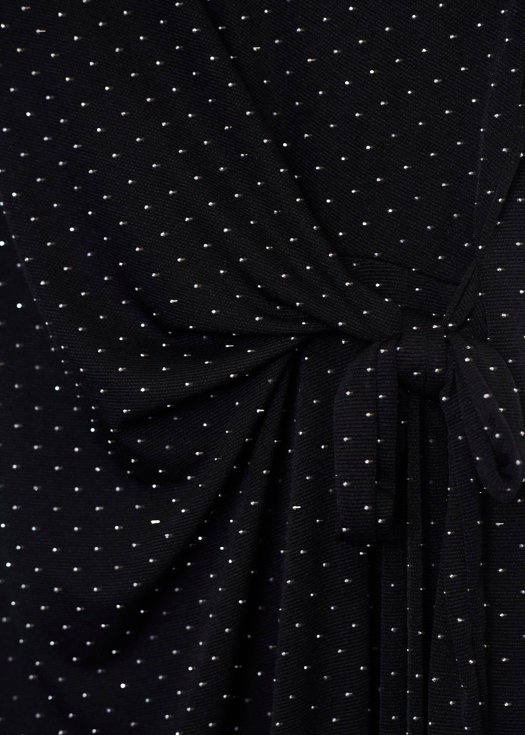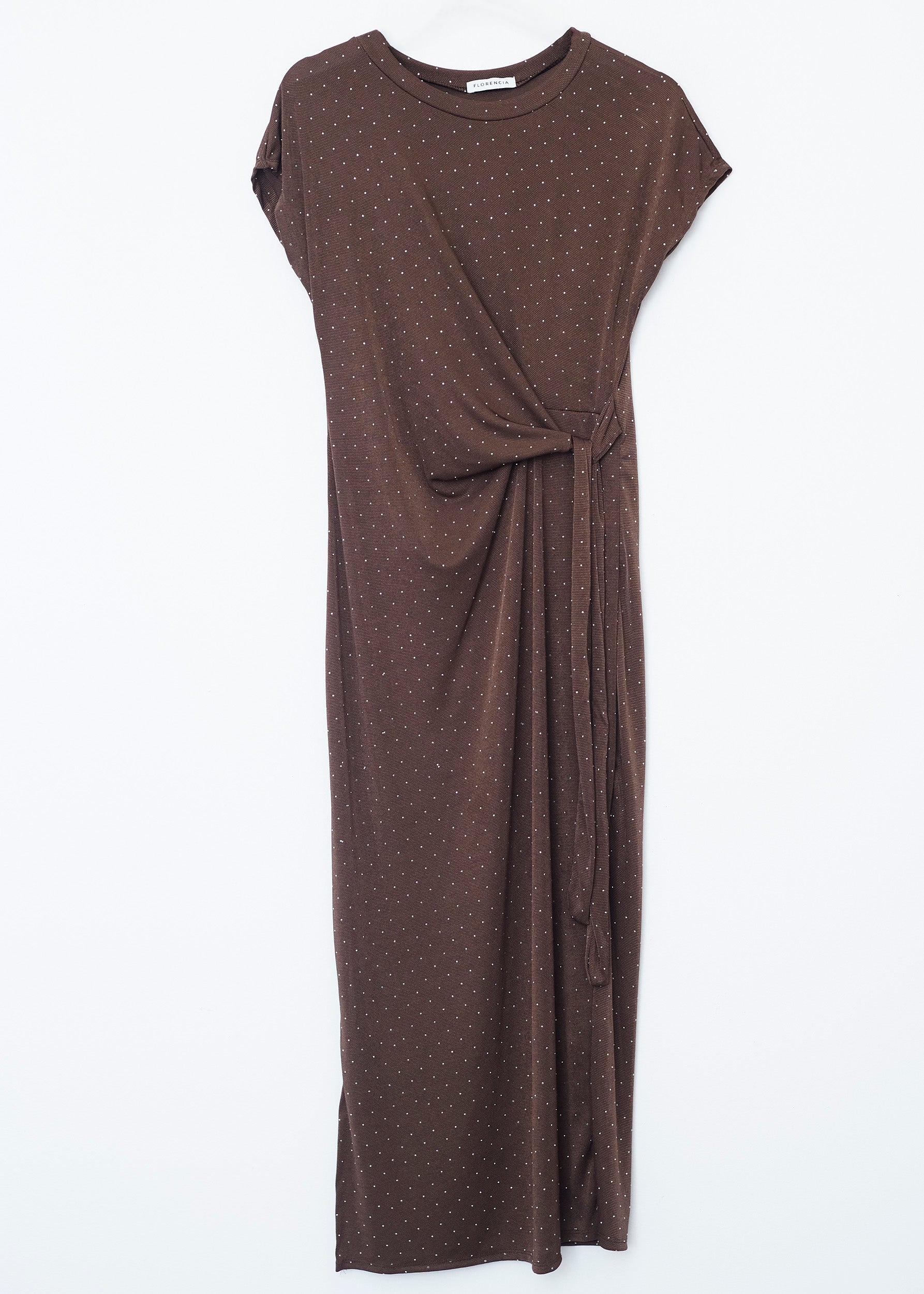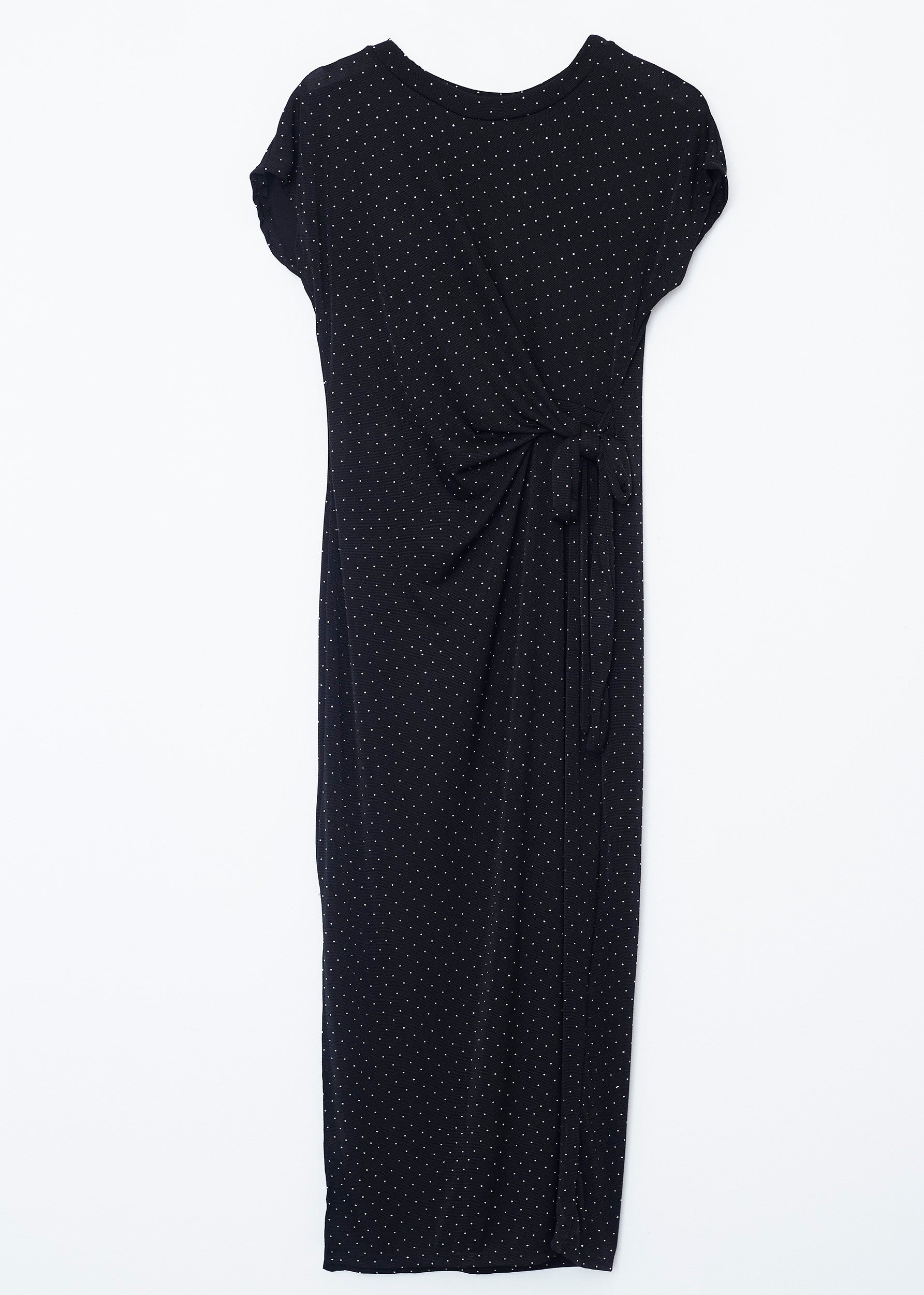 Round neck dress with sleeveless sleeves. Bow detail on left side waist. Slit on right bottom. Fabric detail with glitter appliqués.