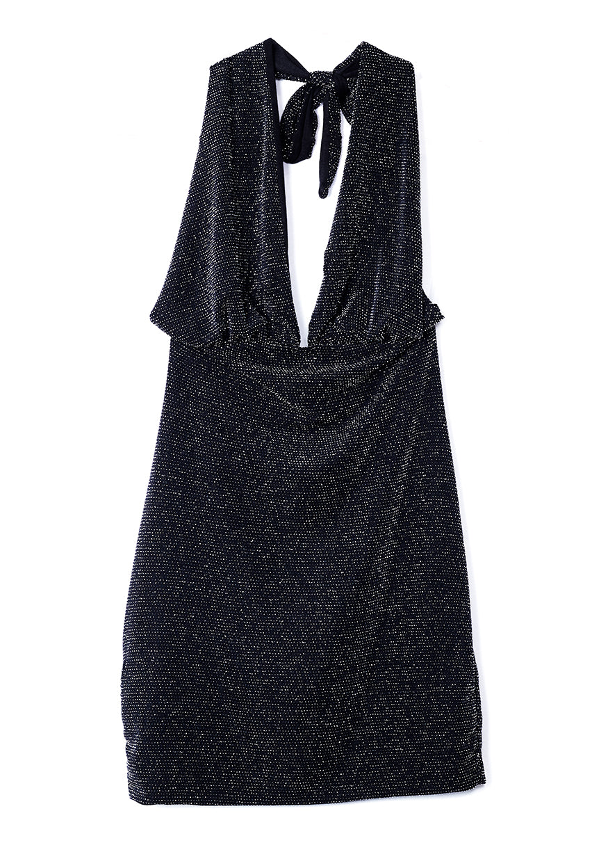 Short dress with a pronounced V-neckline. Bare back. Straps tied at the back in the shape of a knot.