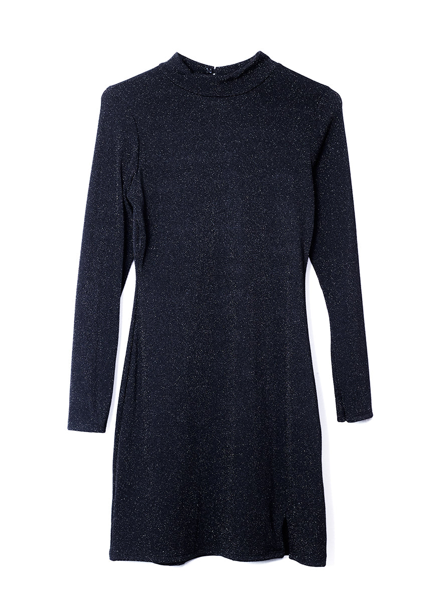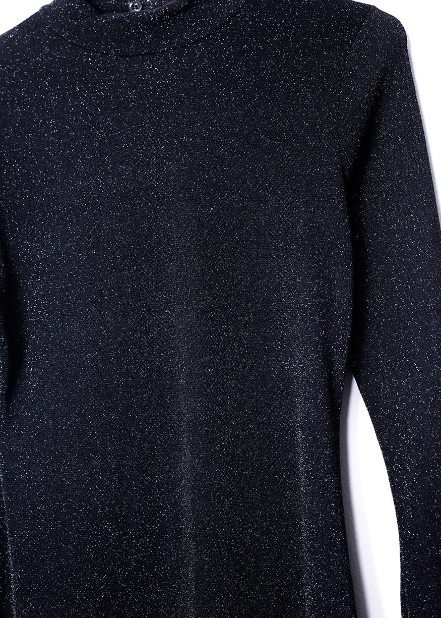 Lurex dress with a Perkins collar and back button closure. Long sleeve. Opening detail at the bottom.