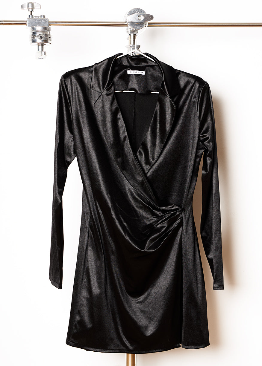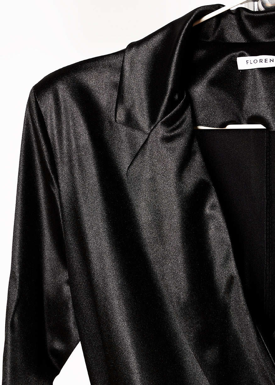 Dress with lapel neckline and long sleeves with shoulder pads. Front closure with side button and hidden button. Soft touch satin fabric.