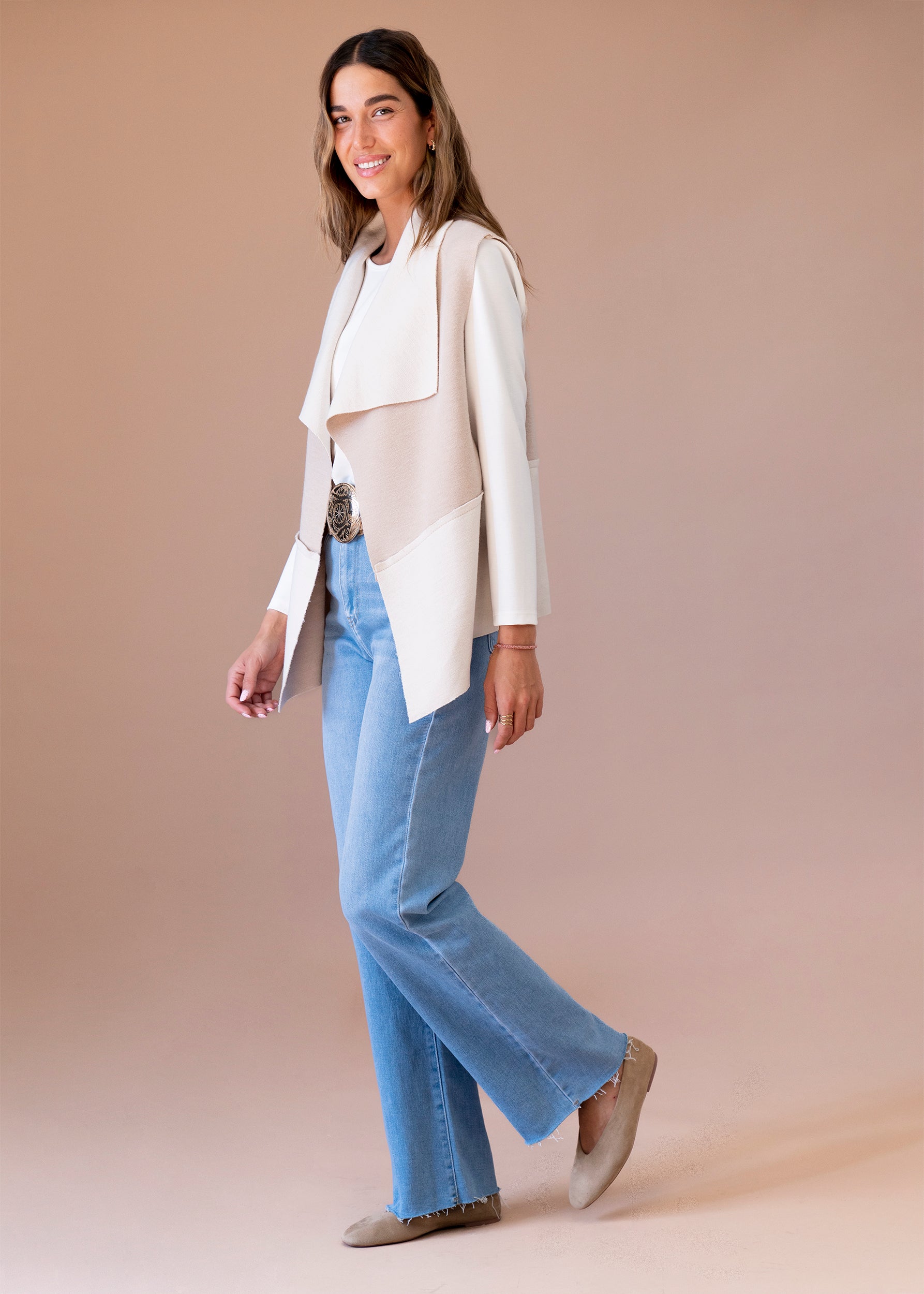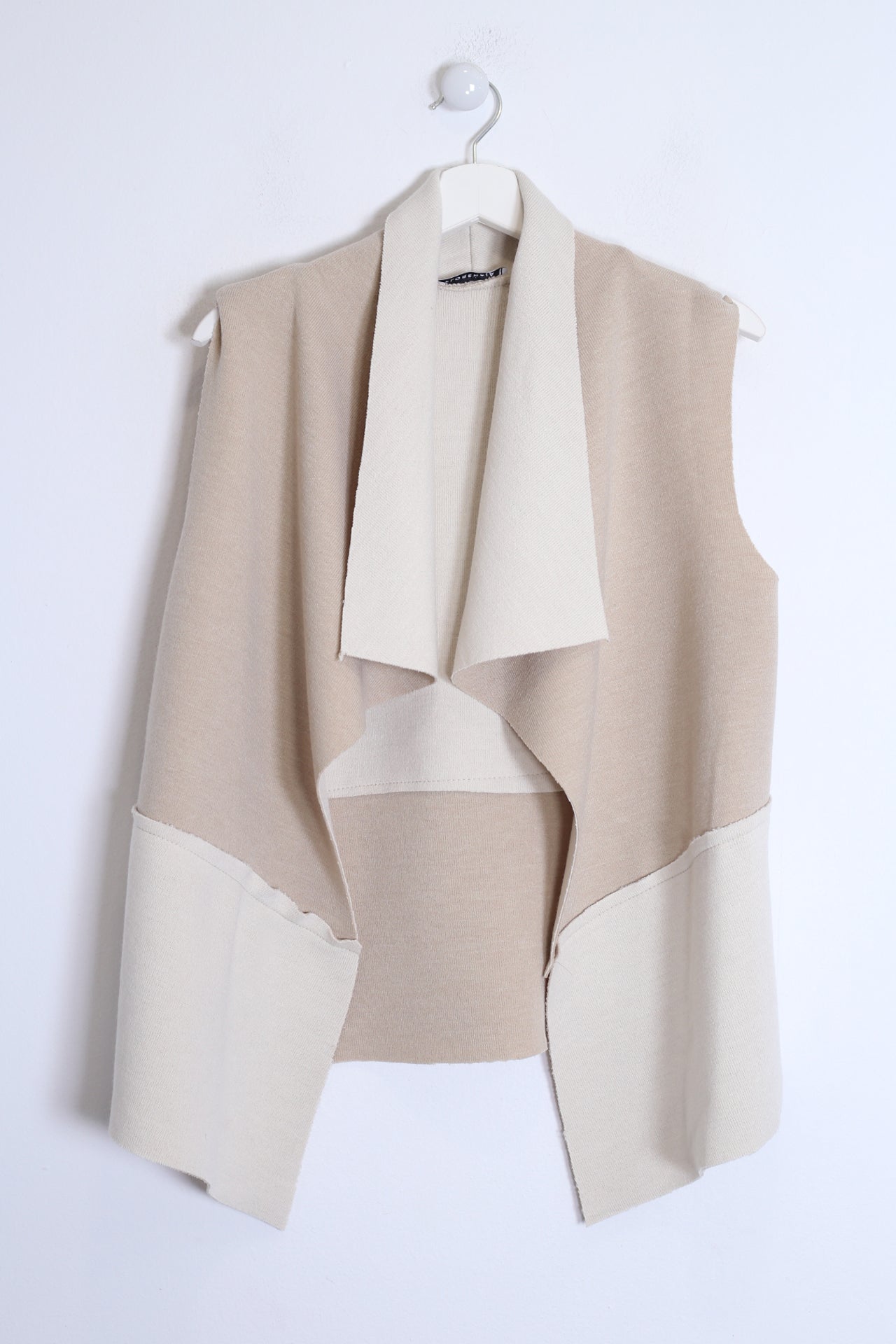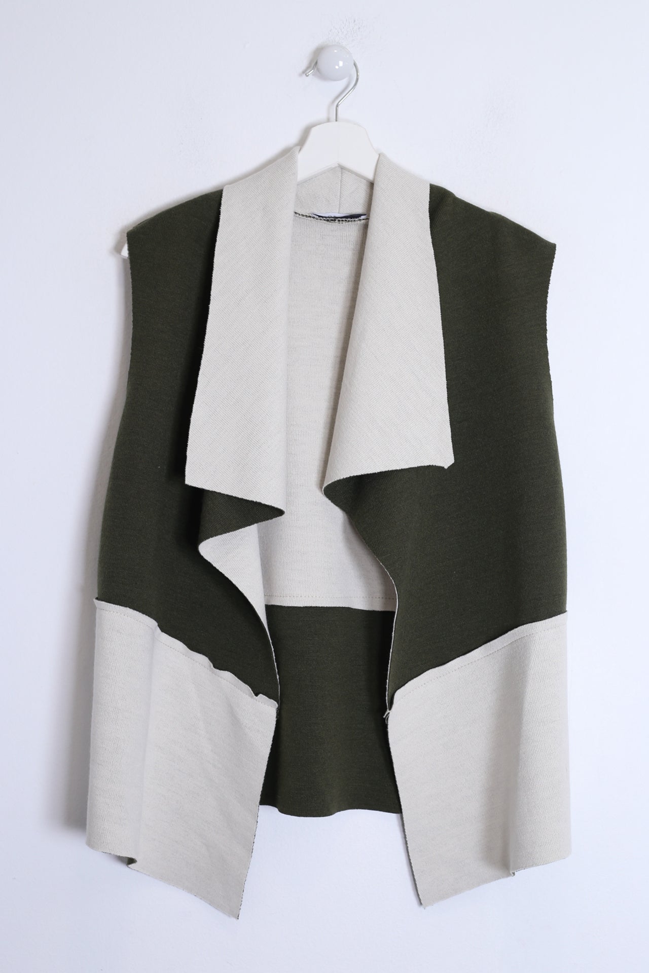 Chaleco con escote de solapa vuelta. Bajo asimétrico. Tejido en punto bitono.