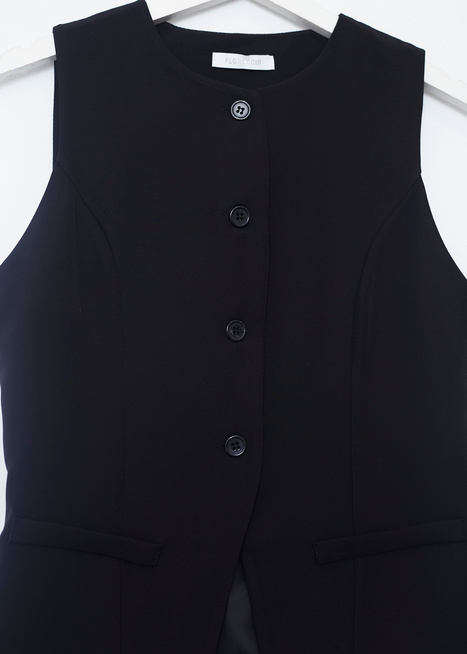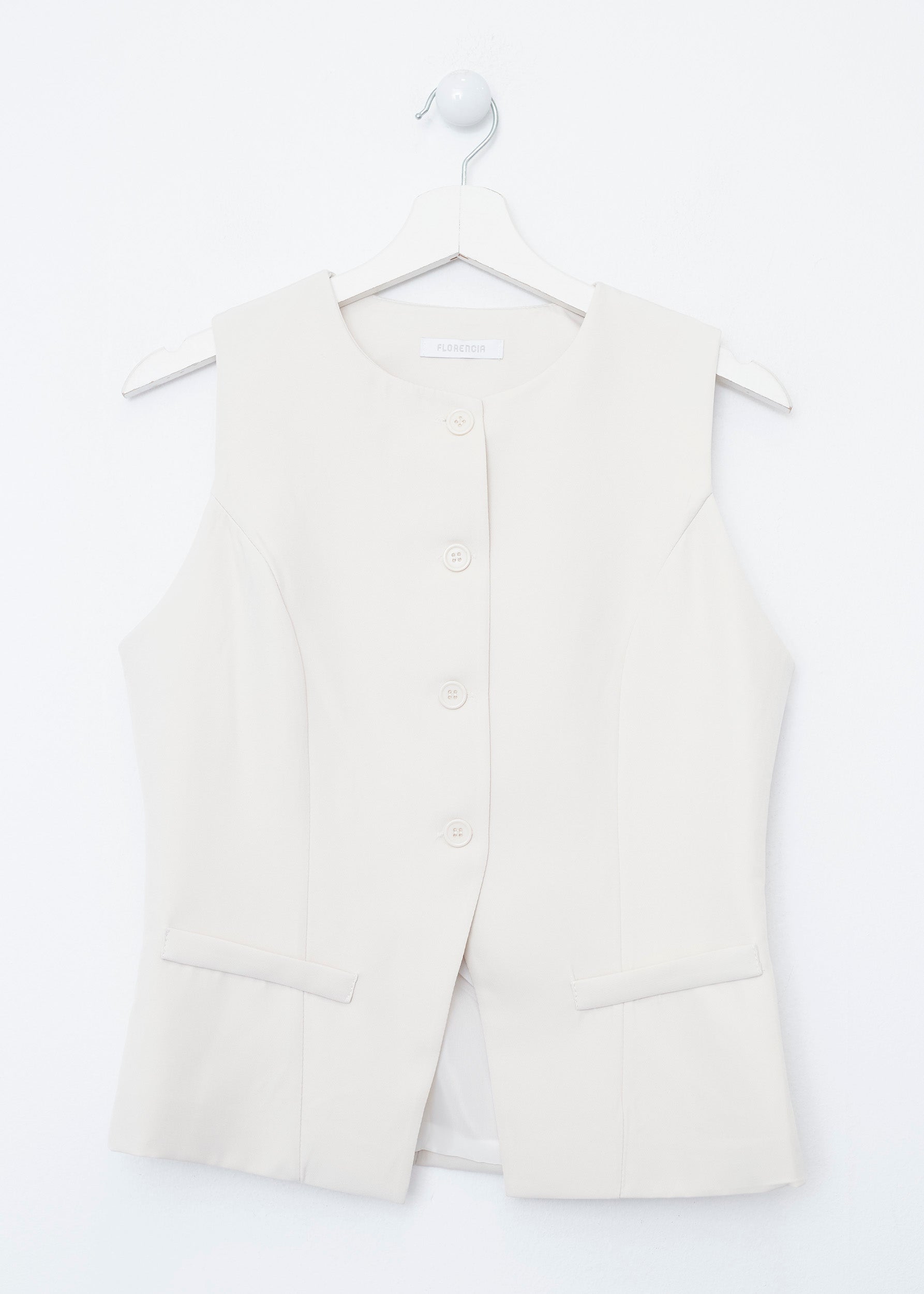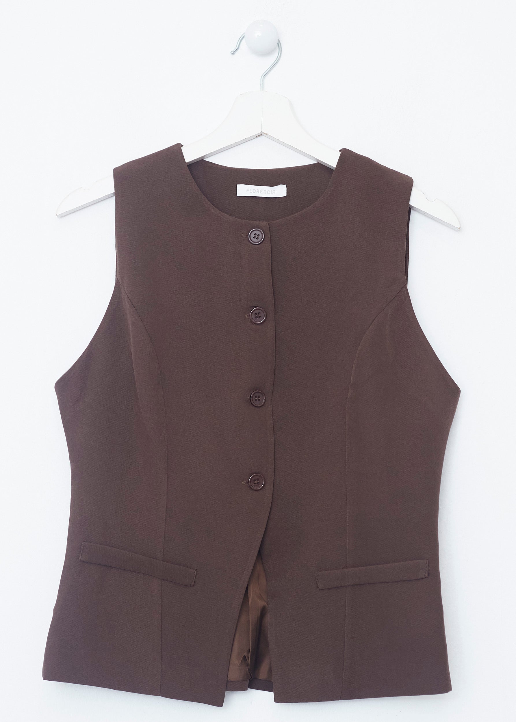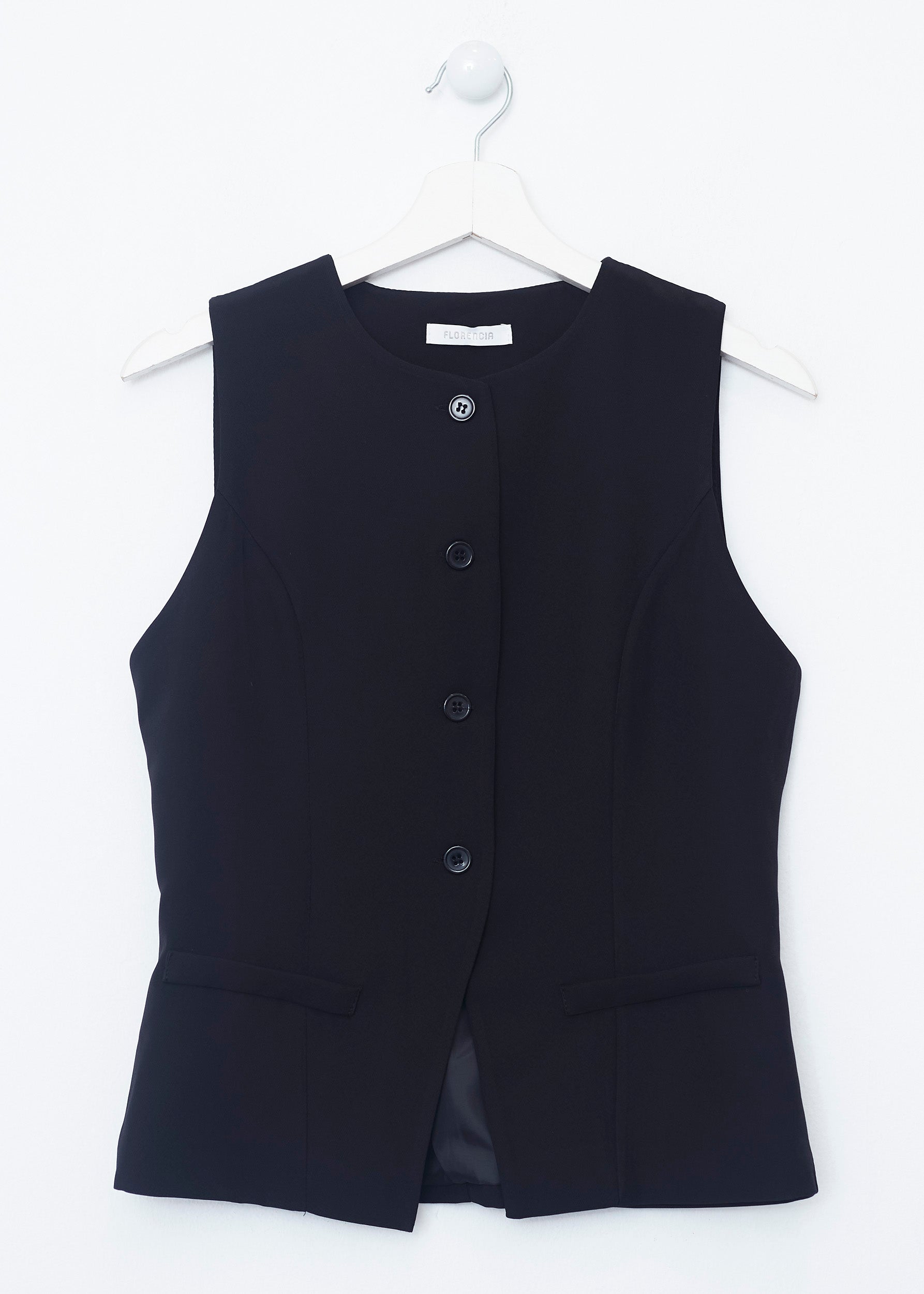 Vest with round neckline and sleeveless sleeves. Front button closure. Detail of false front welt pockets. Inner lining. Slim fit.