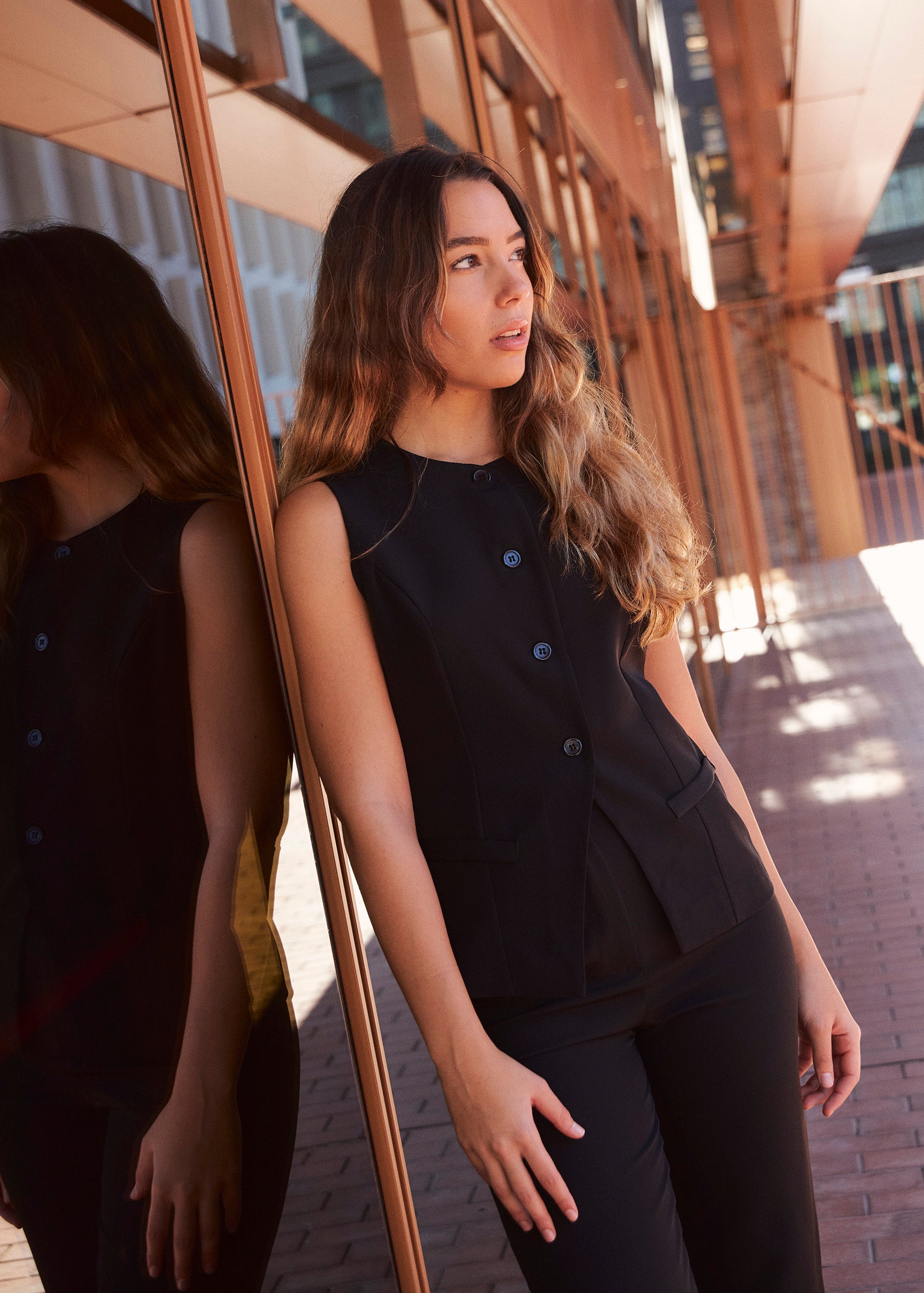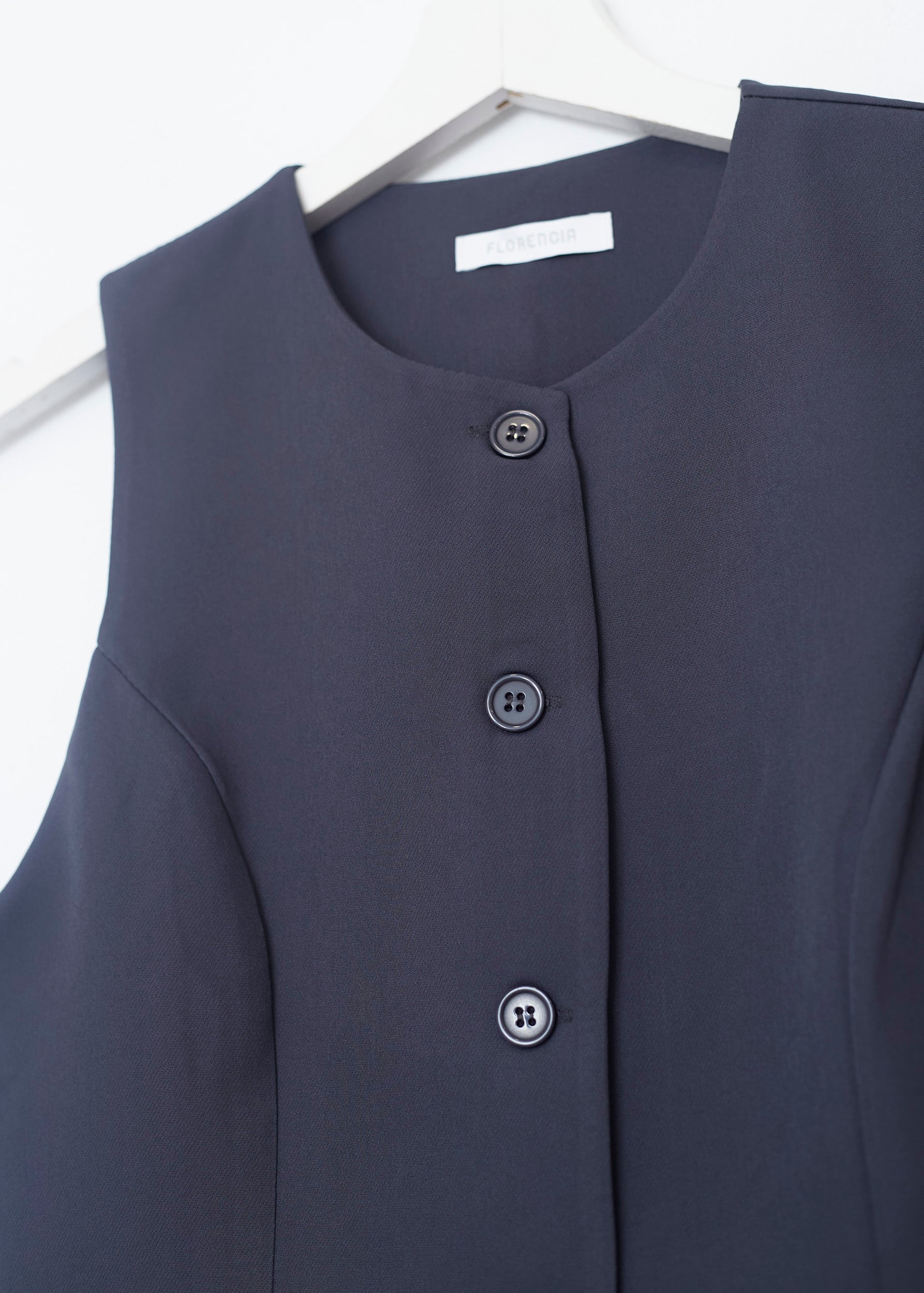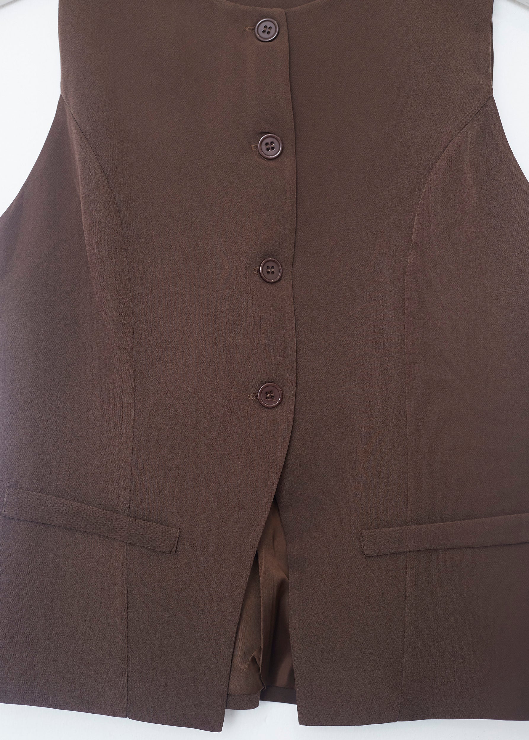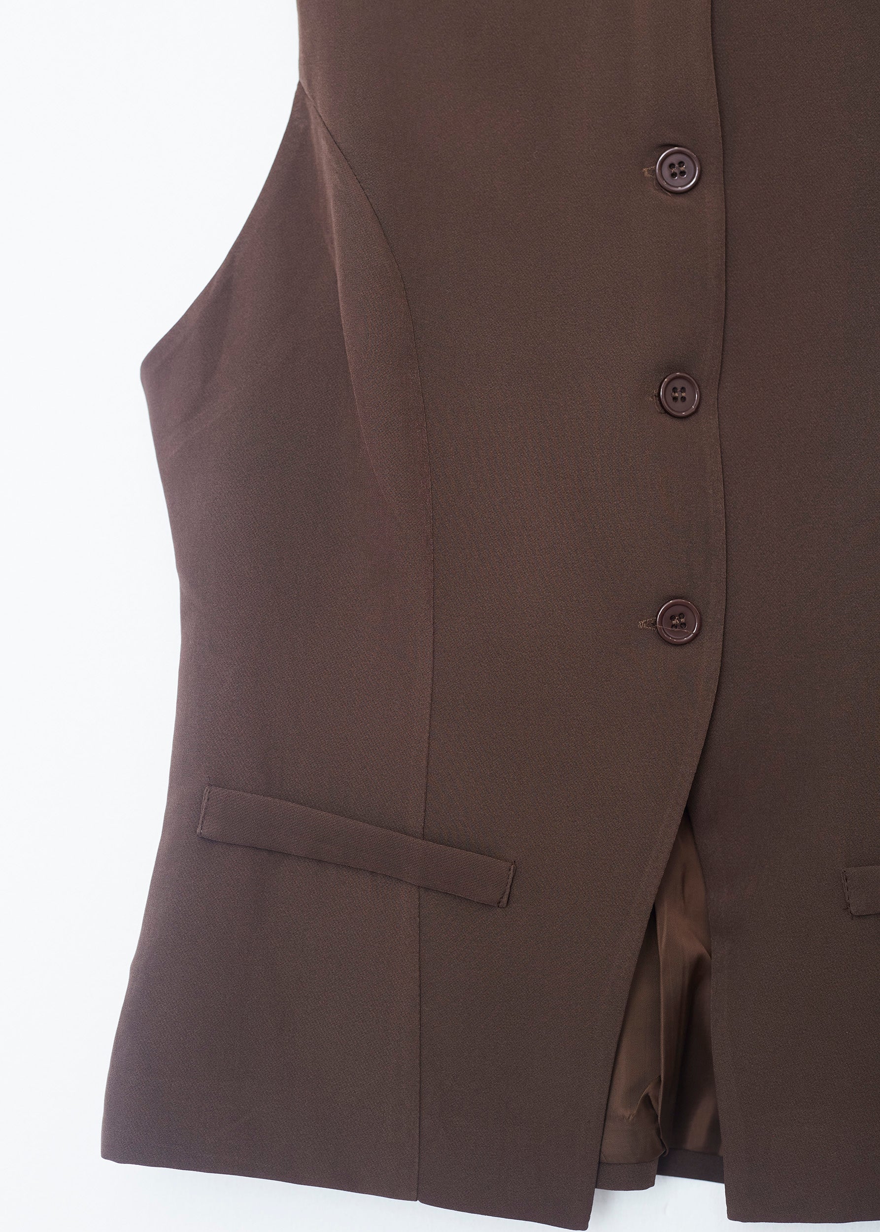 Vest with round neckline and sleeveless sleeves. Front button closure. Detail of false front welt pockets. Inner lining. Slim fit.