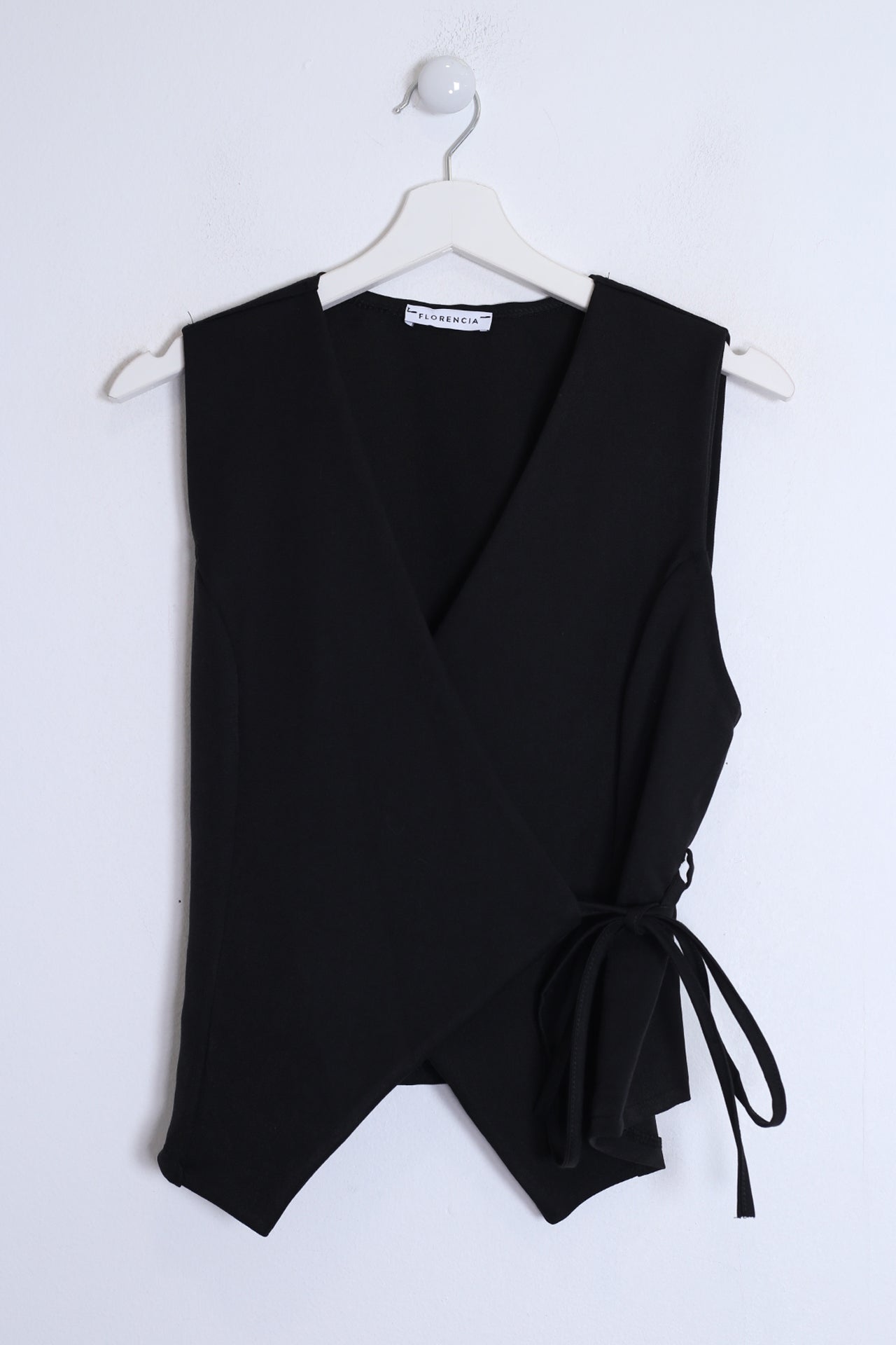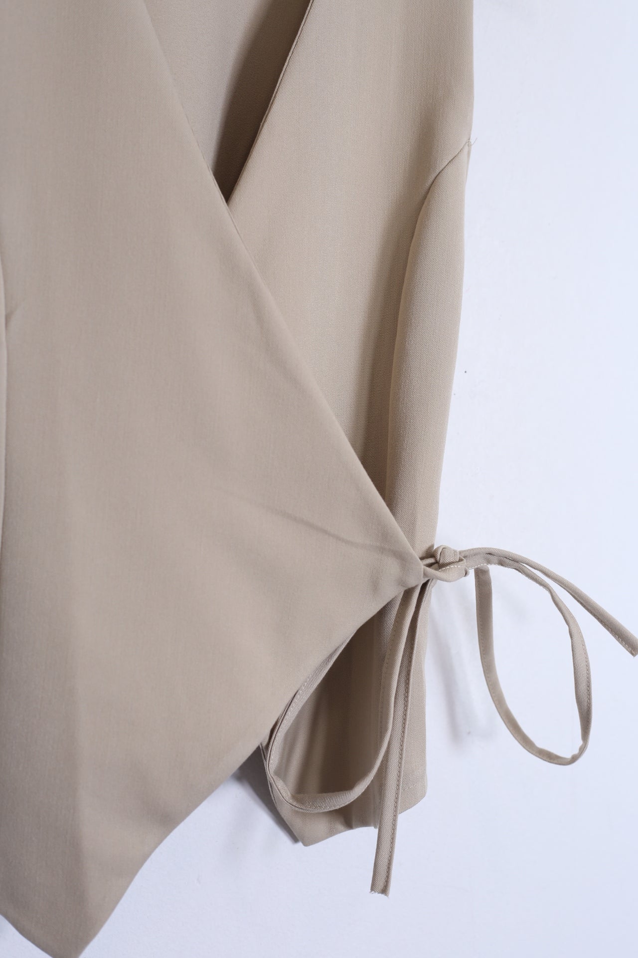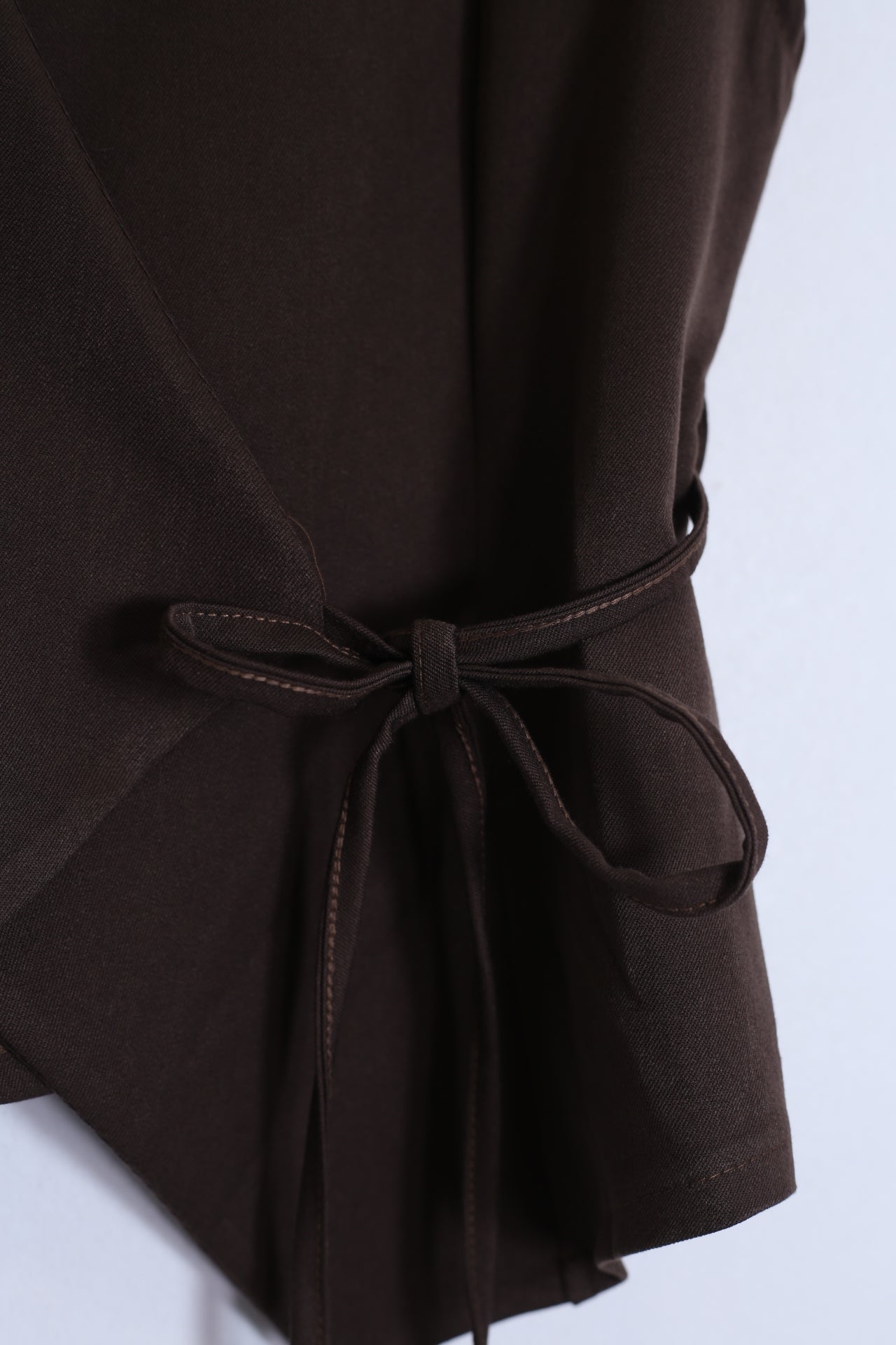 Chaleco con escote en punta cruzado. Cierre en forma de cordón anudado. Bajo asimétrico.