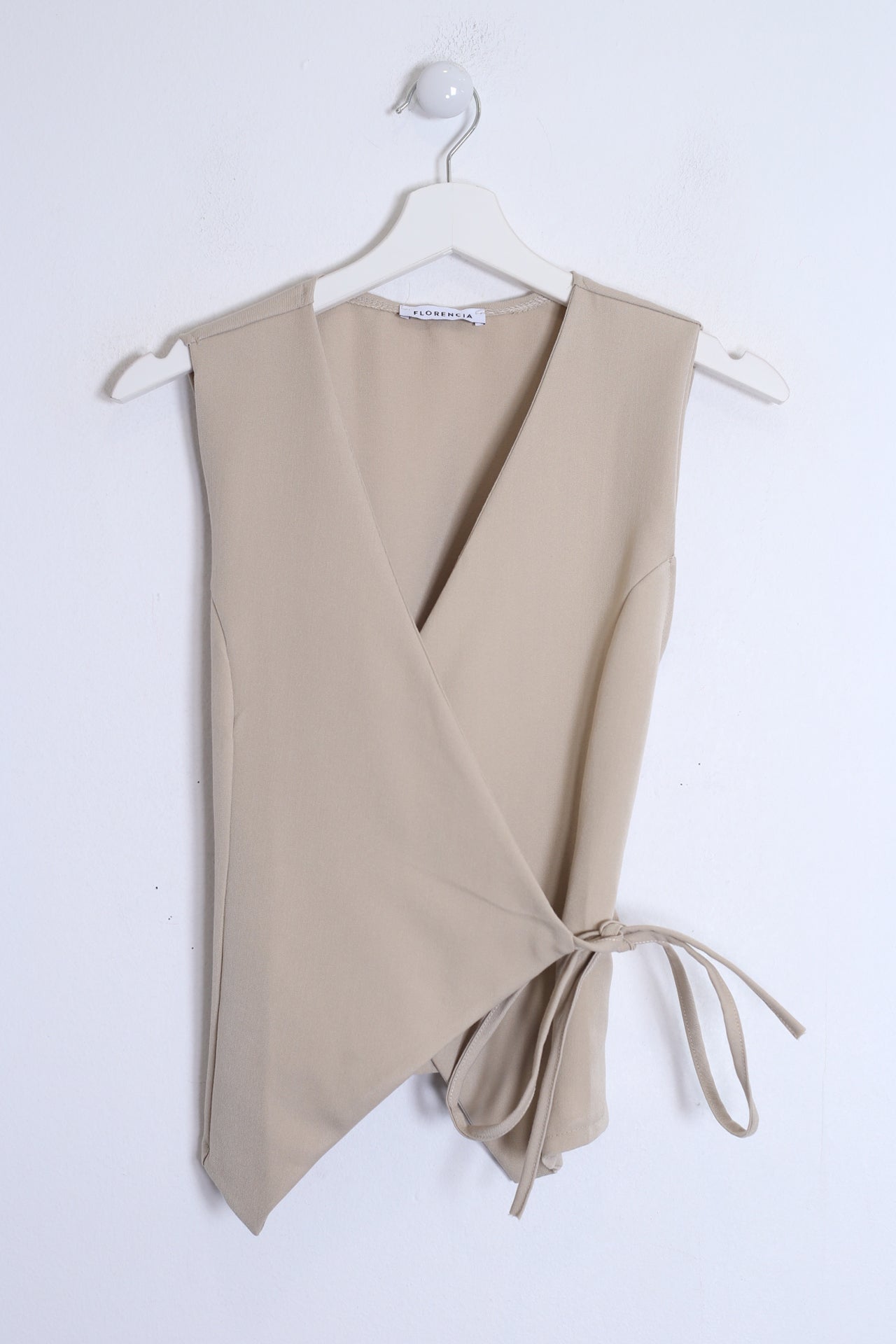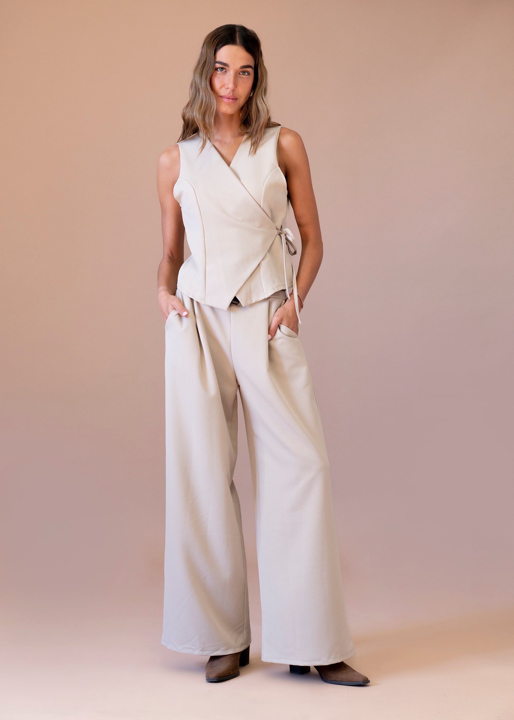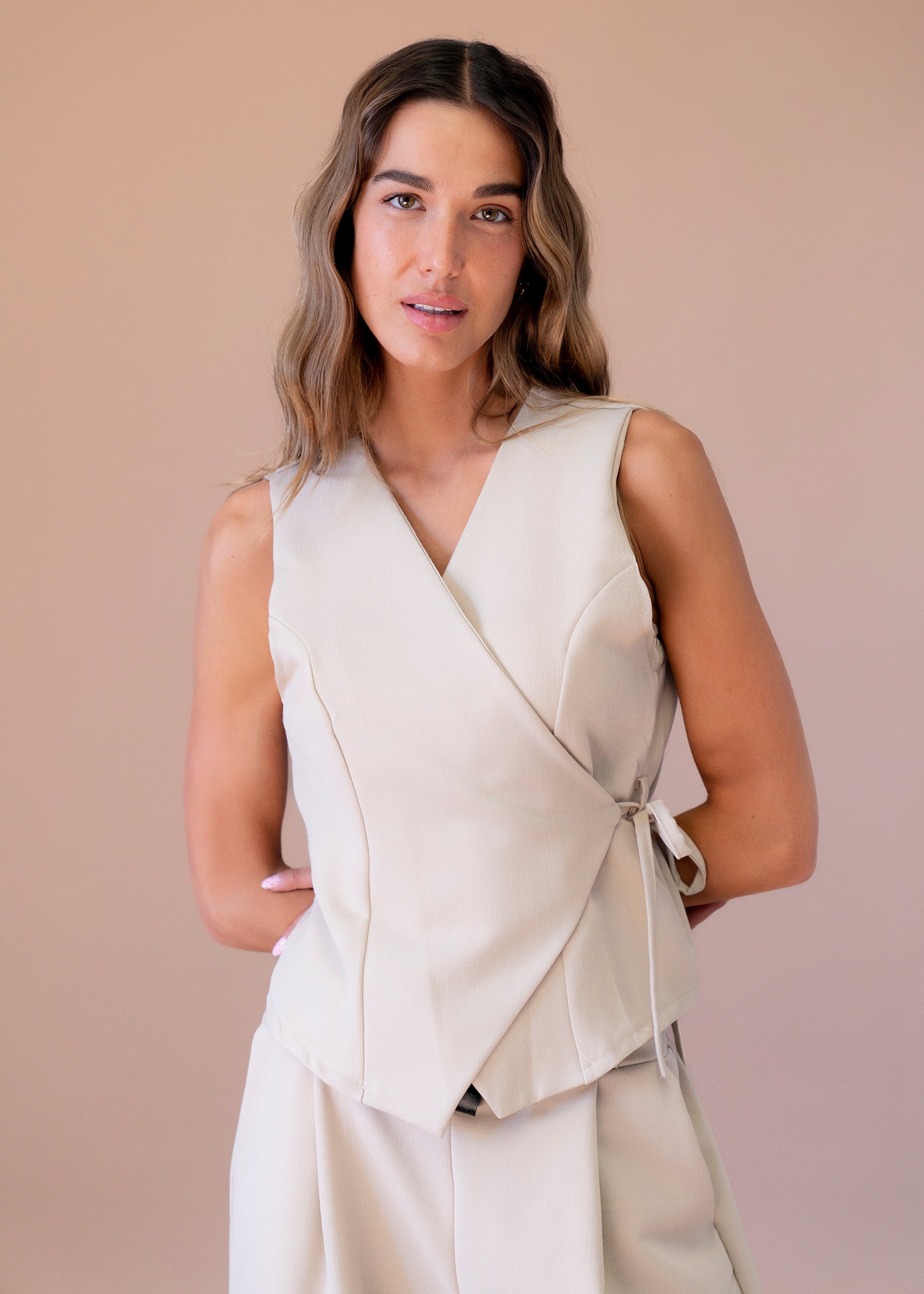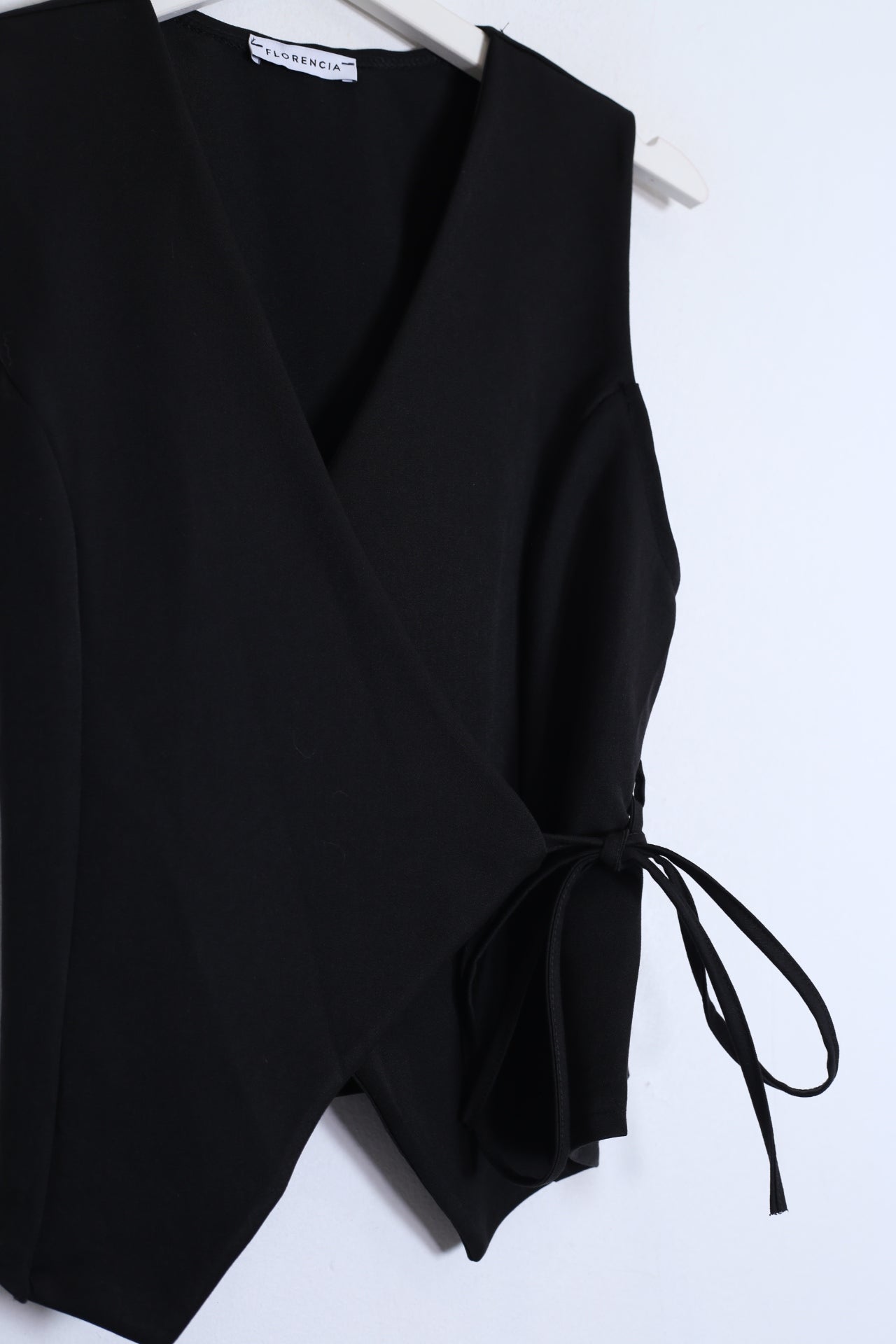 Chaleco con escote en punta cruzado. Cierre en forma de cordón anudado. Bajo asimétrico.
