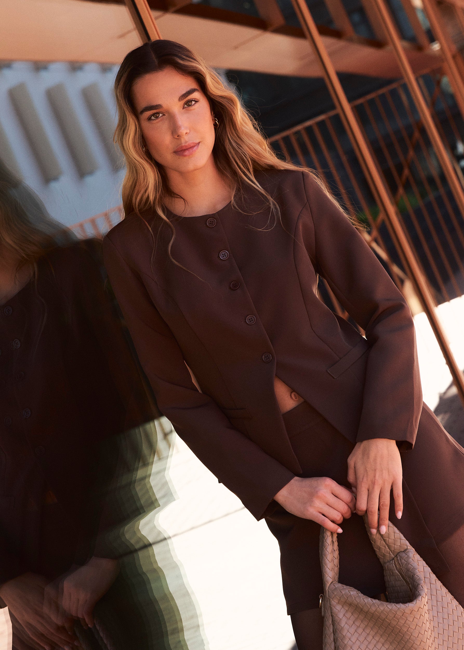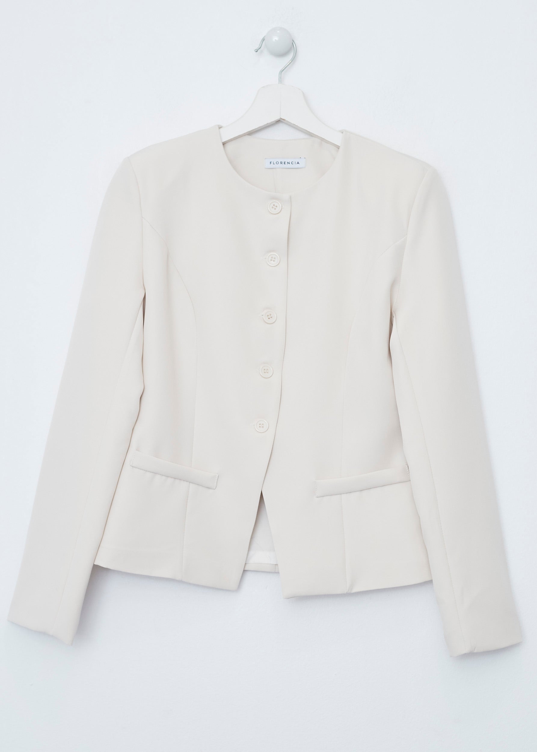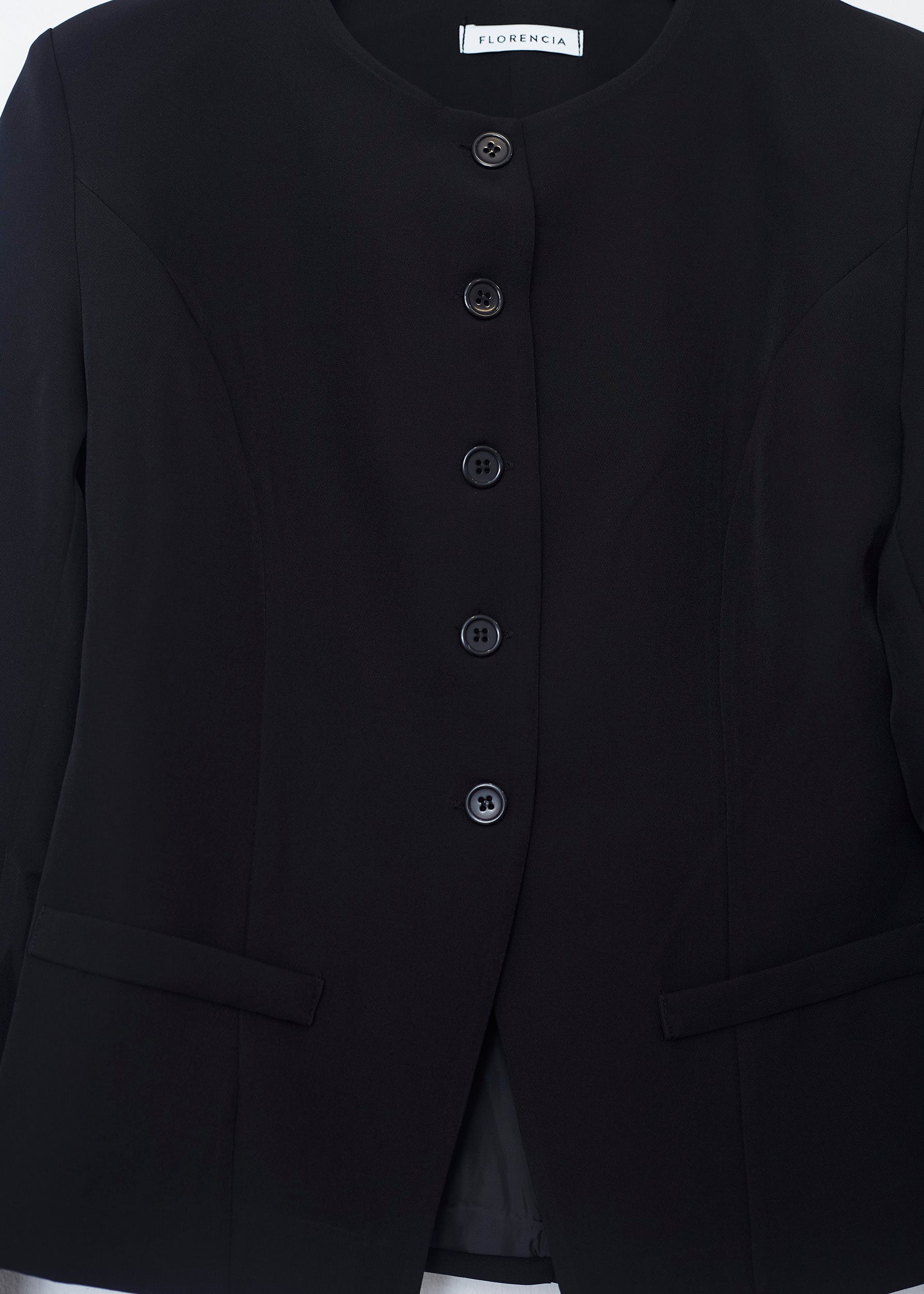 Fitted blazer with round neckline and long sleeves. Front button closure. False welt pockets detail at the back. Inner lining.