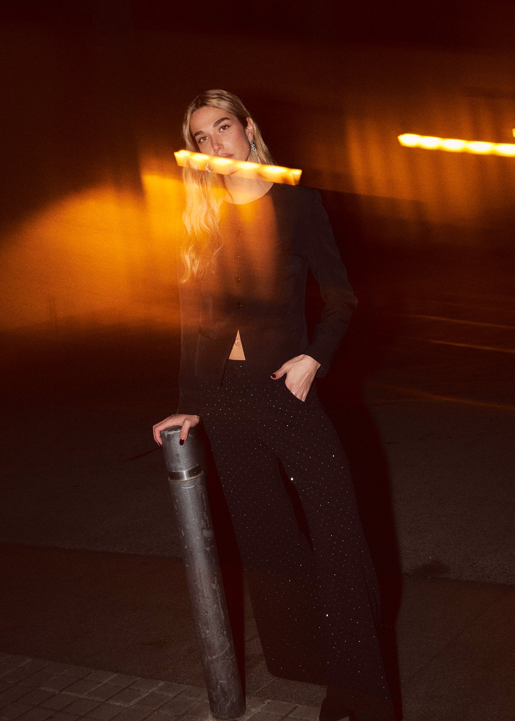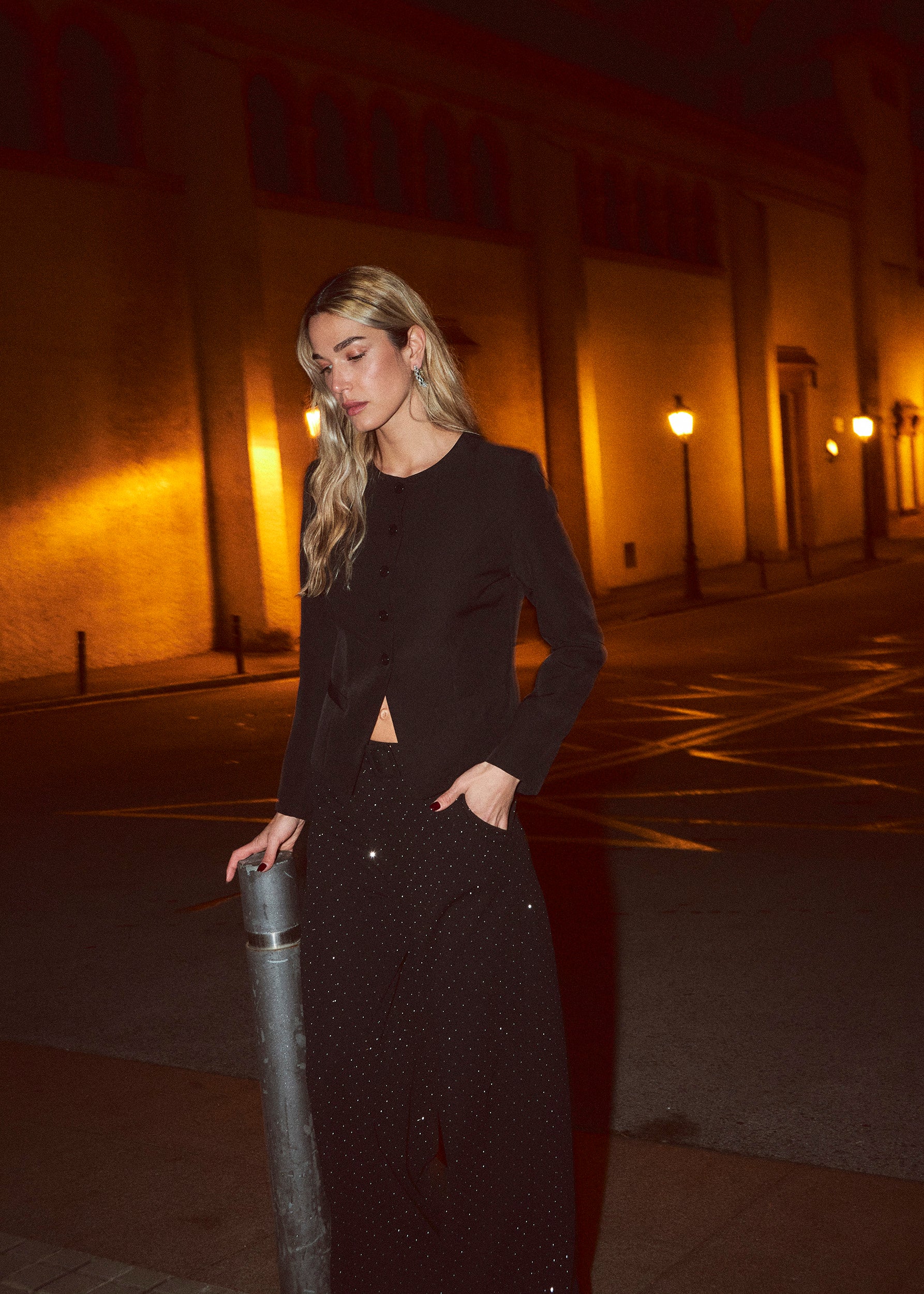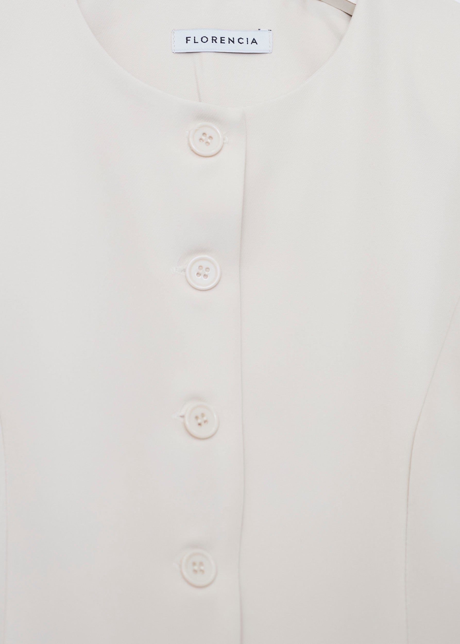 Fitted blazer with round neckline and long sleeves. Front button closure. False welt pockets detail at the back. Inner lining.