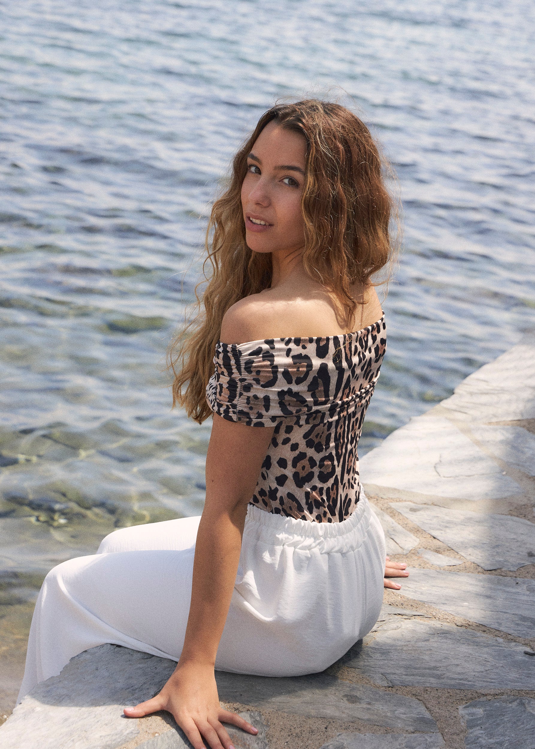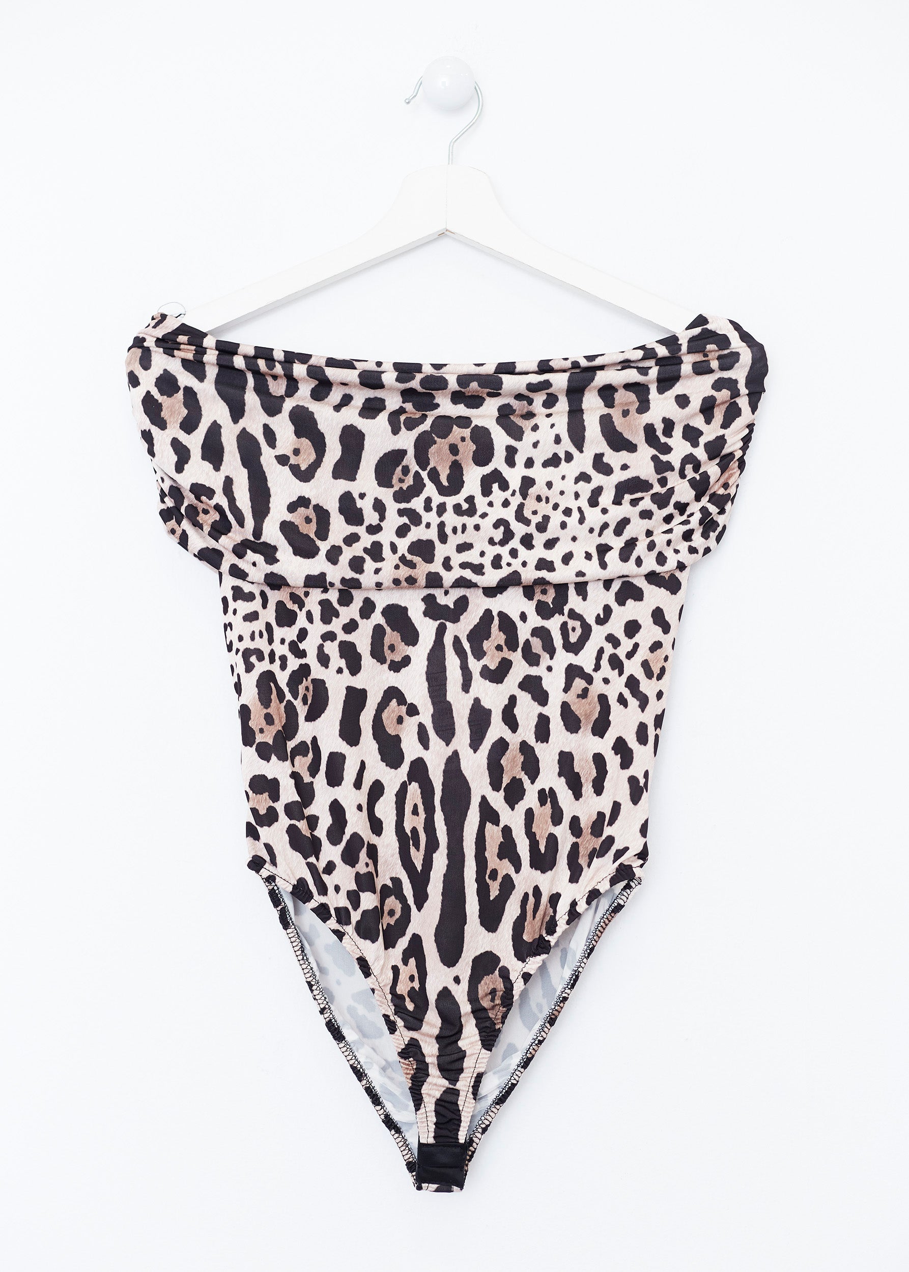 Bodysuit with a straight neckline finished in a turn, bare shoulders and sleeveless. Animal Print.