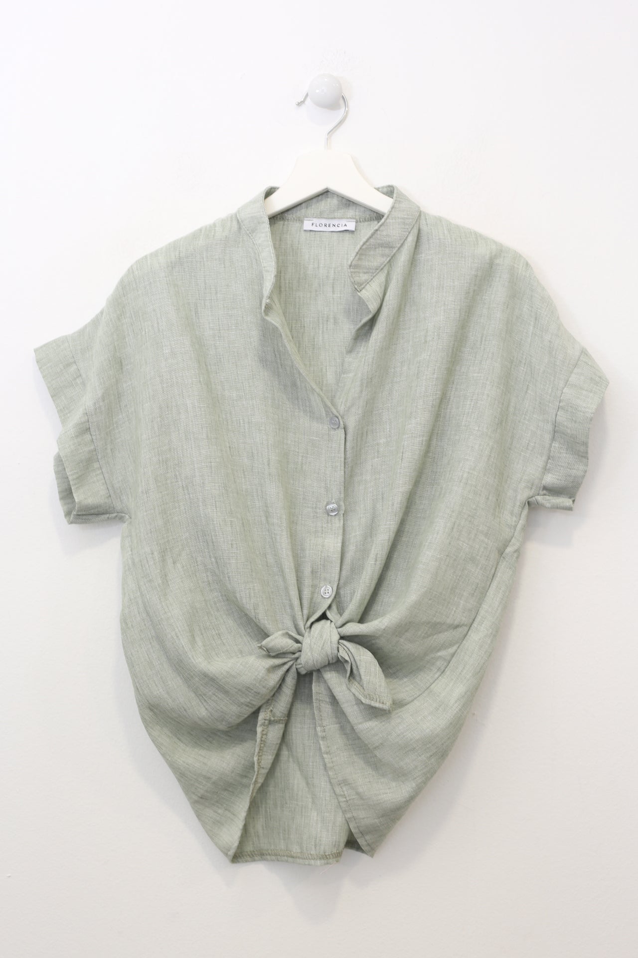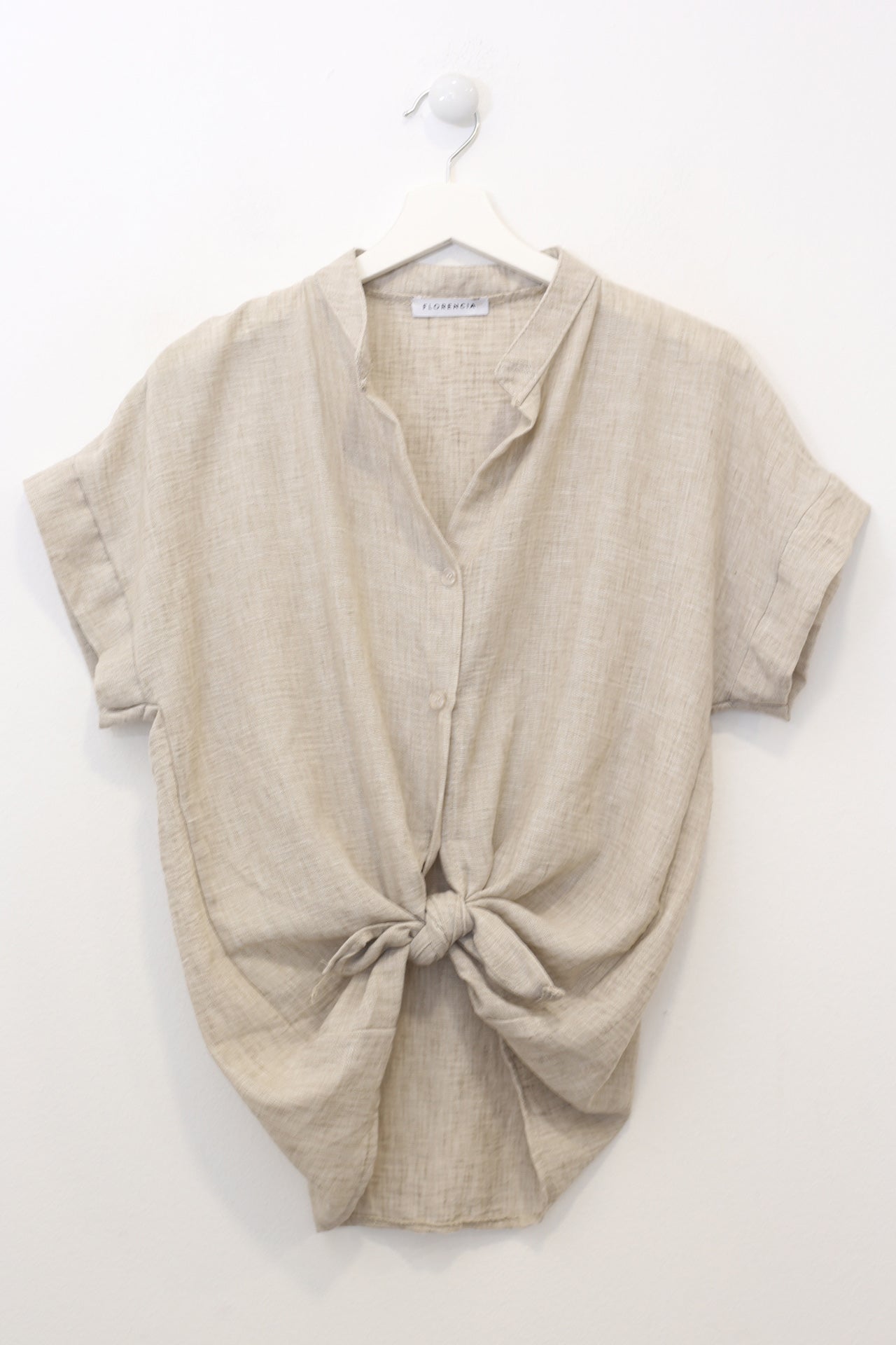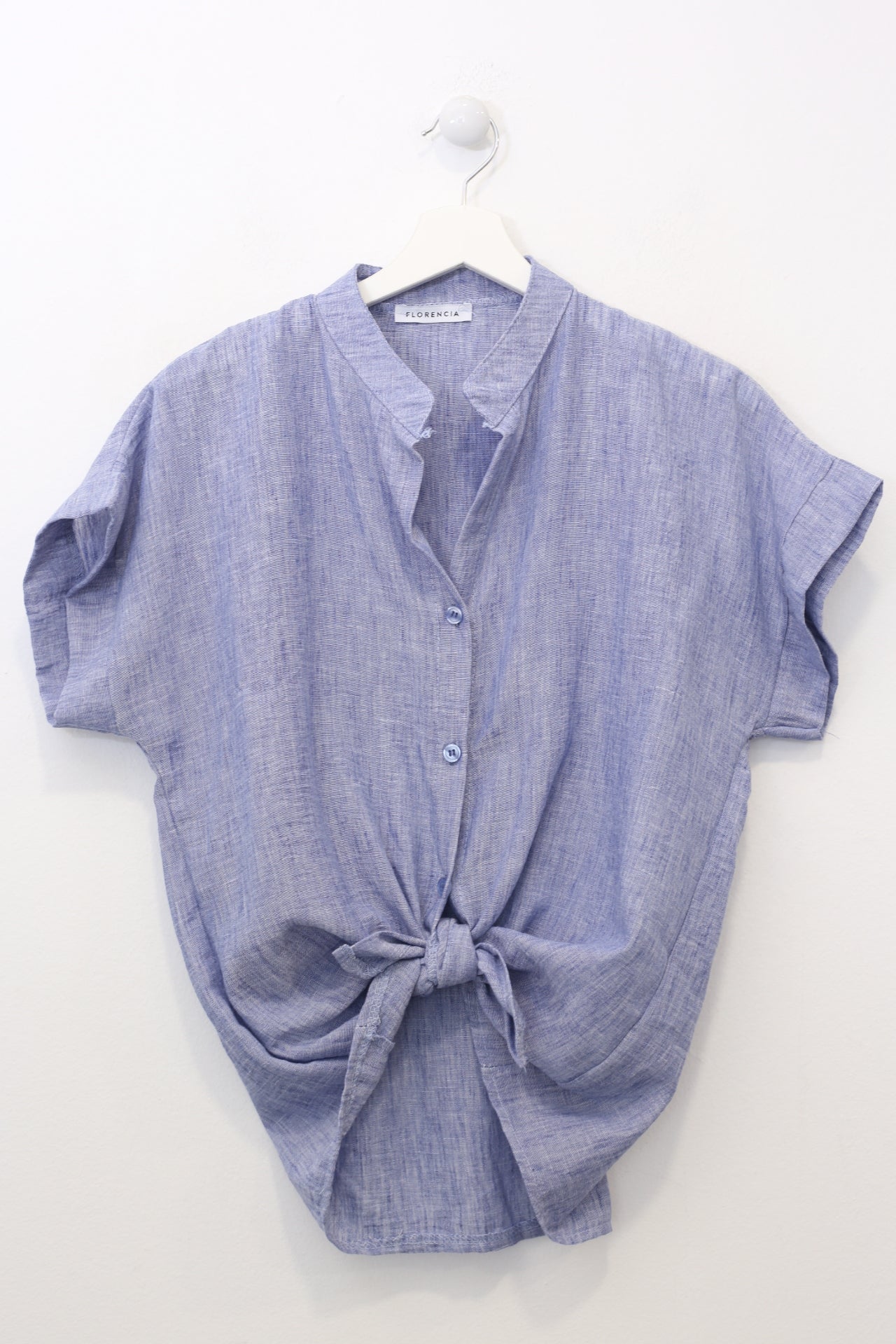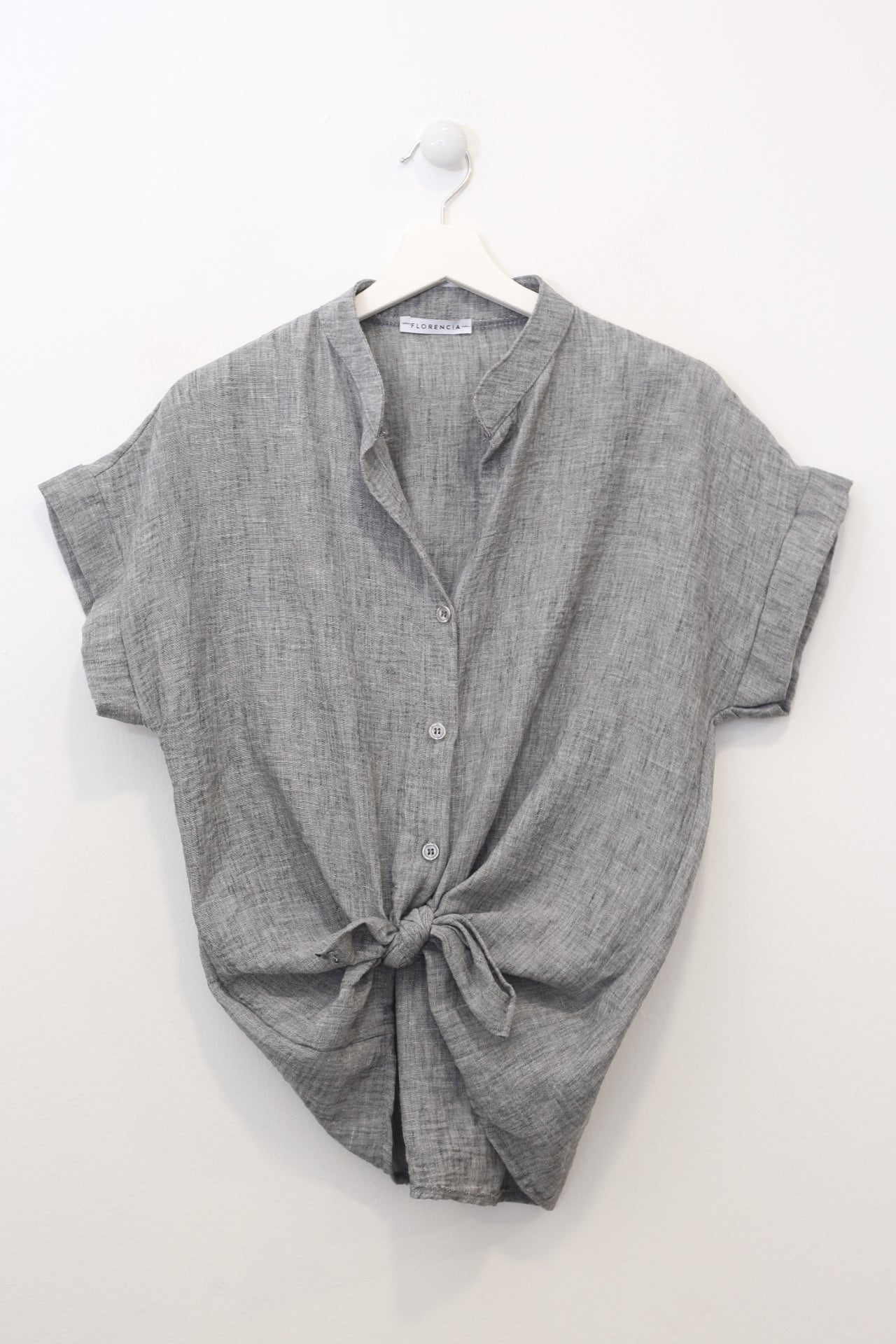 Blusa con cuello mao y manga corta. Cierre frontal abotonado y detalle de nudo en el bajo. Corte holgado.