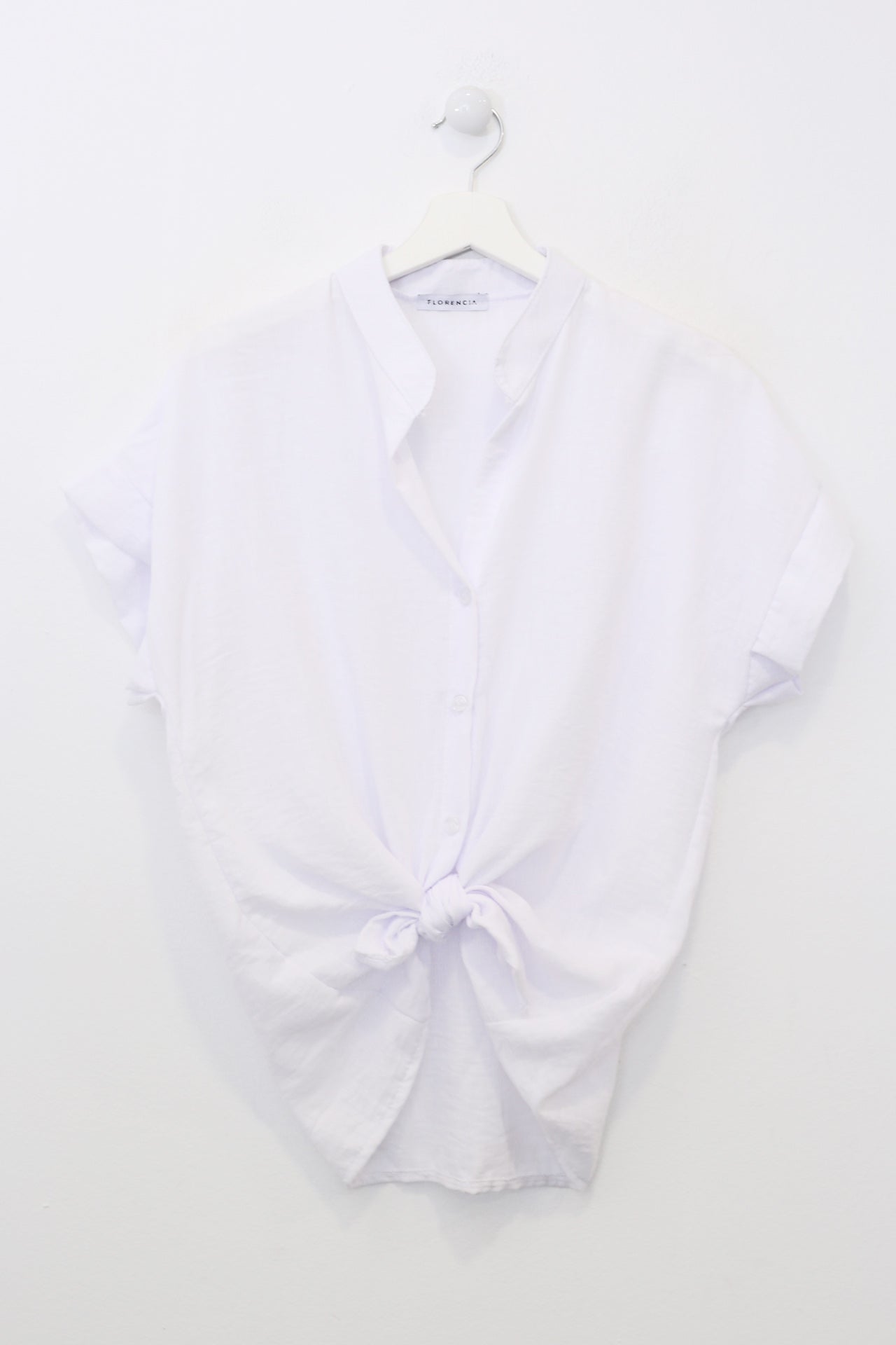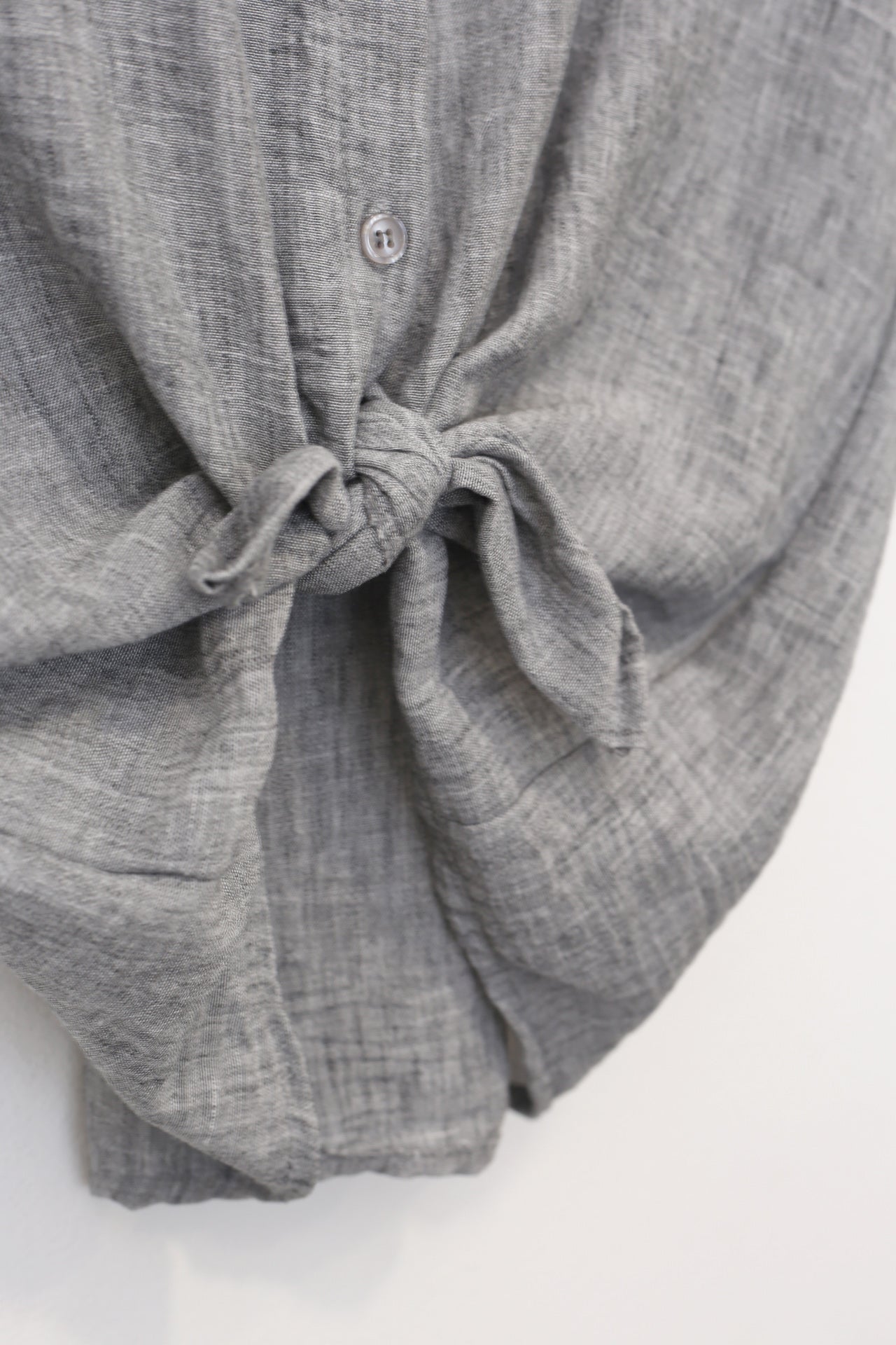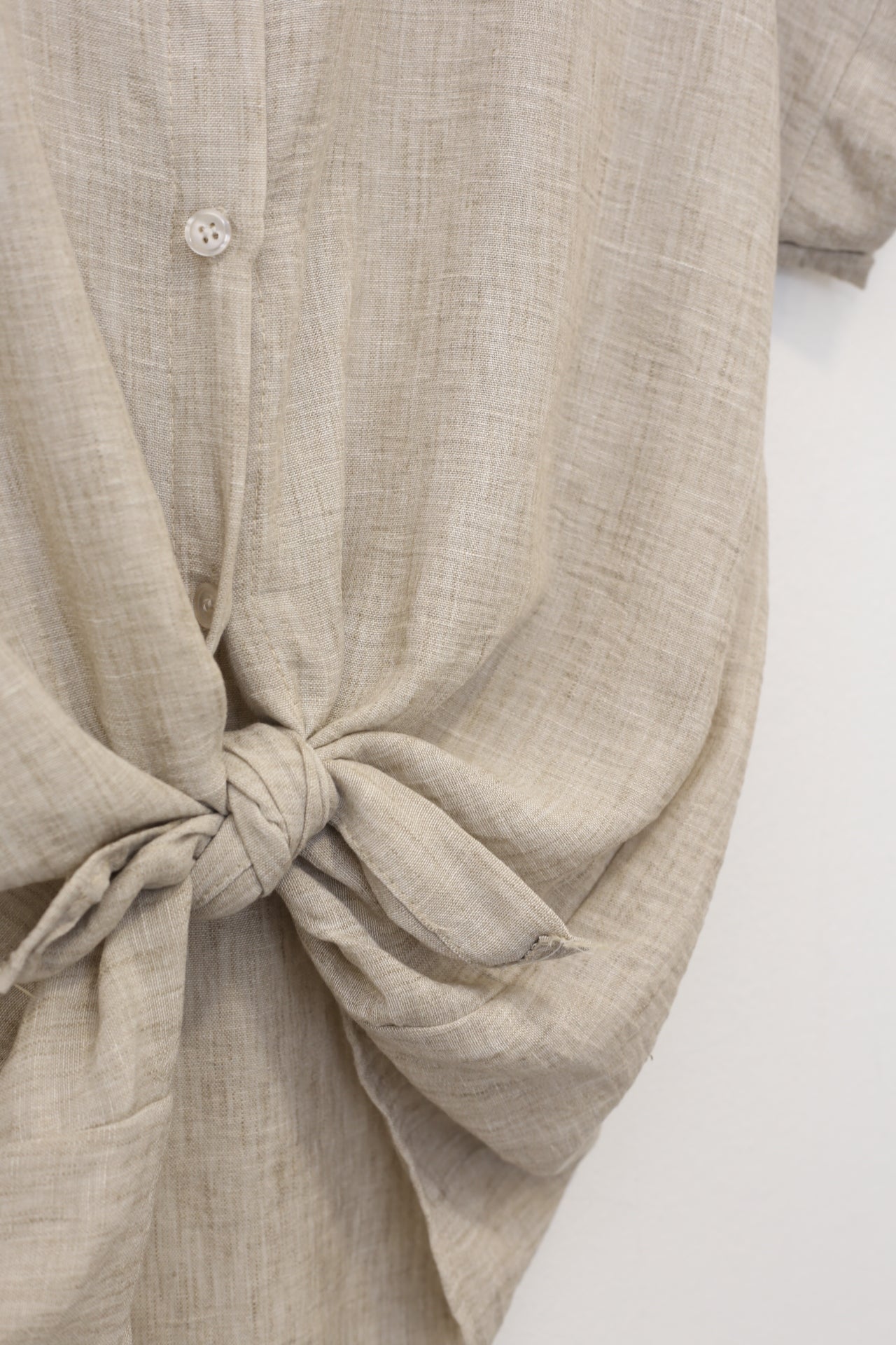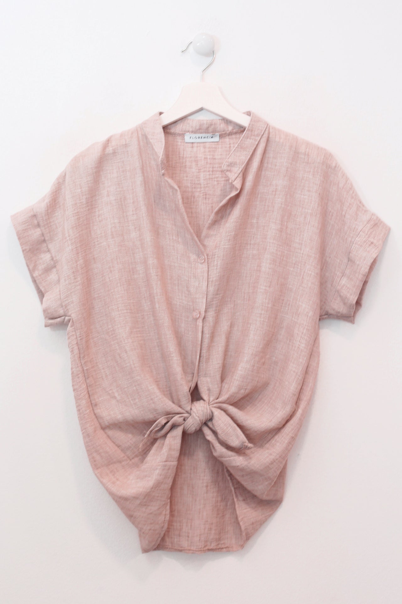 Blusa con cuello mao y manga corta. Cierre frontal abotonado y detalle de nudo en el bajo. Corte holgado.