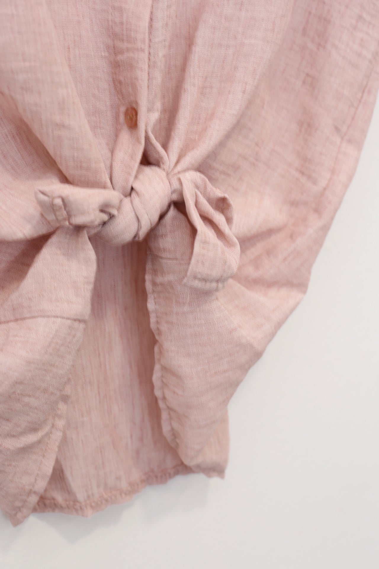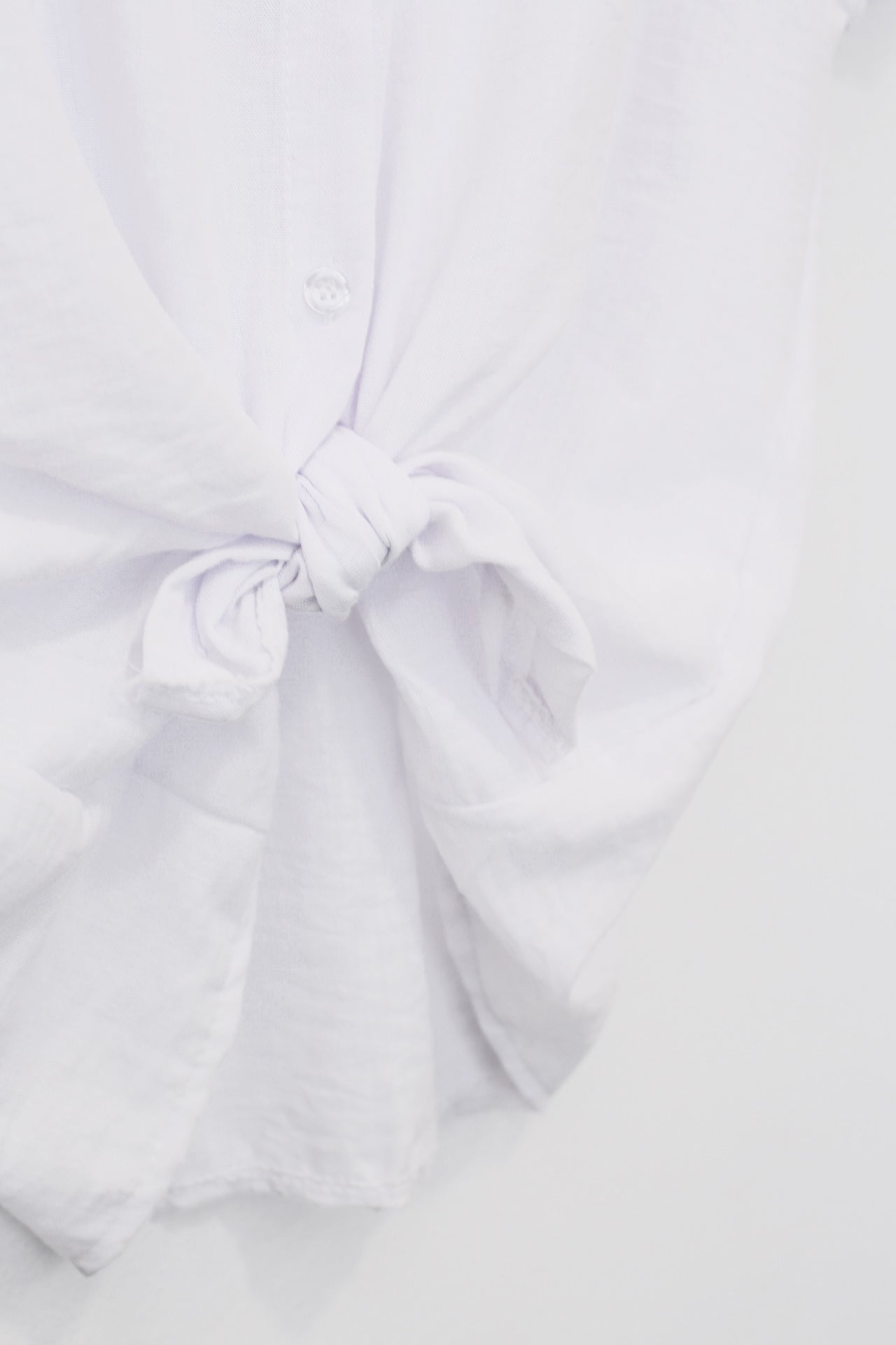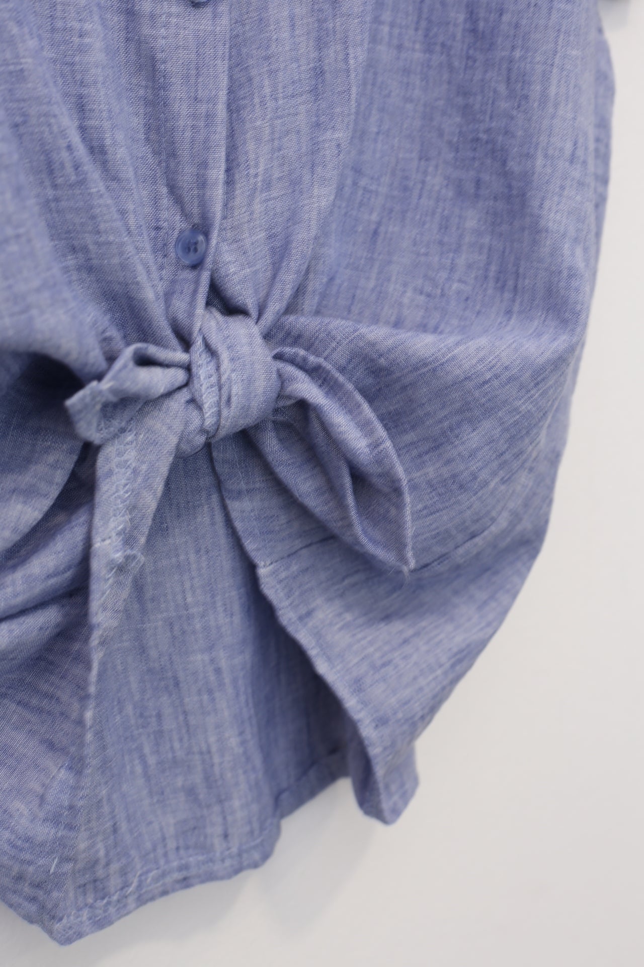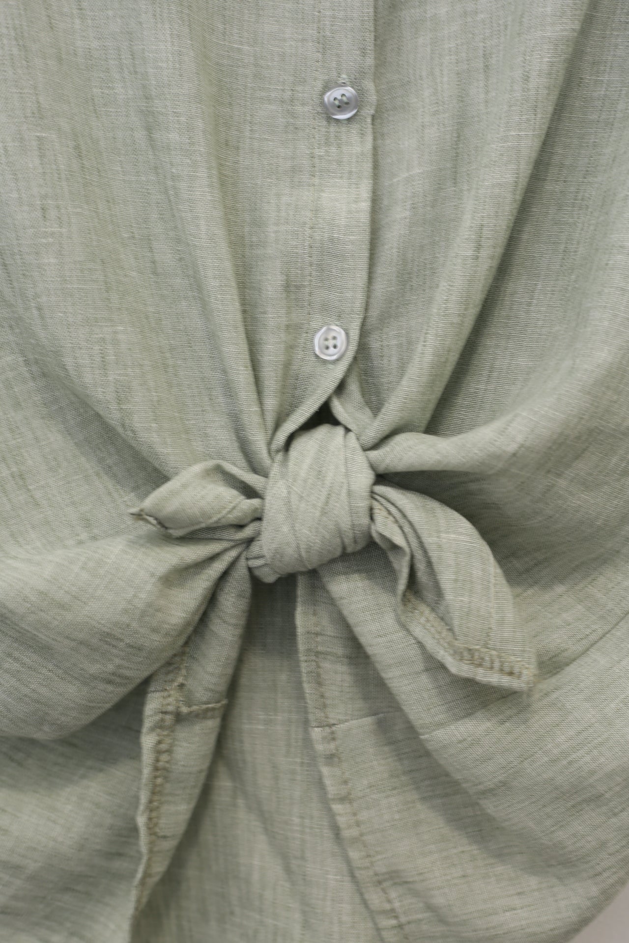 Blusa con cuello mao y manga corta. Cierre frontal abotonado y detalle de nudo en el bajo. Corte holgado.