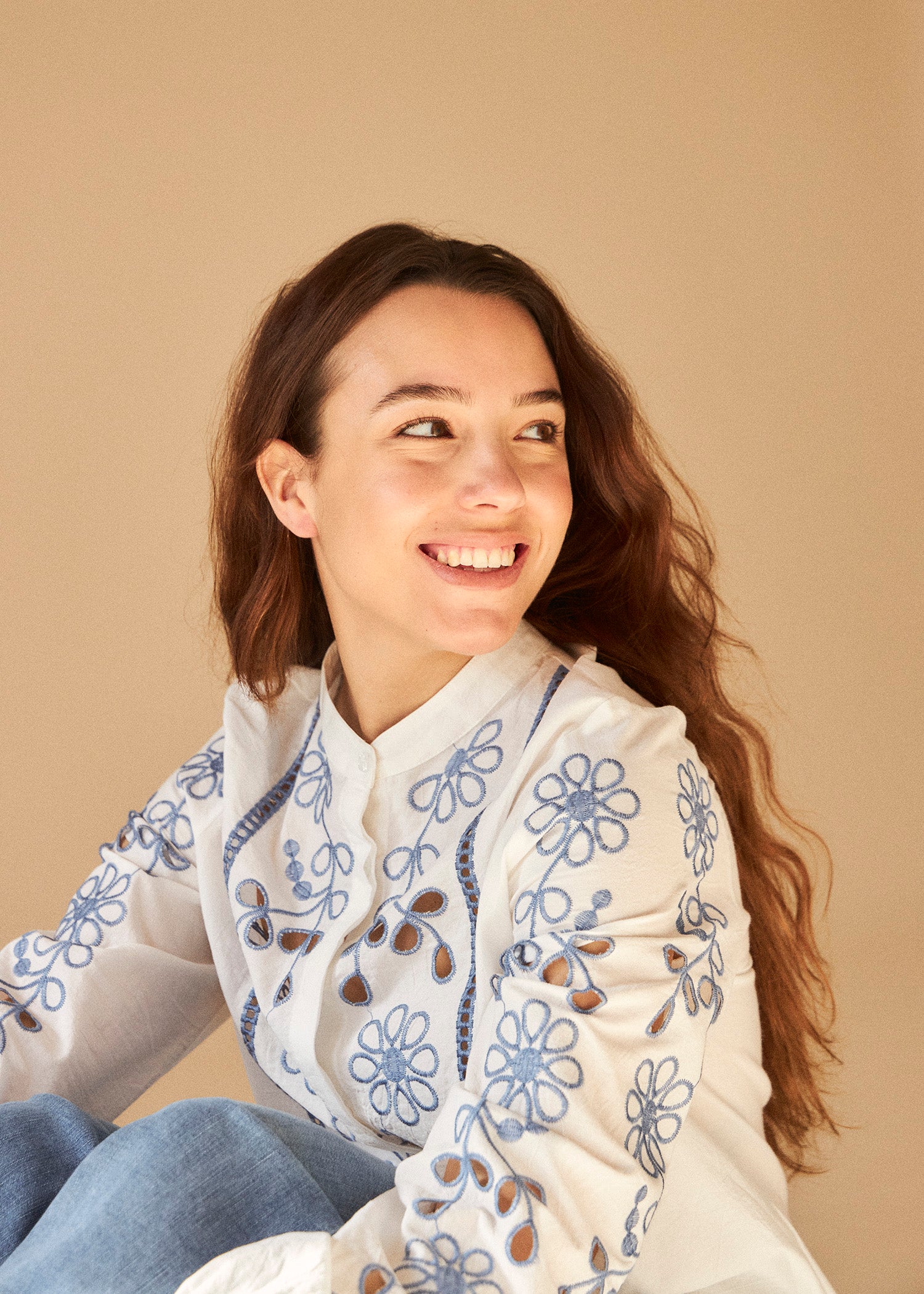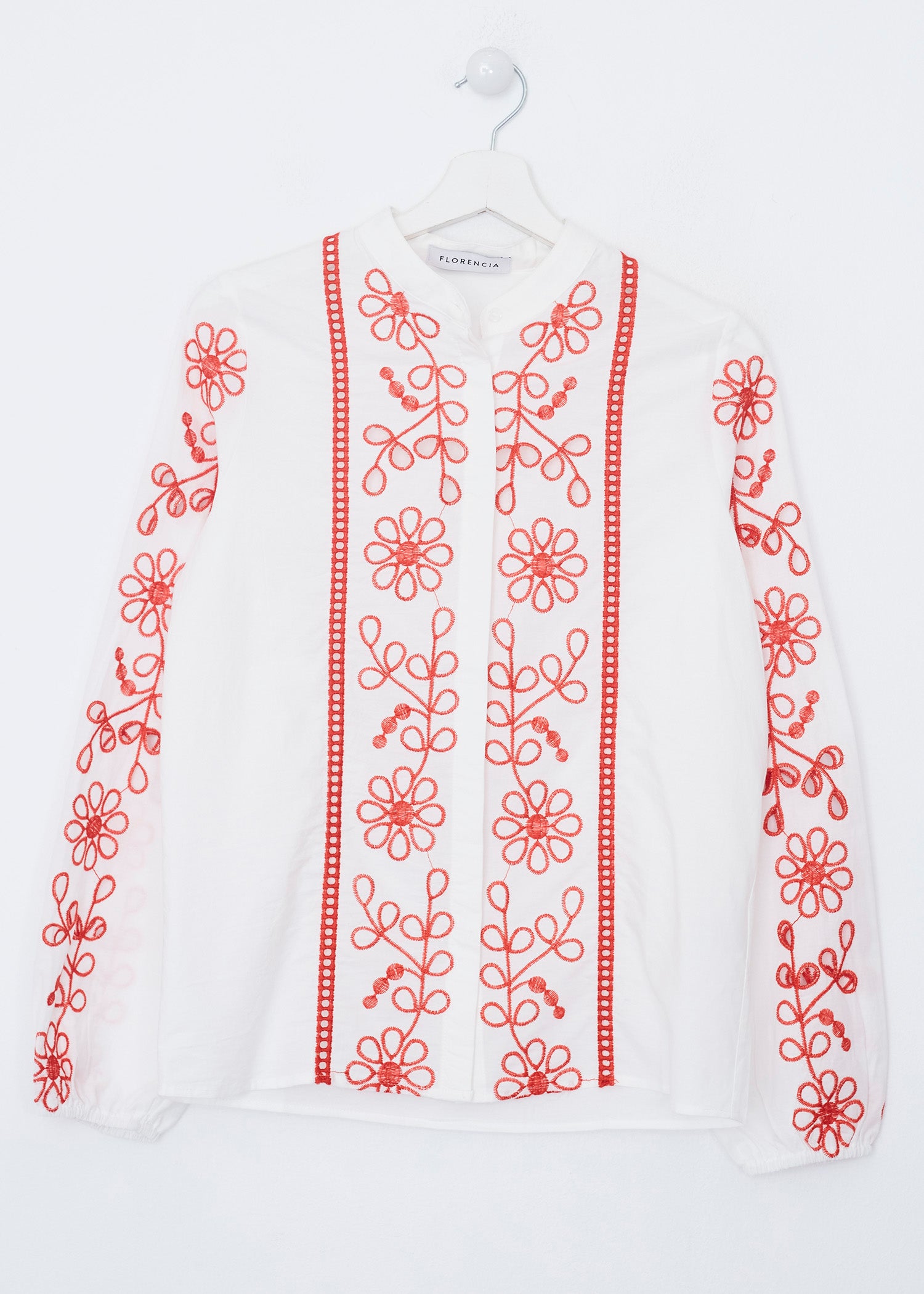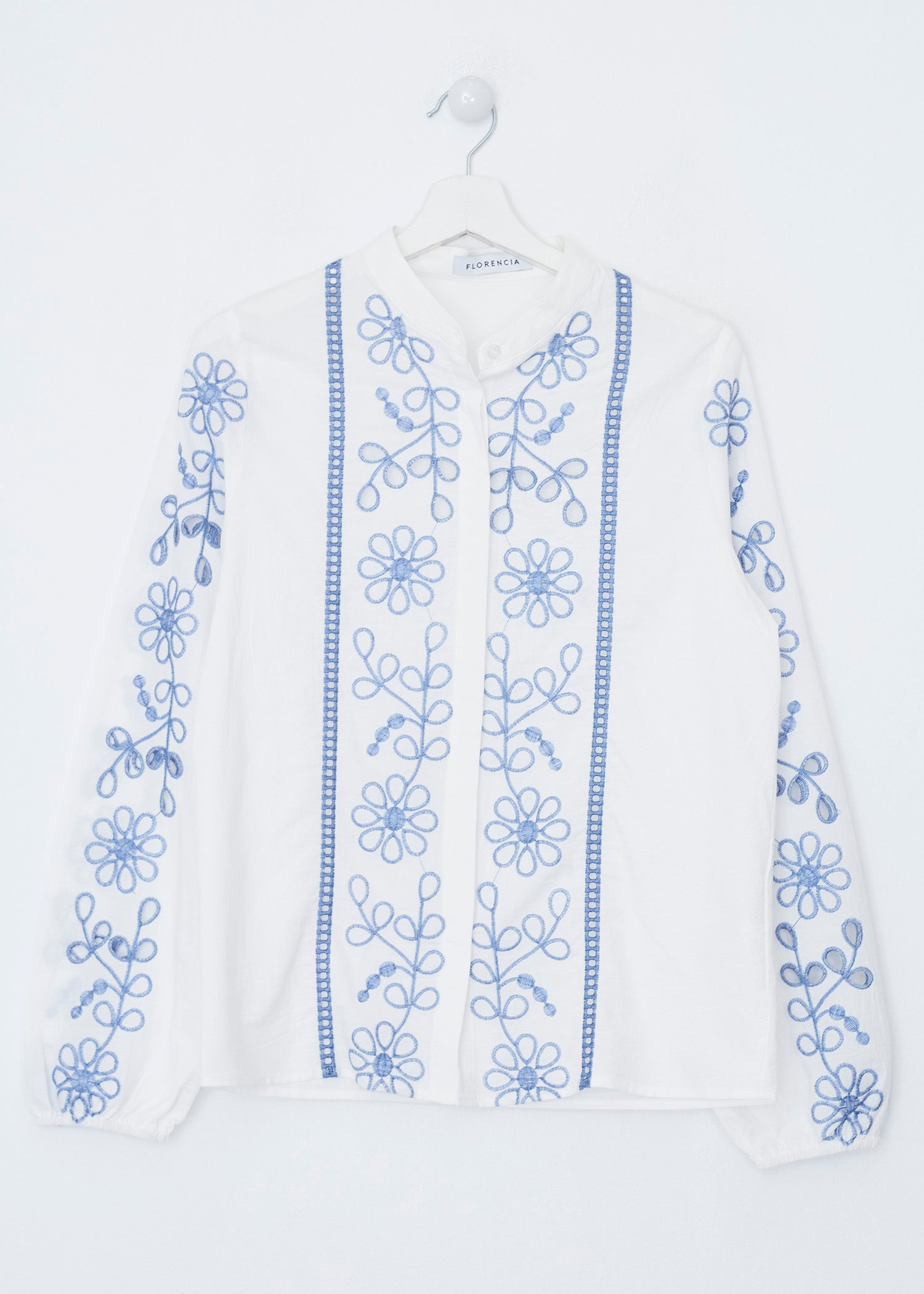 Camisa con cuello mao y manga larga acabada en puño elástico. Cierre frontal abotonado. Detalle de bordados a contraste y perforados.