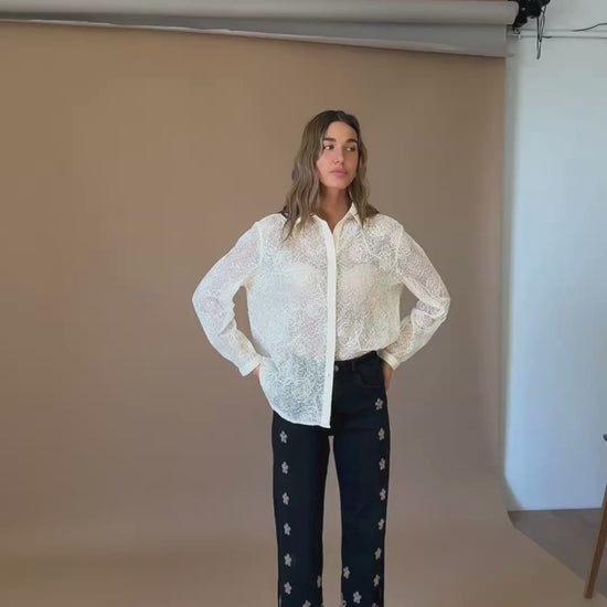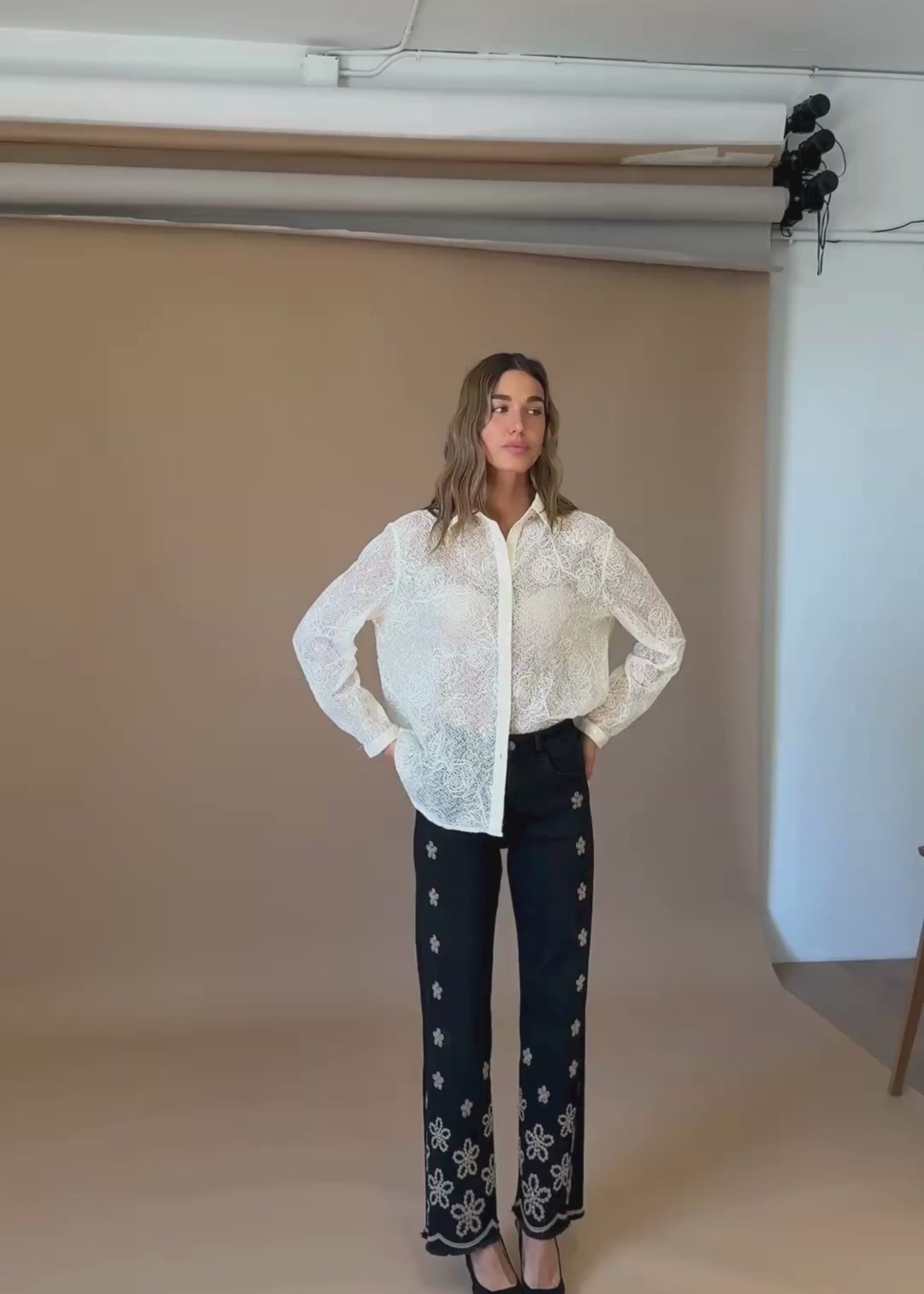 Camisa con cuello solapa y manga larga acabada en puño abotonado. Cierre frontal con botones. Tejido semi-transparente con entramado de hilo, bordados florales y aplicación de lentejuelas a tono. Bajos asimétricos.