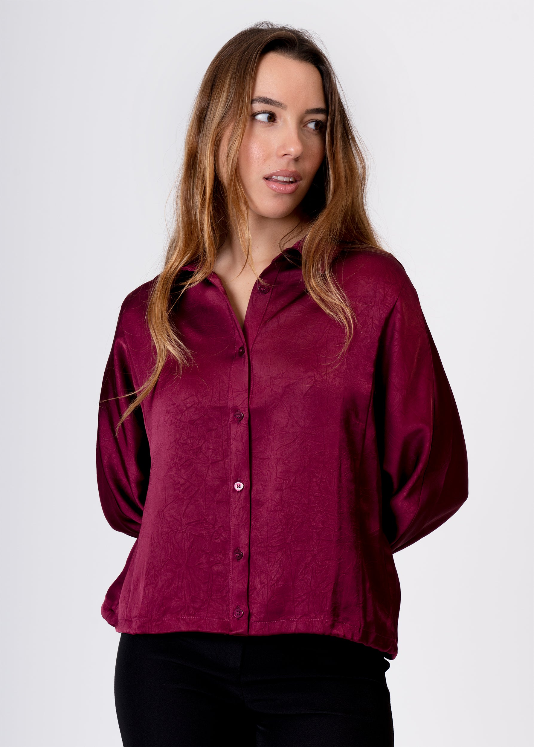 Lapel collar shirt with long sleeves and buttoned cuffs. Front button closure. Adjustable hem with hidden elastic. Loose, straight fit. Textured fabric.