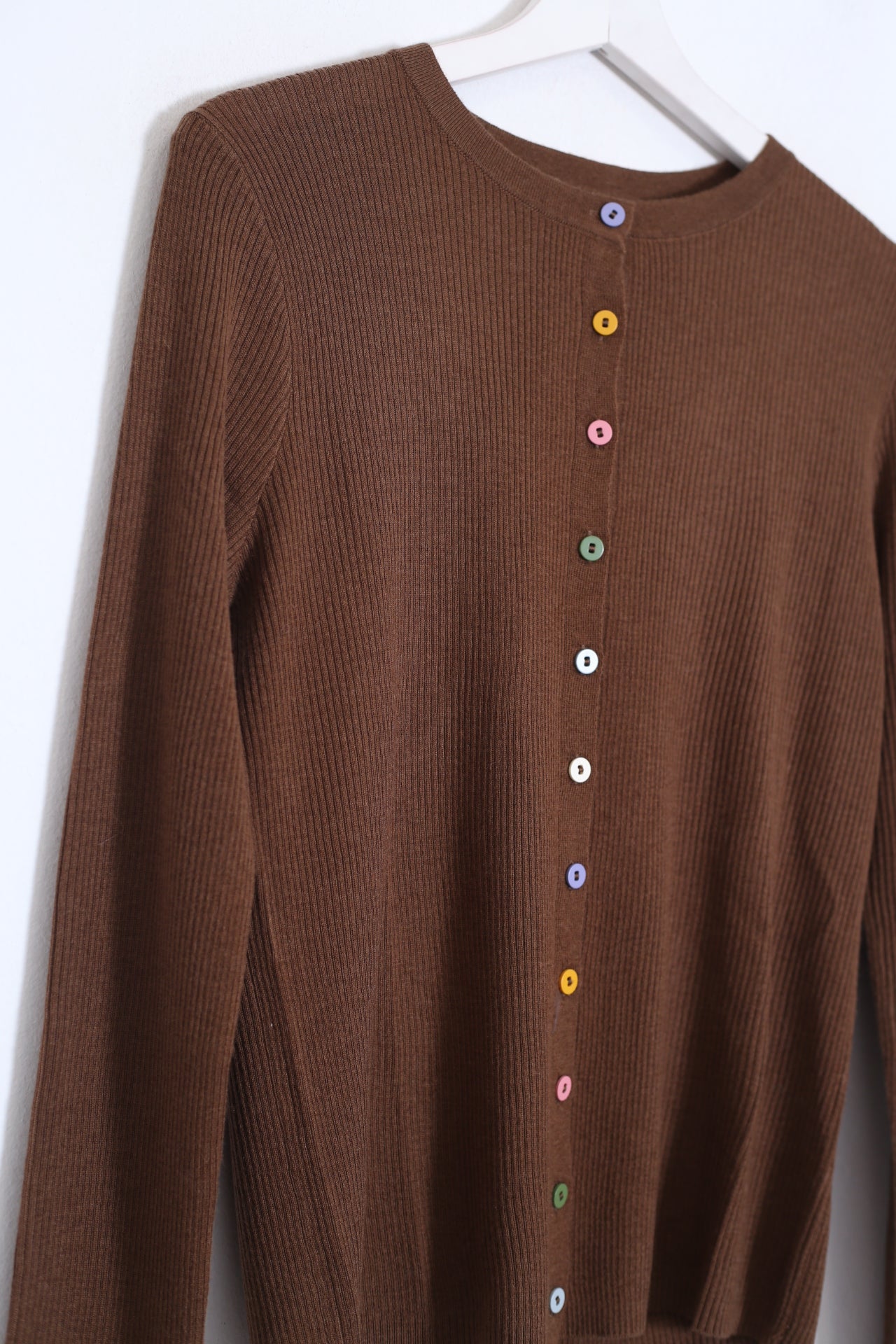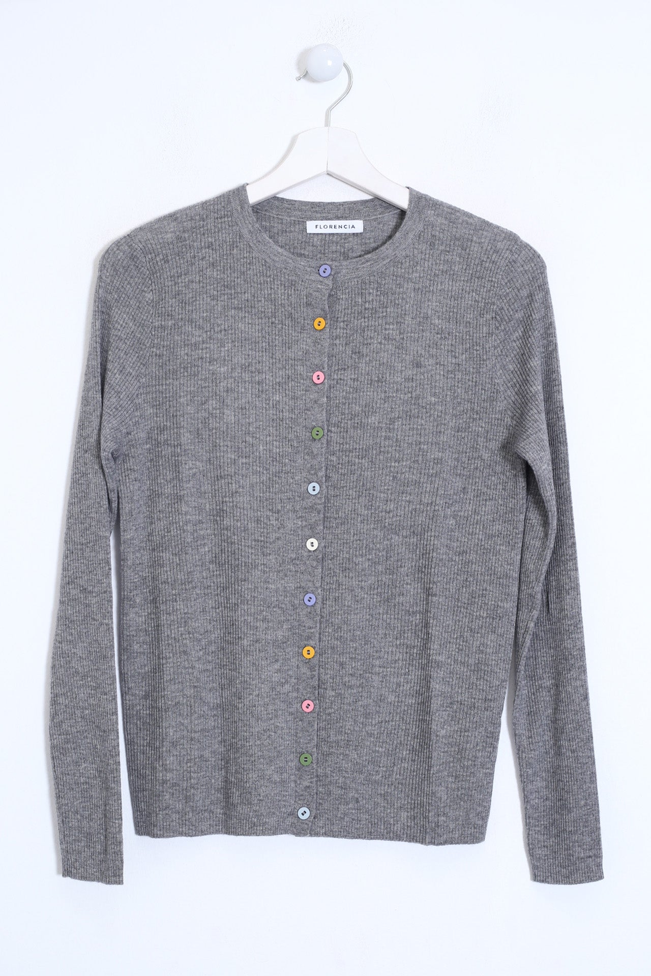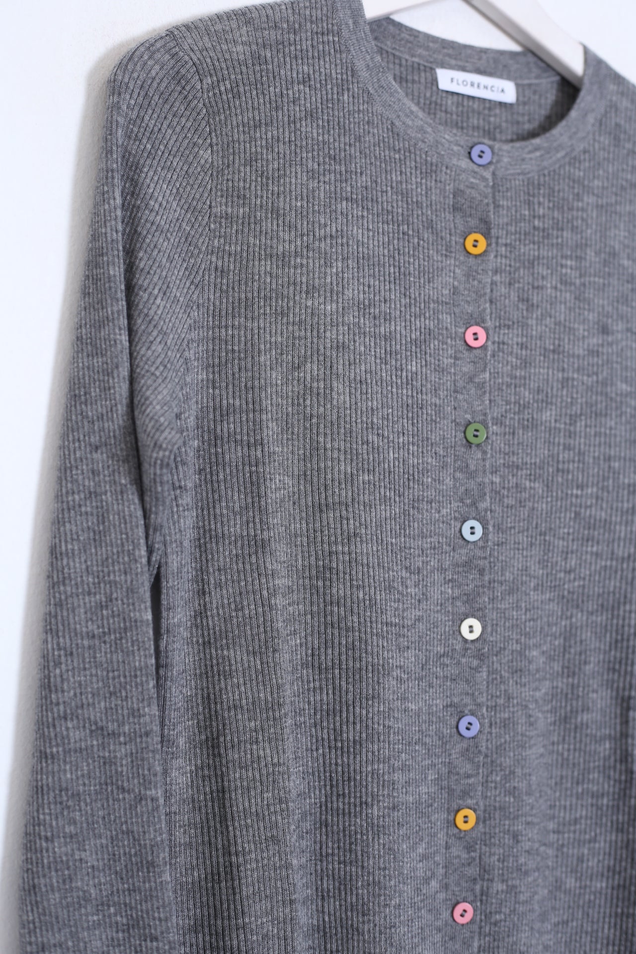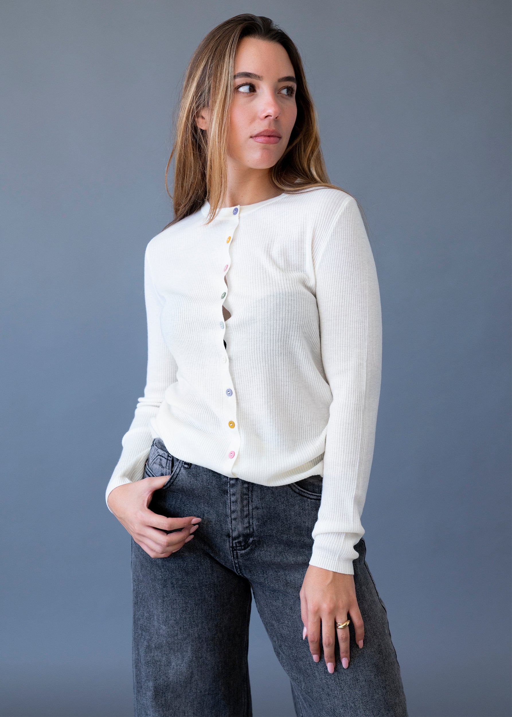 Cárdigan con cuello redondo y manga larga. Cierre frontal abotonado con botones multitono. Punto canalé.