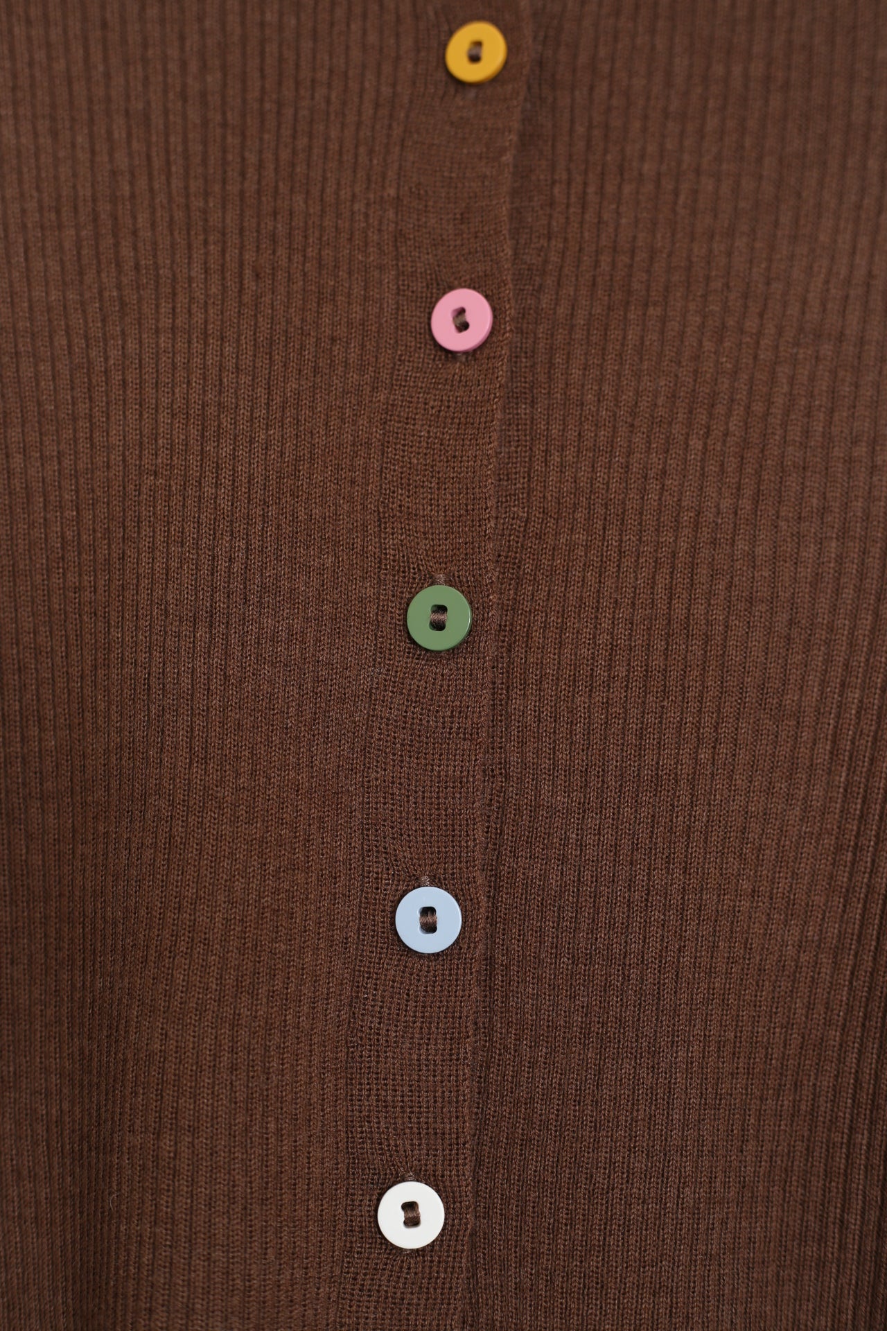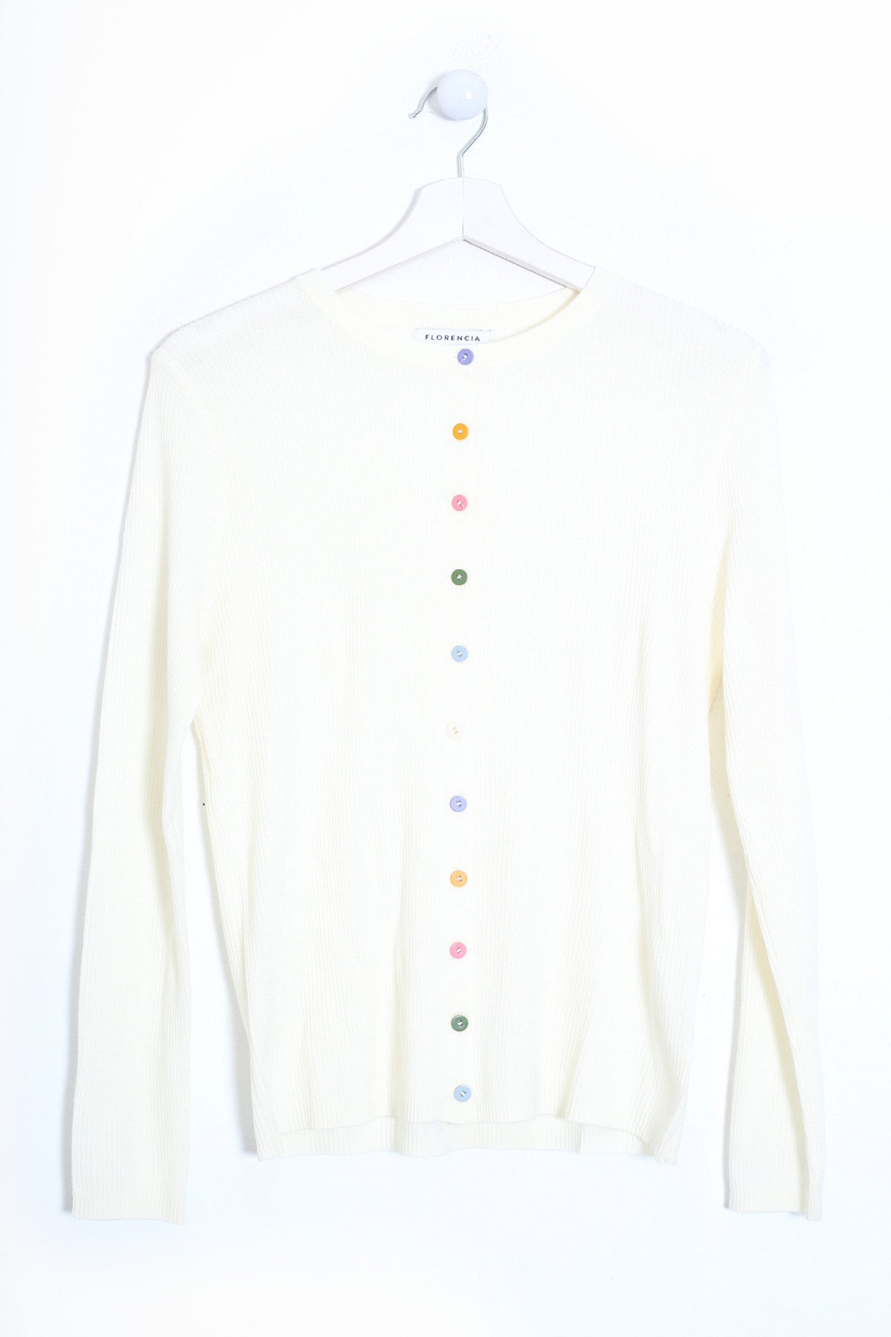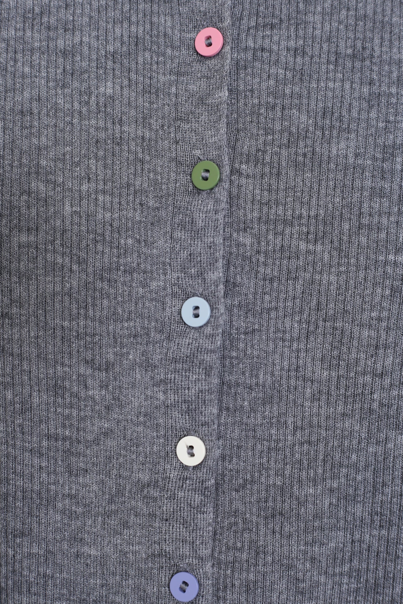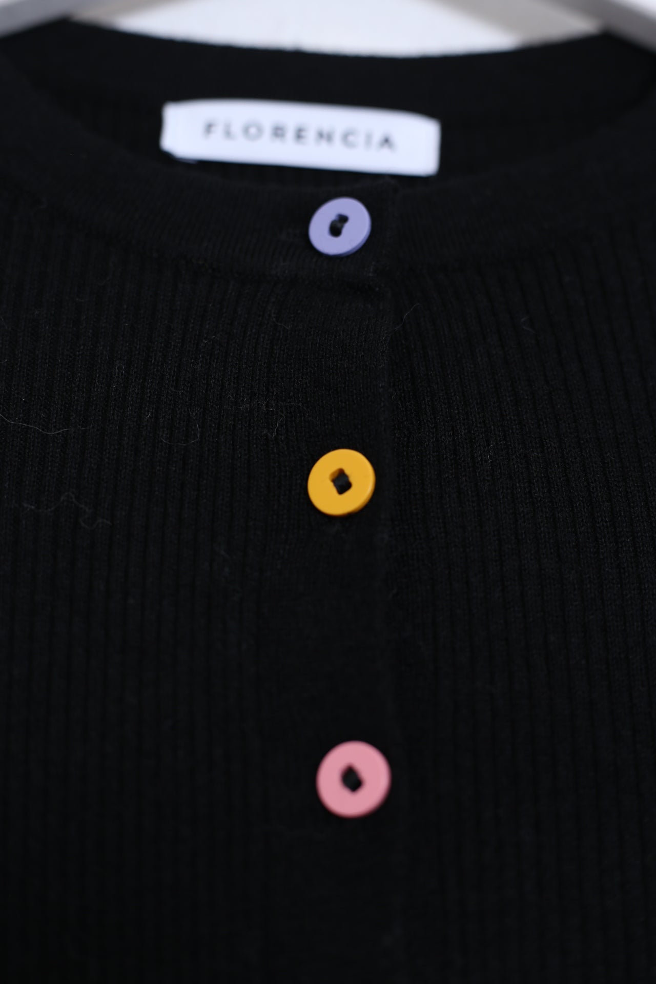 Cárdigan con cuello redondo y manga larga. Cierre frontal abotonado con botones multitono. Punto canalé.