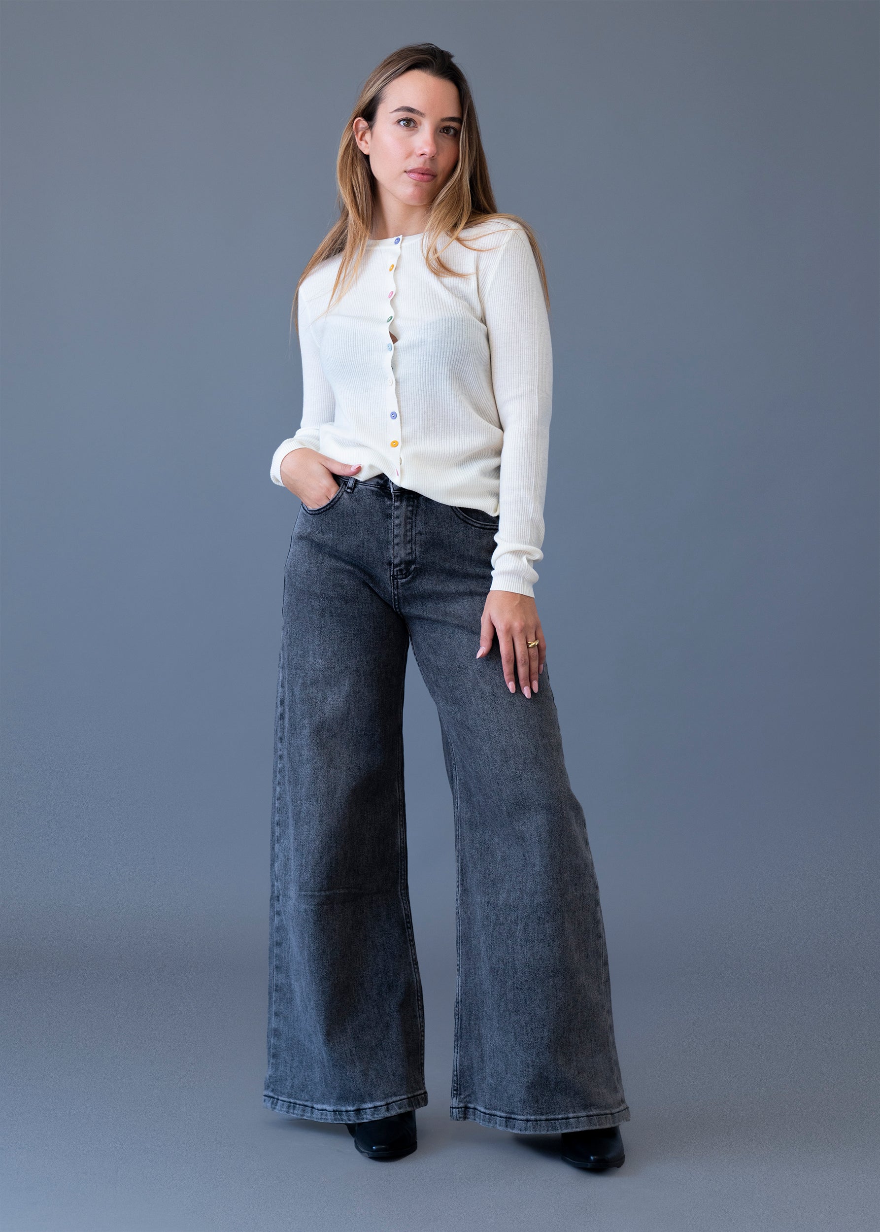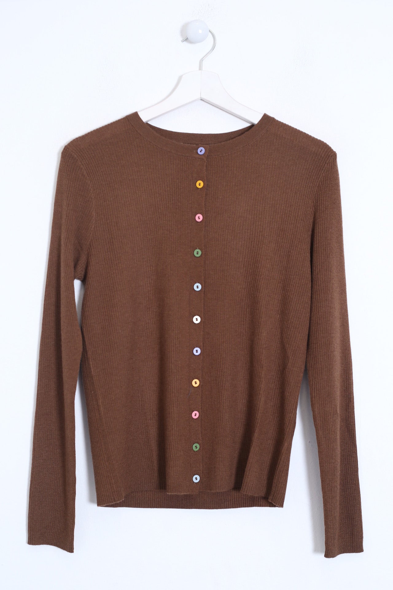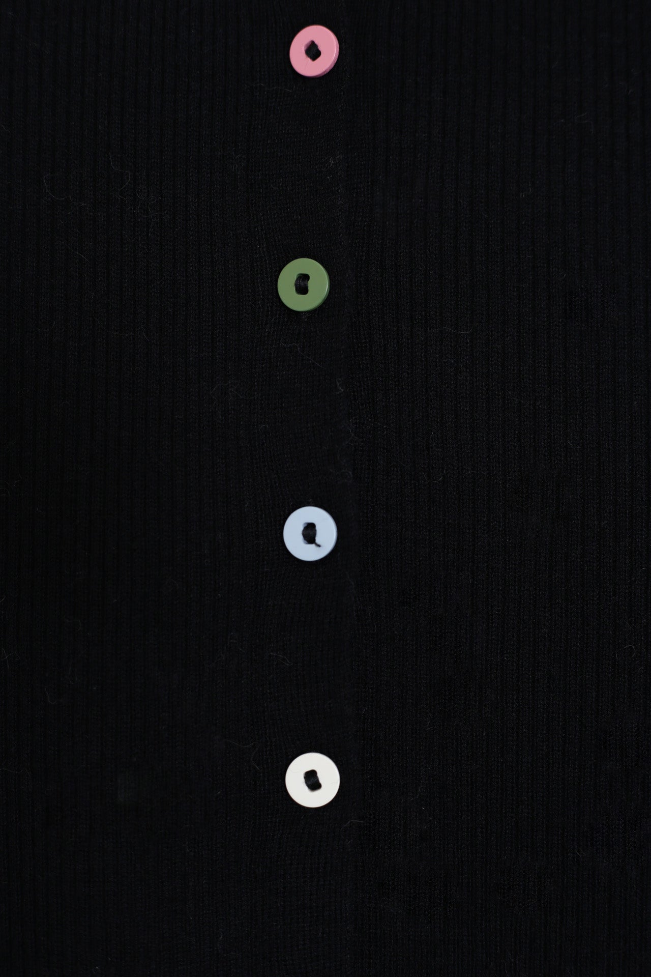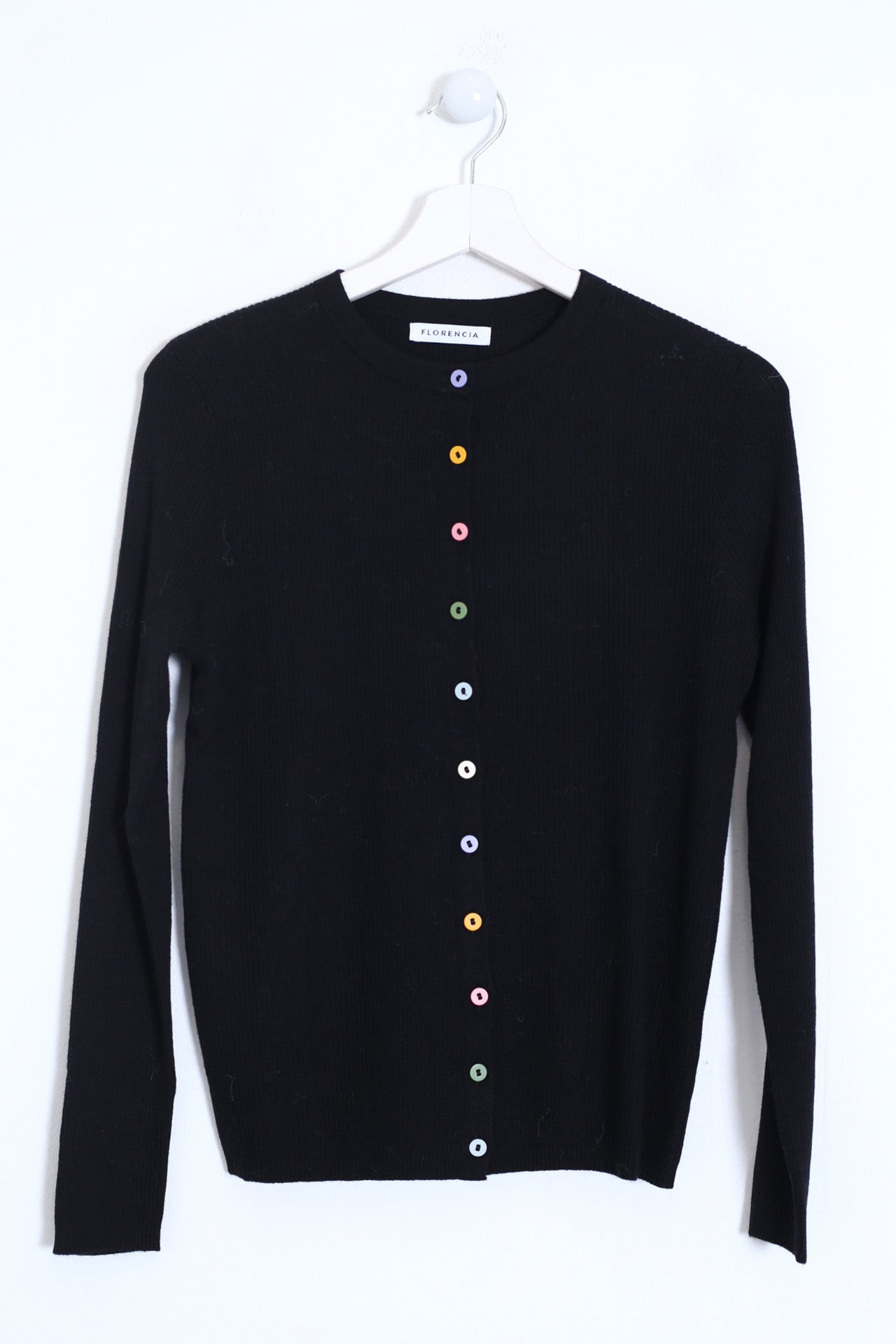 Cárdigan con cuello redondo y manga larga. Cierre frontal abotonado con botones multitono. Punto canalé.