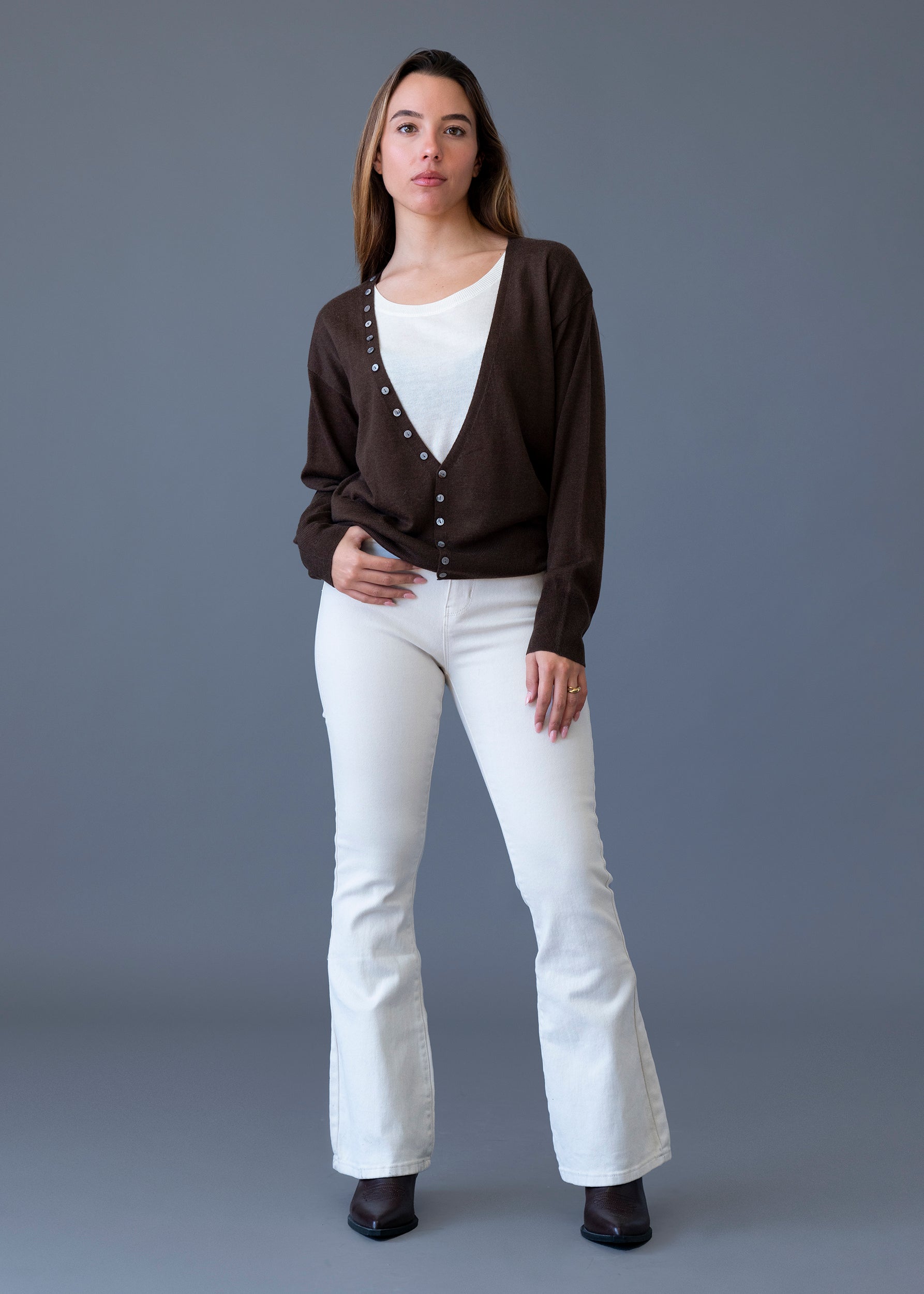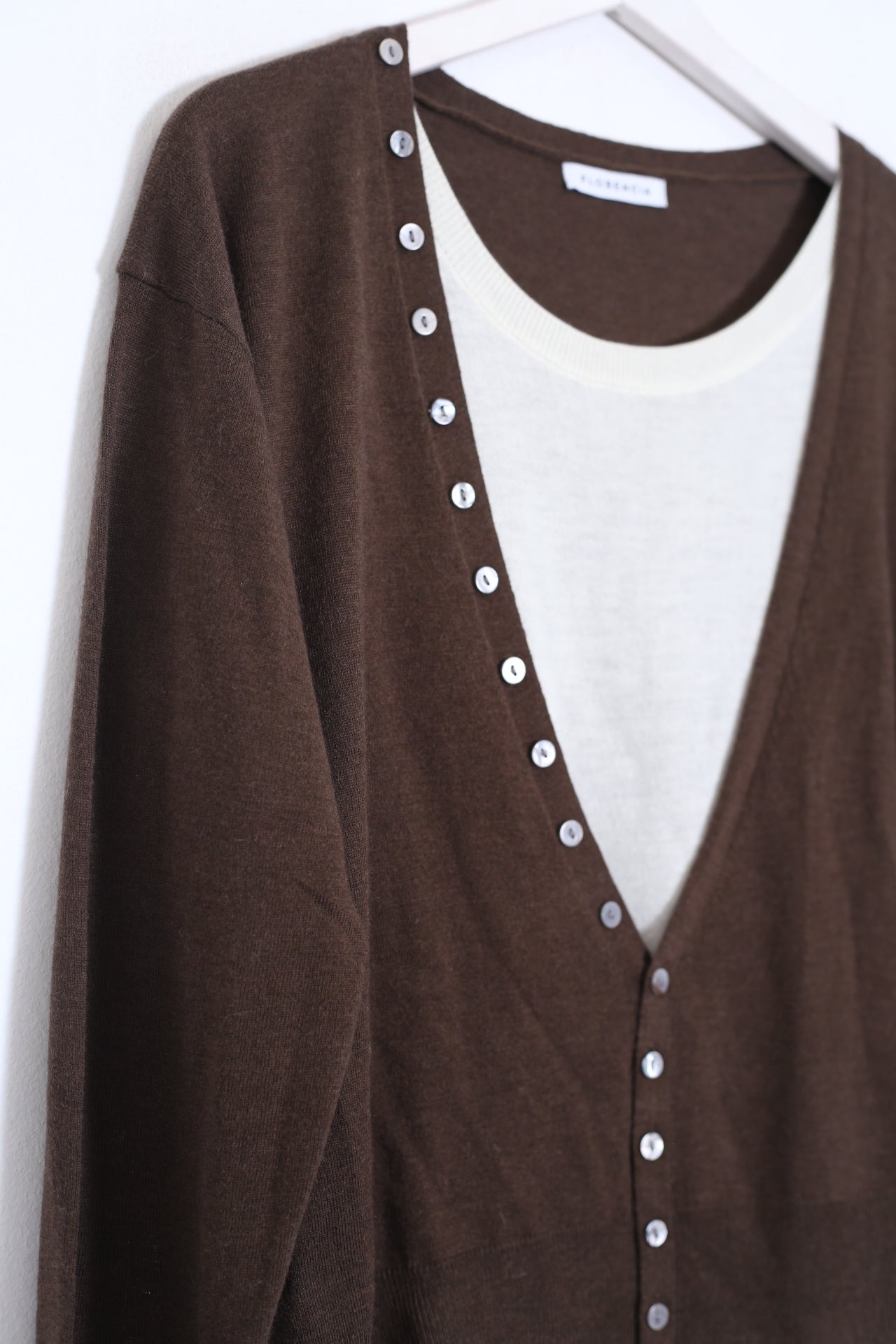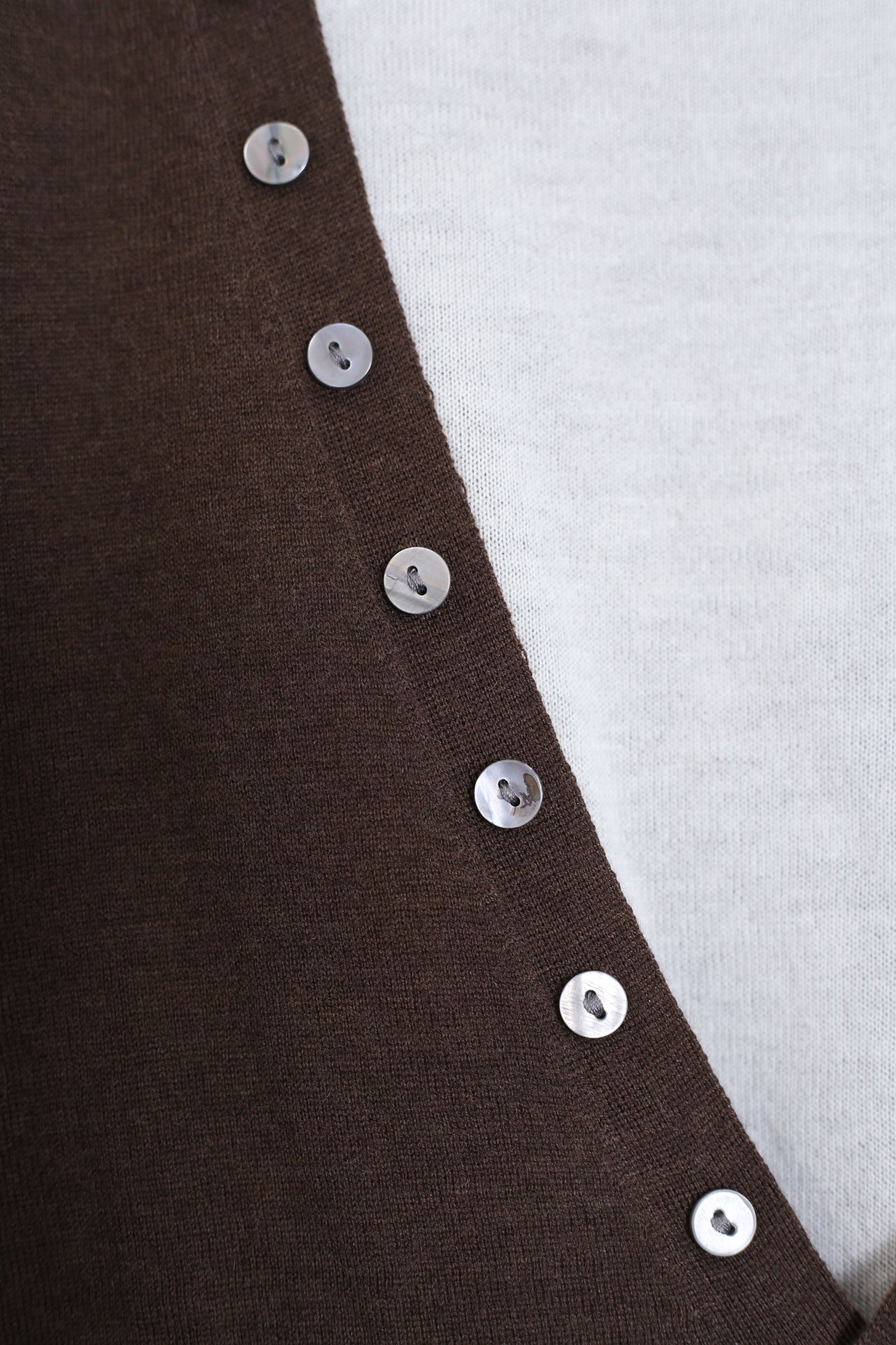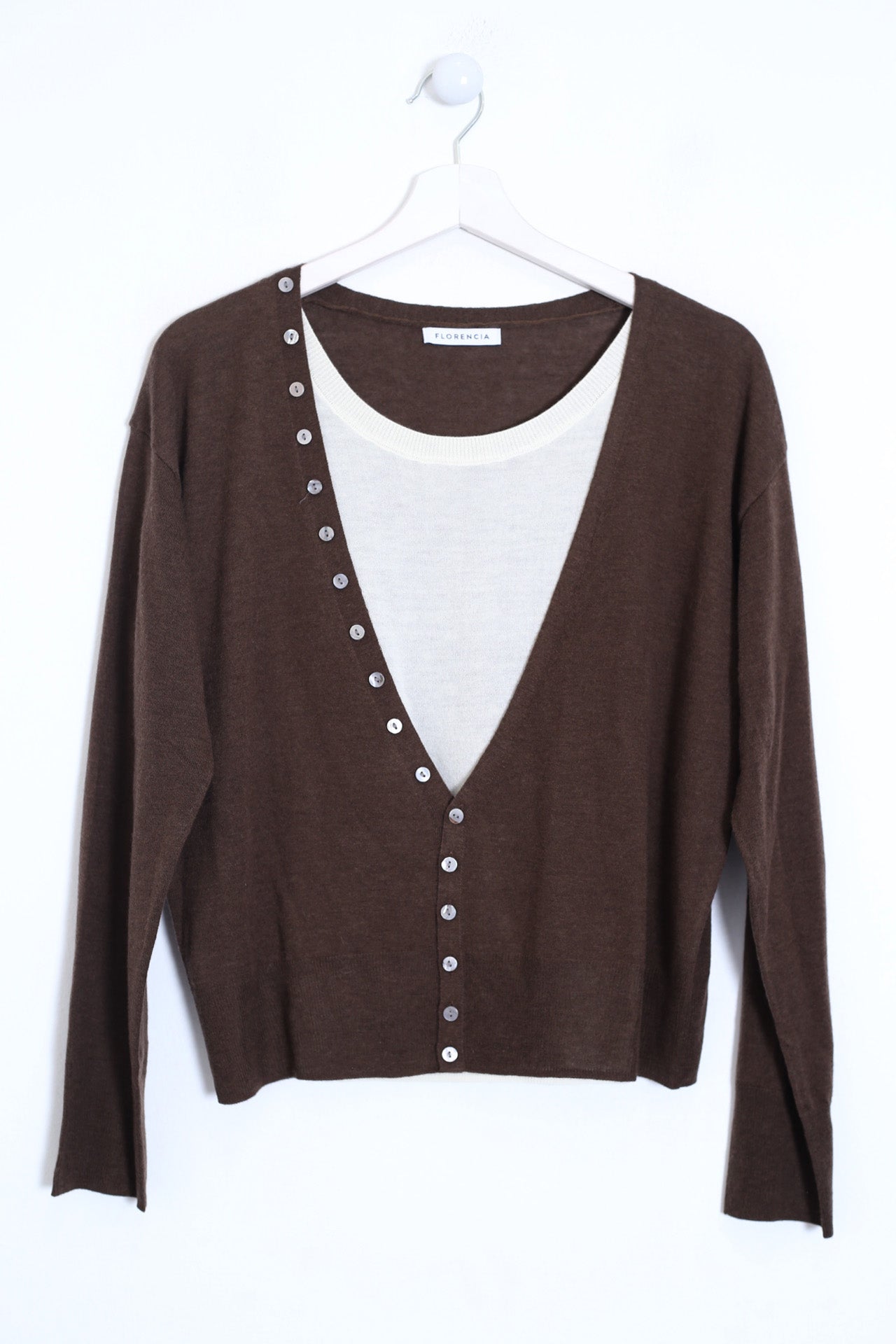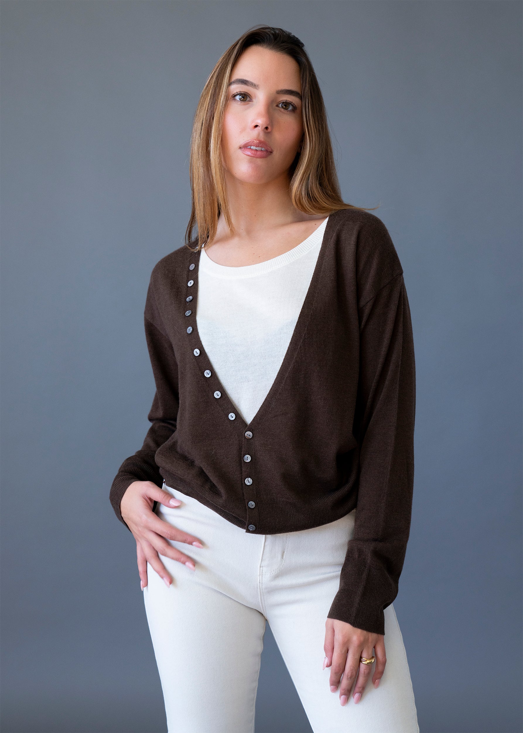 Cárdigan de escote en punta con detalle de botones decorativos y top falso top interior a contraste de cuello redondo. Cierre frontal abotonado. Acabados en rib.
