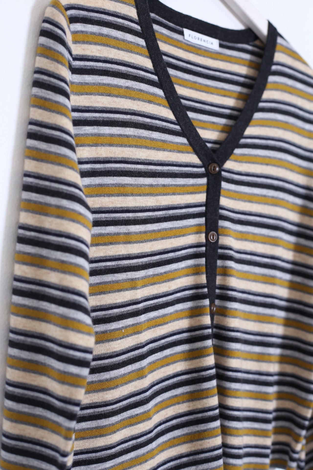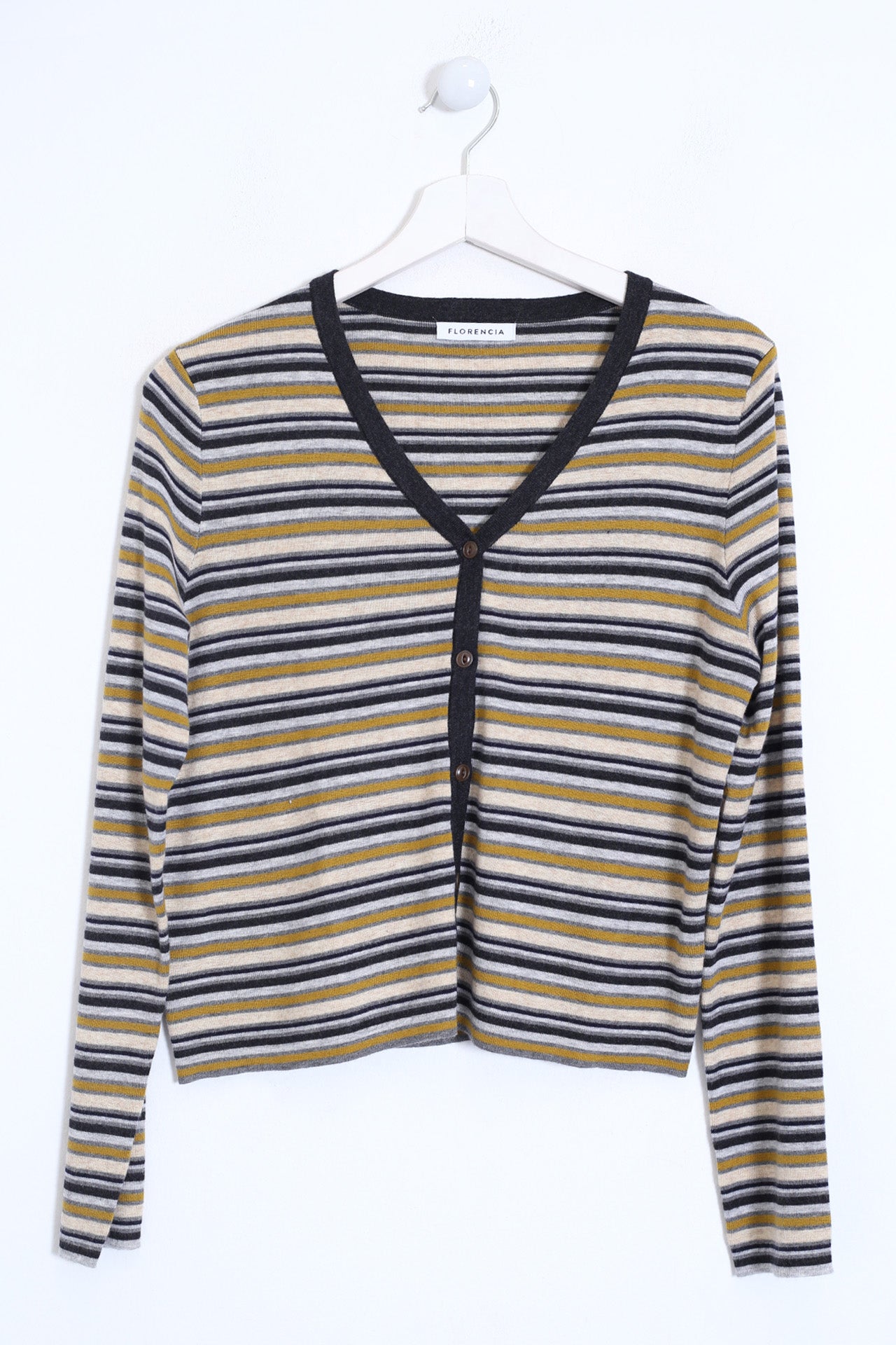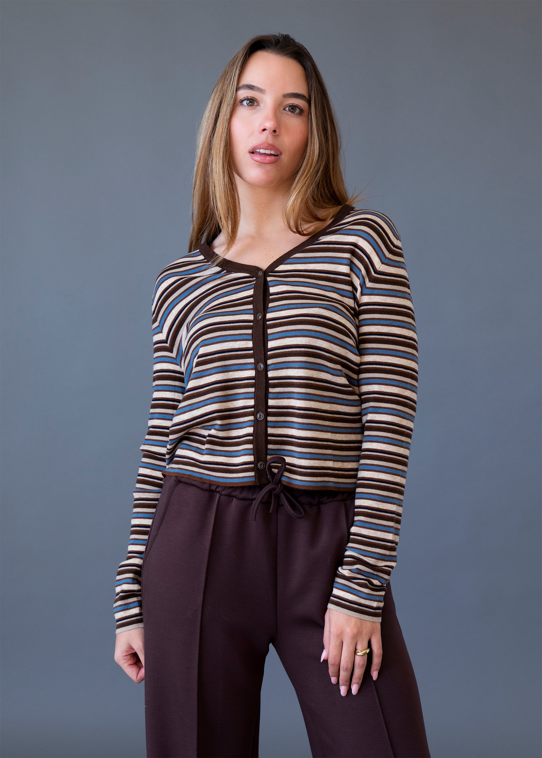 Cárdigan de punto con cuello en punta y manga larga. Cierre frontal abotonado.