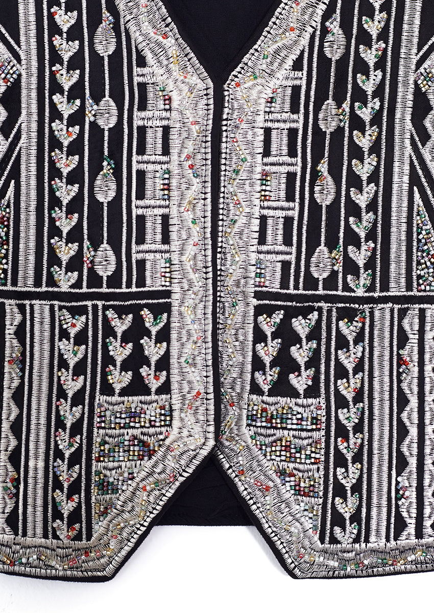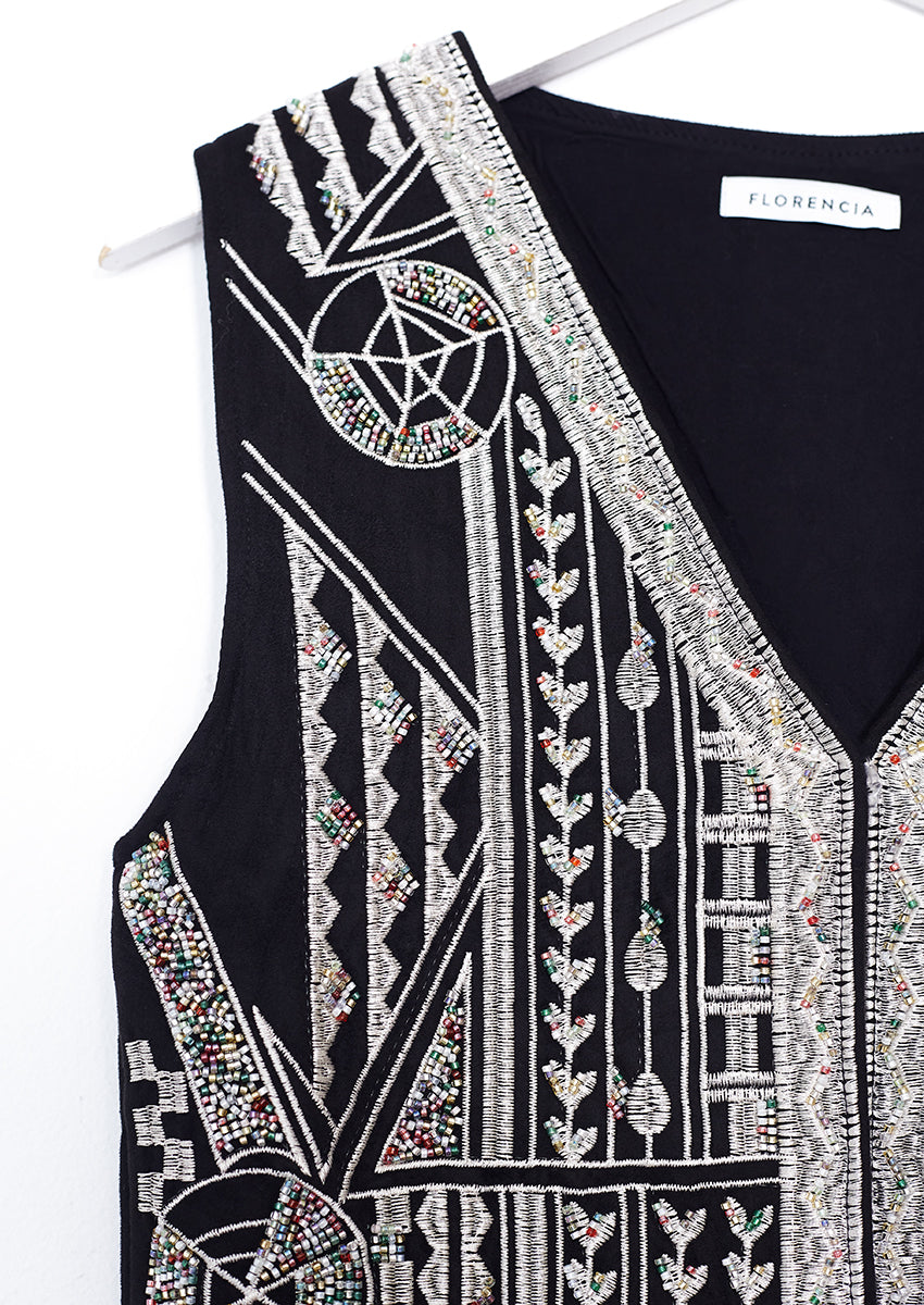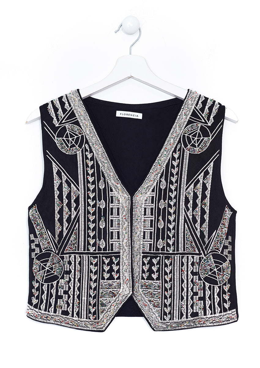 Vest with an open V-neckline and armhole sleeves. Embossed rhinestone detail.