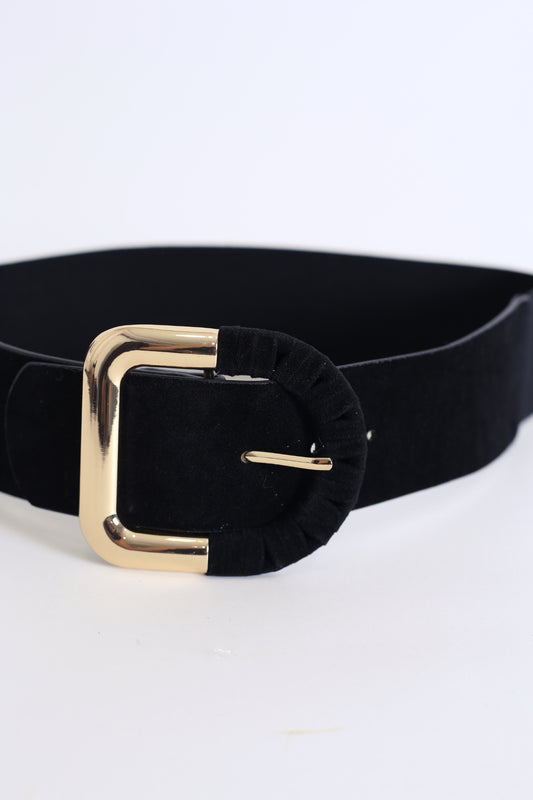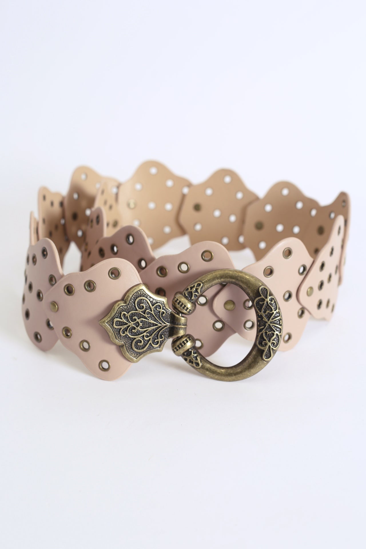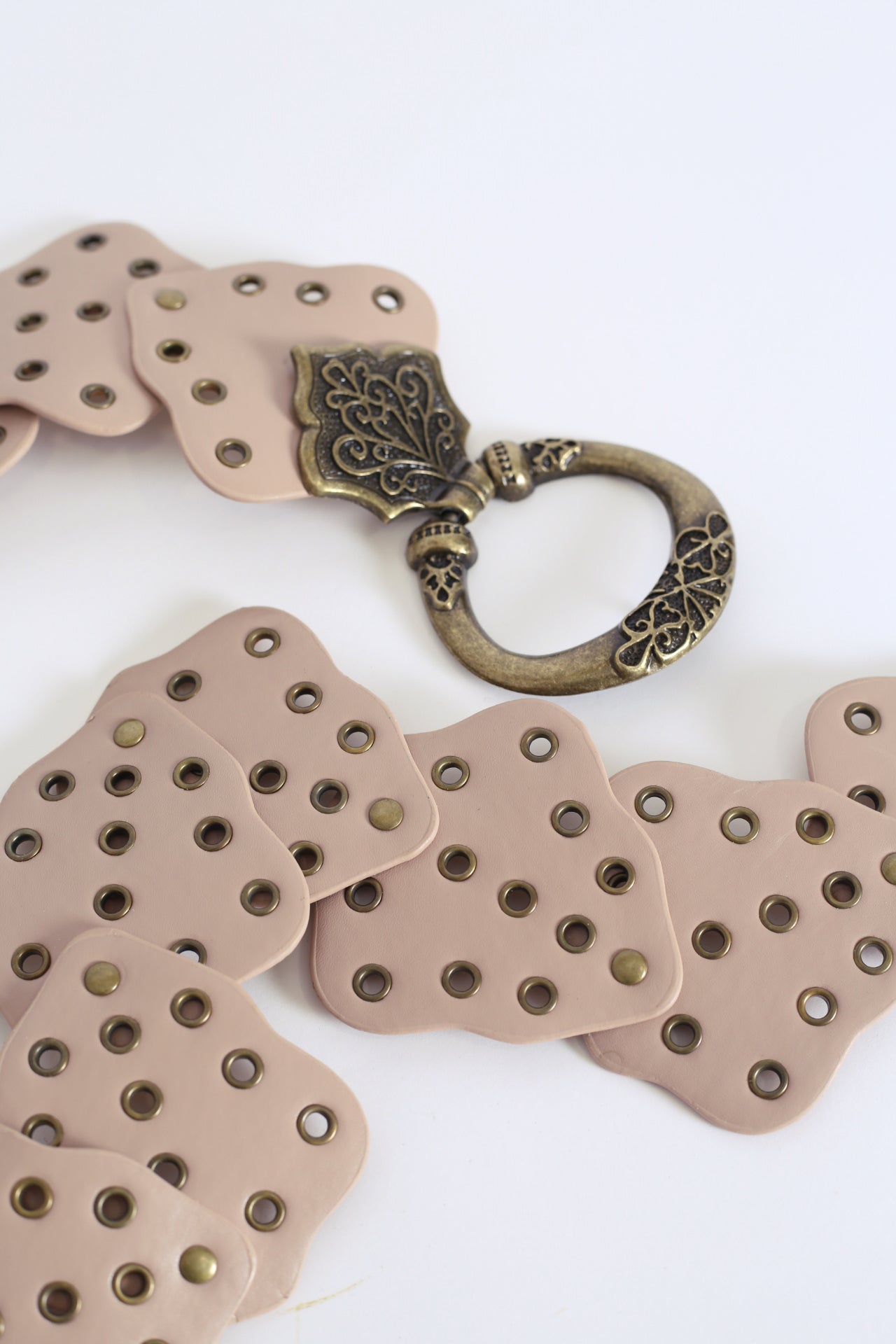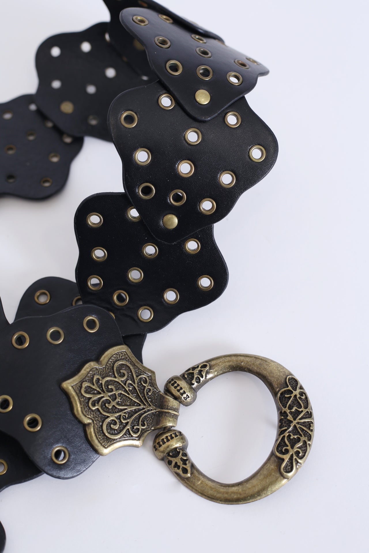 Cinturón combinado con tachuelas. Cierre con hebilla metálica ornamental.