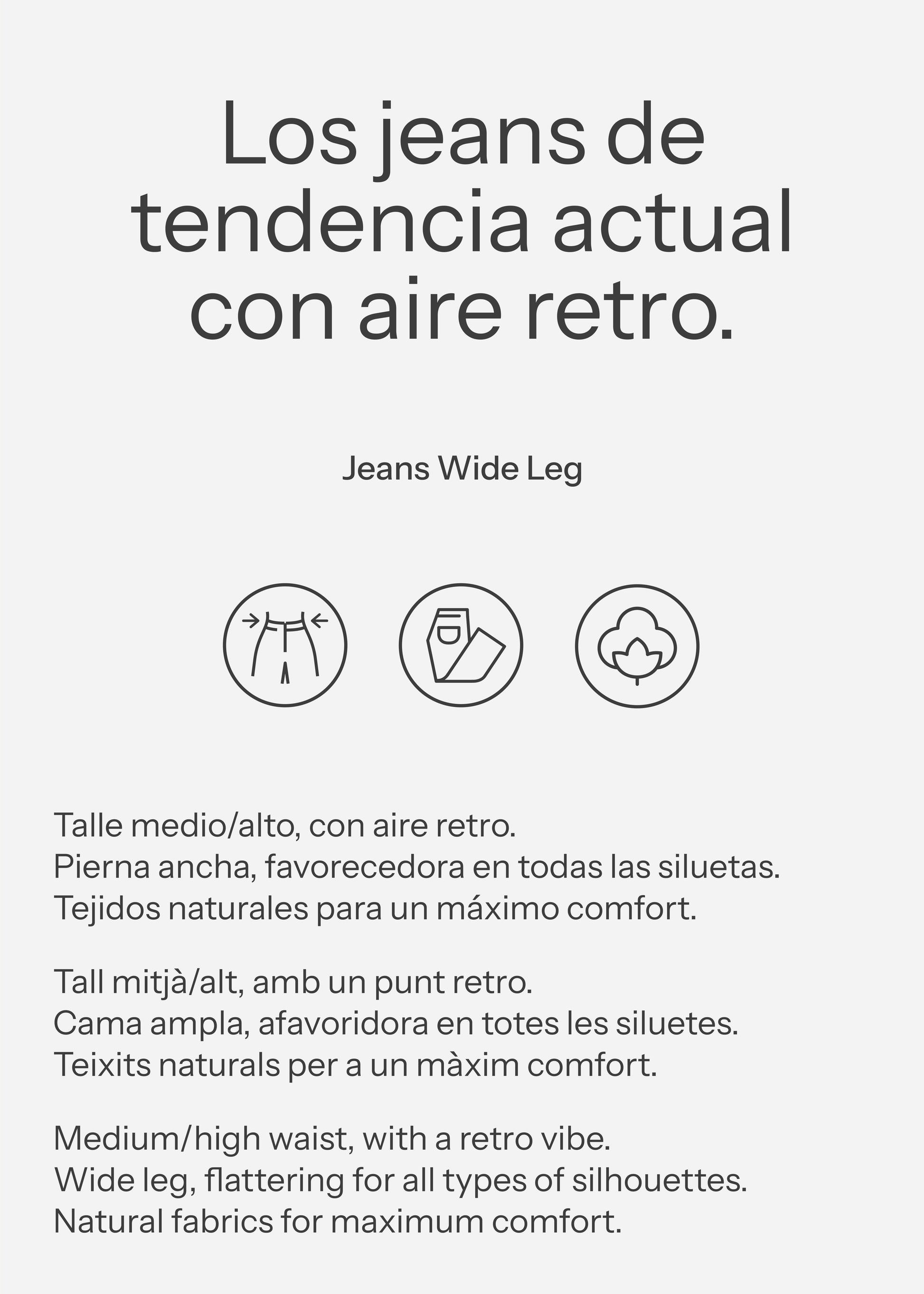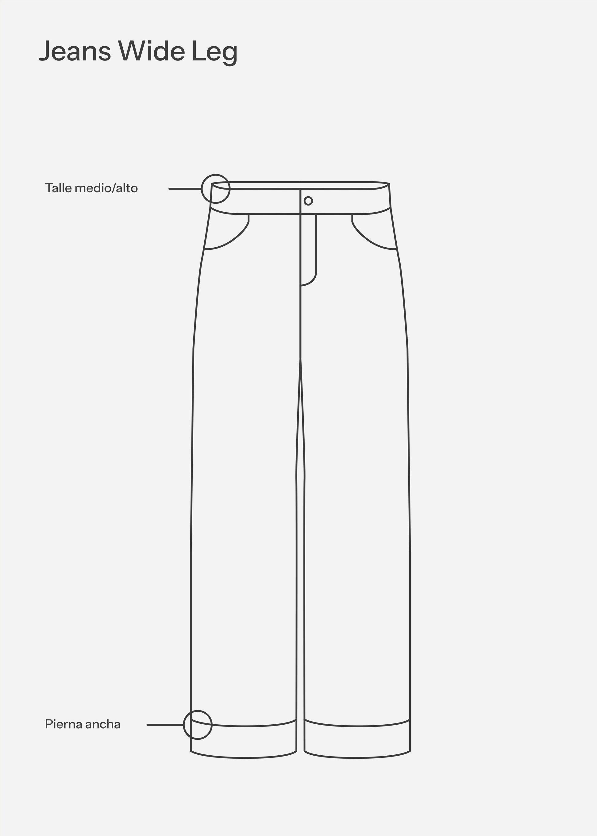 Wide, mid-rise trousers with front and back pockets. Front zip and button closure.
