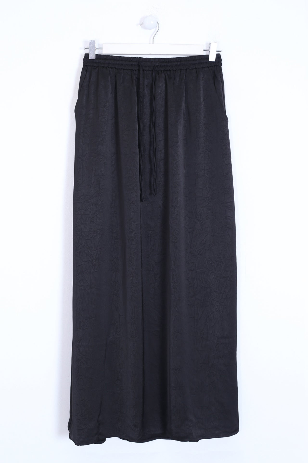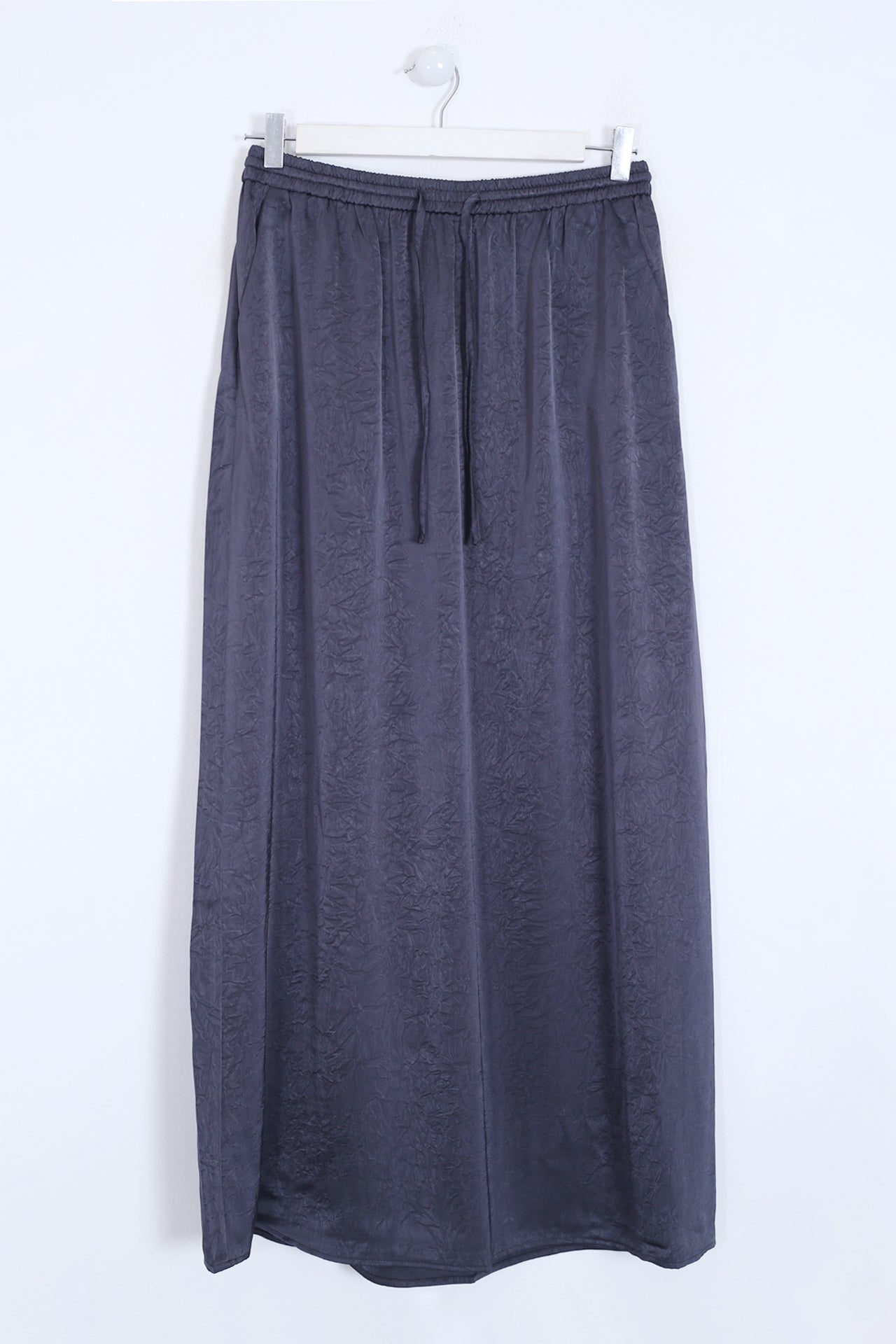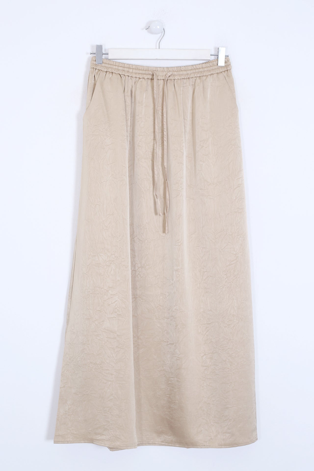 Falda larga de raso con cintura elástica y cordón ajustable.