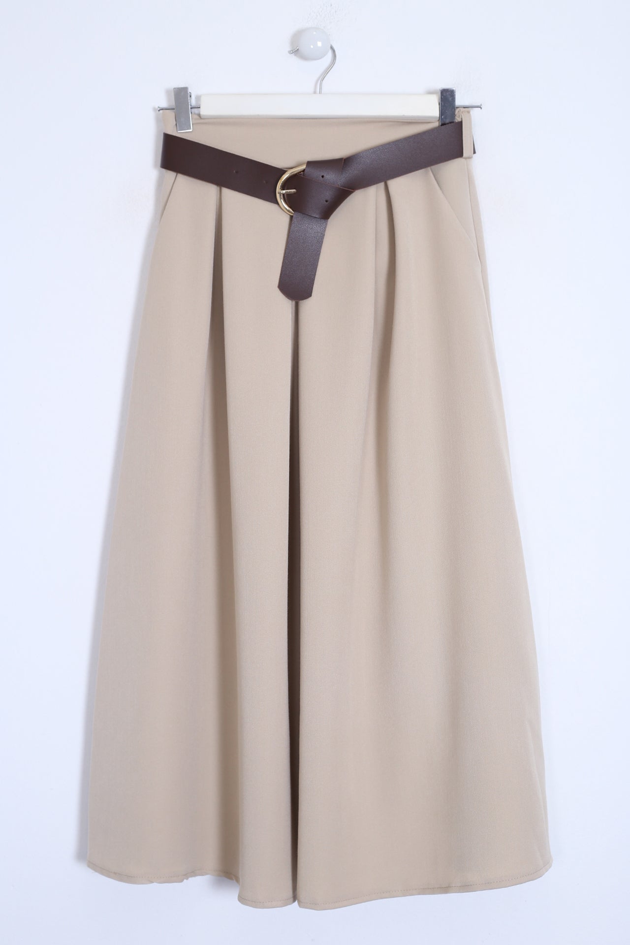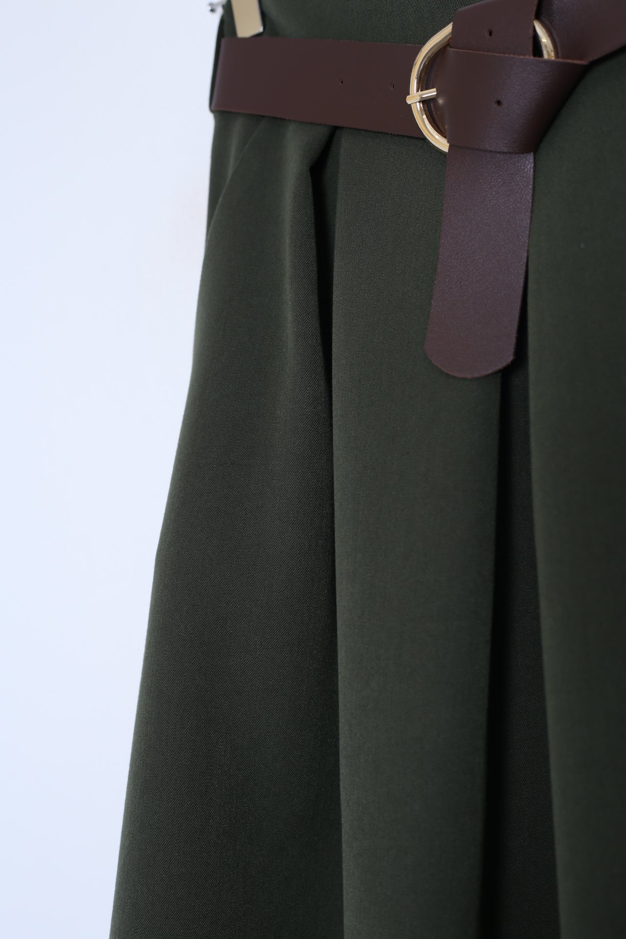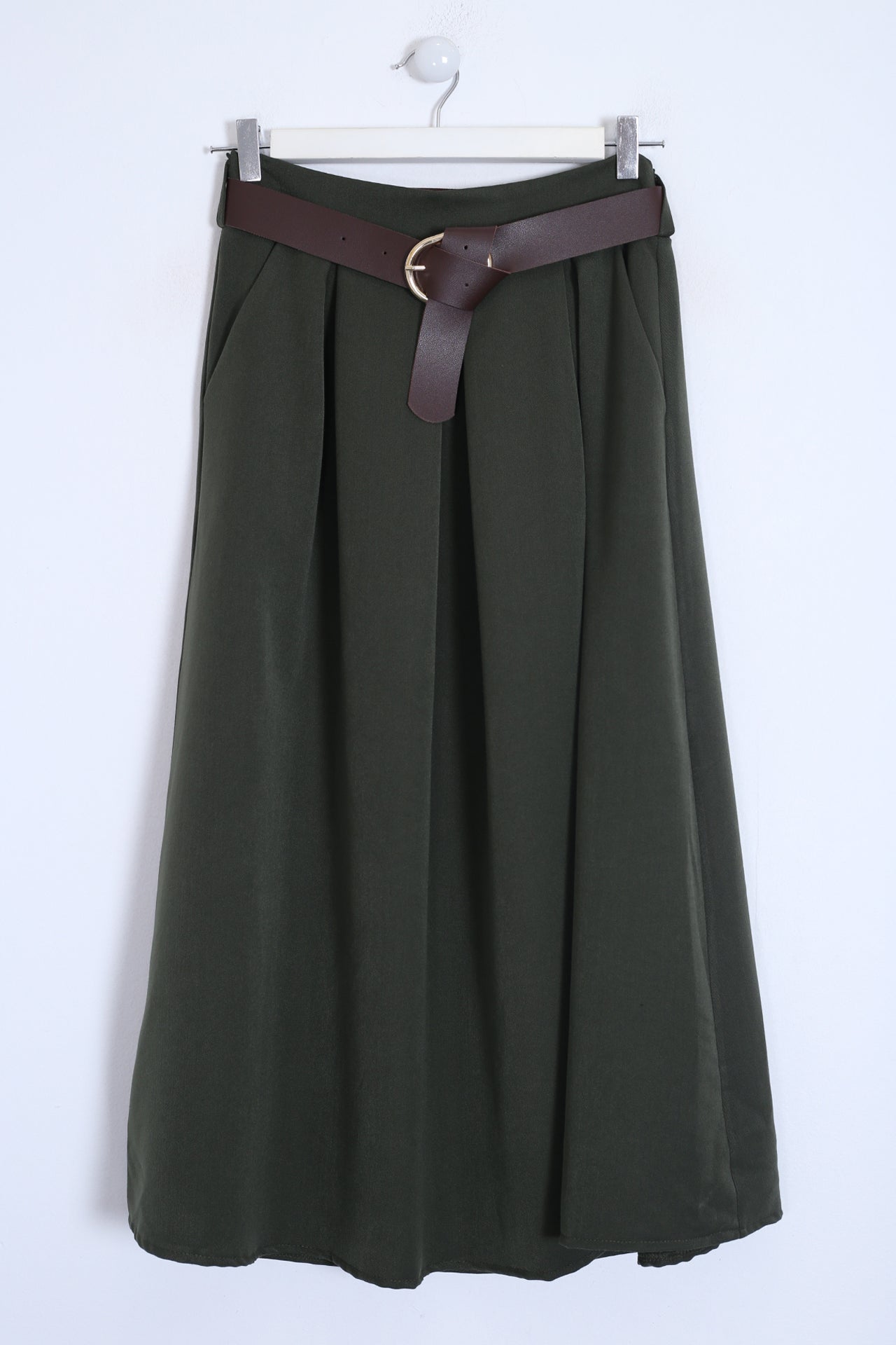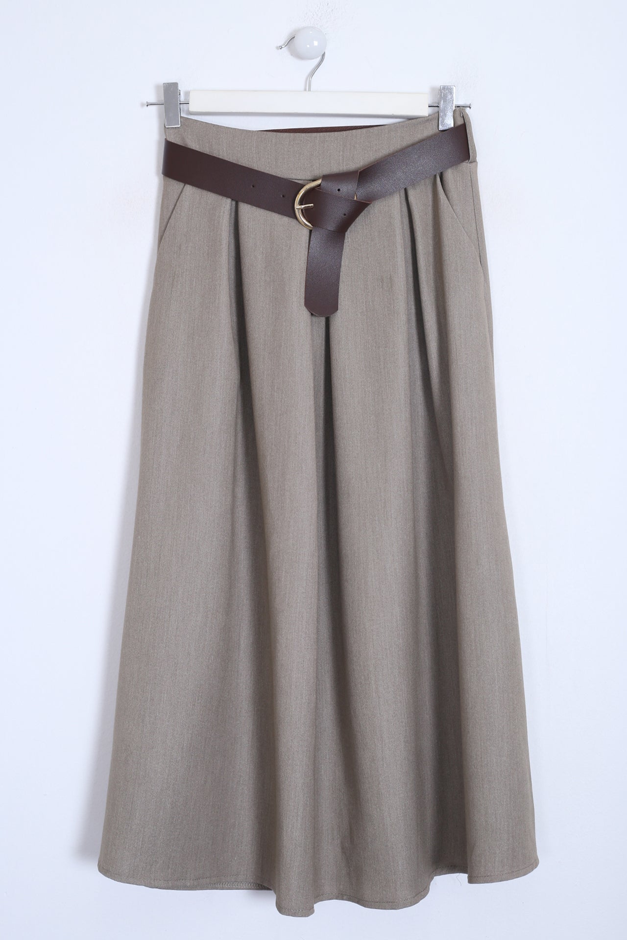 Falda con cintura elástica en trasero, trabillas y cinturón con hebilla metálica. Bolsillos frontales. Detalle de tablas en cintura.