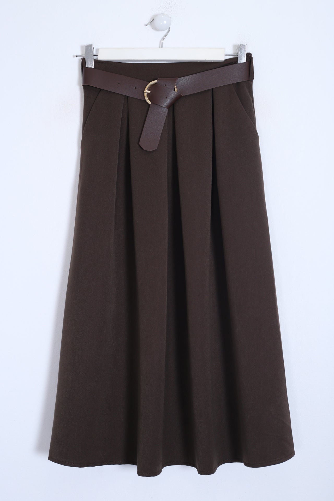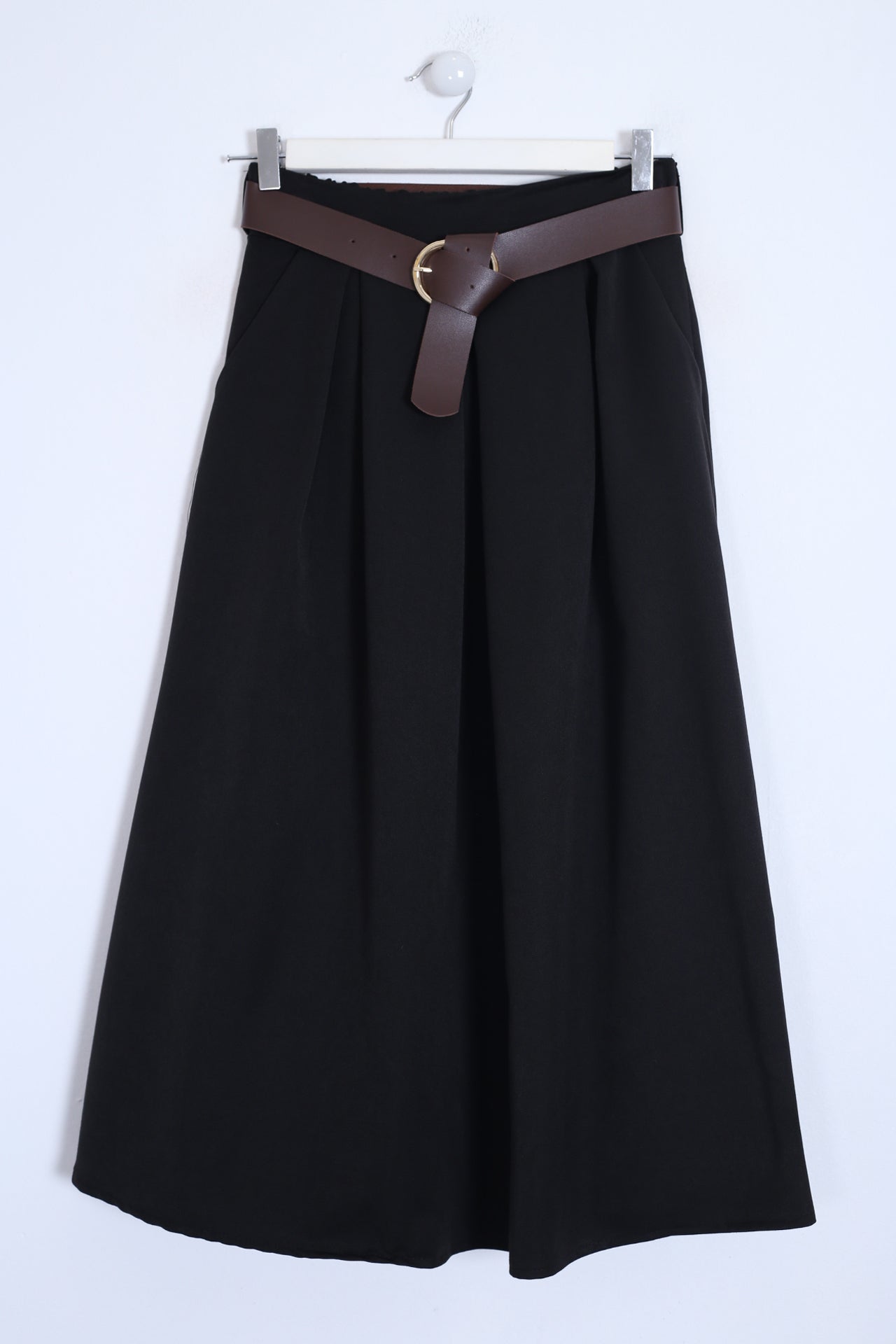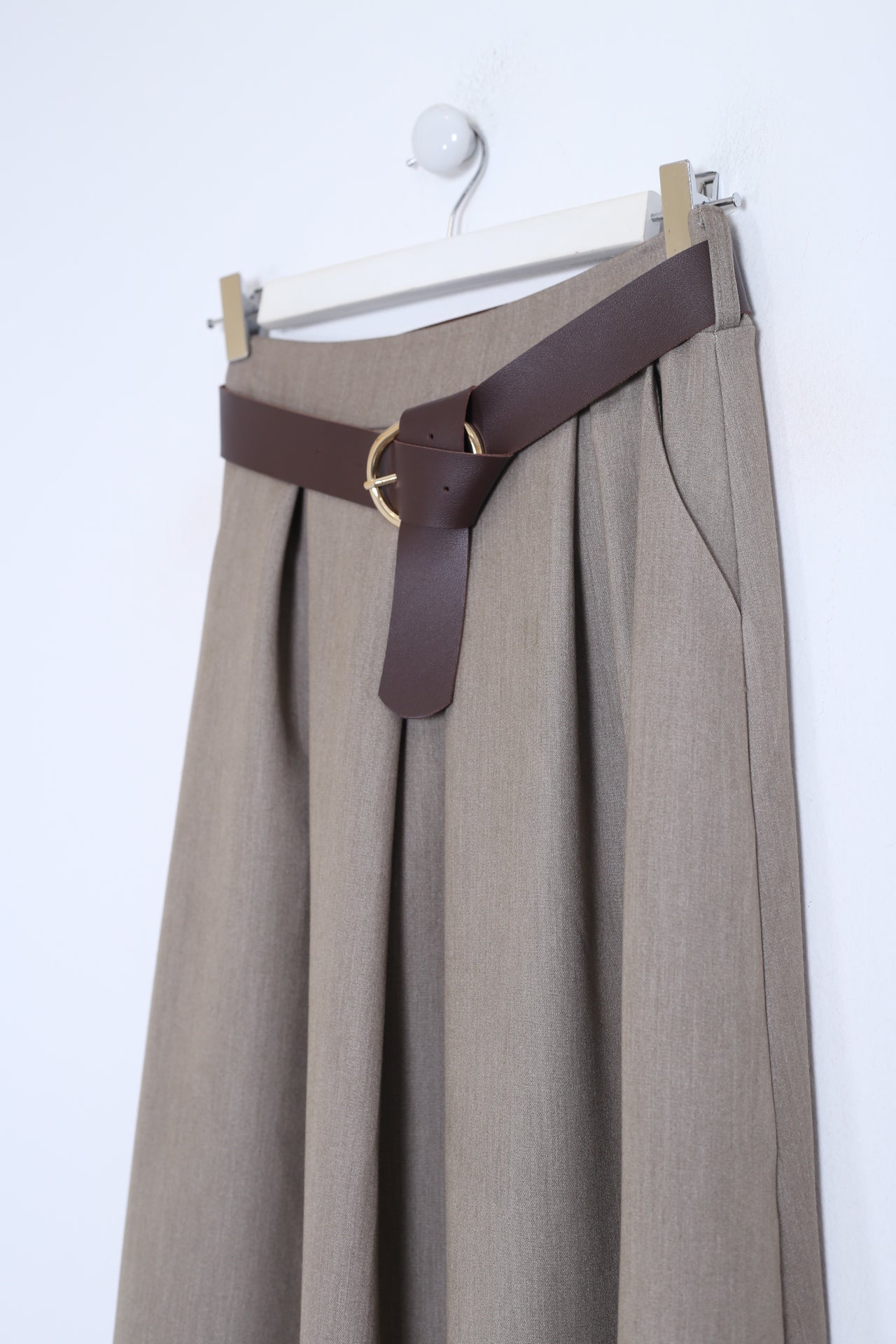 Falda con cintura elástica en trasero, trabillas y cinturón con hebilla metálica. Bolsillos frontales. Detalle de tablas en cintura.
