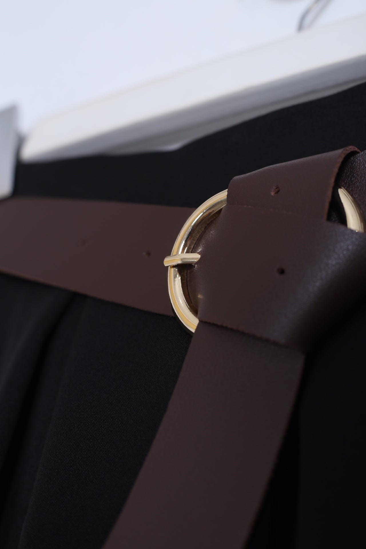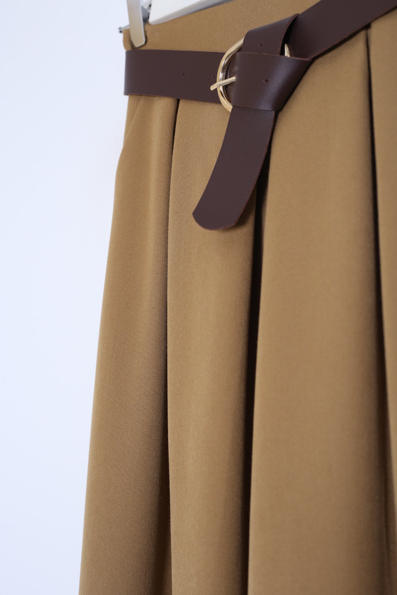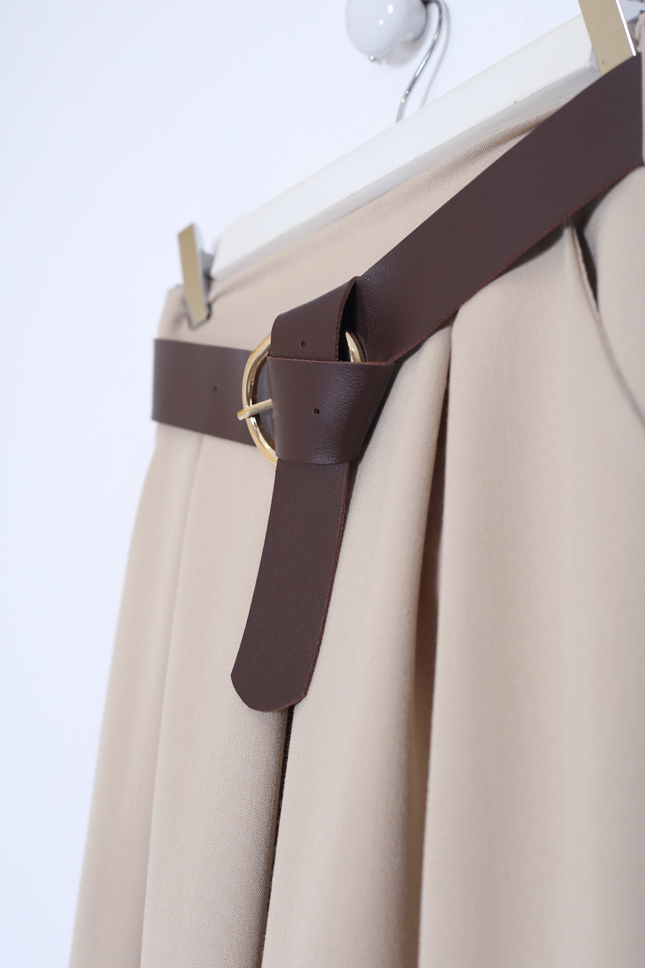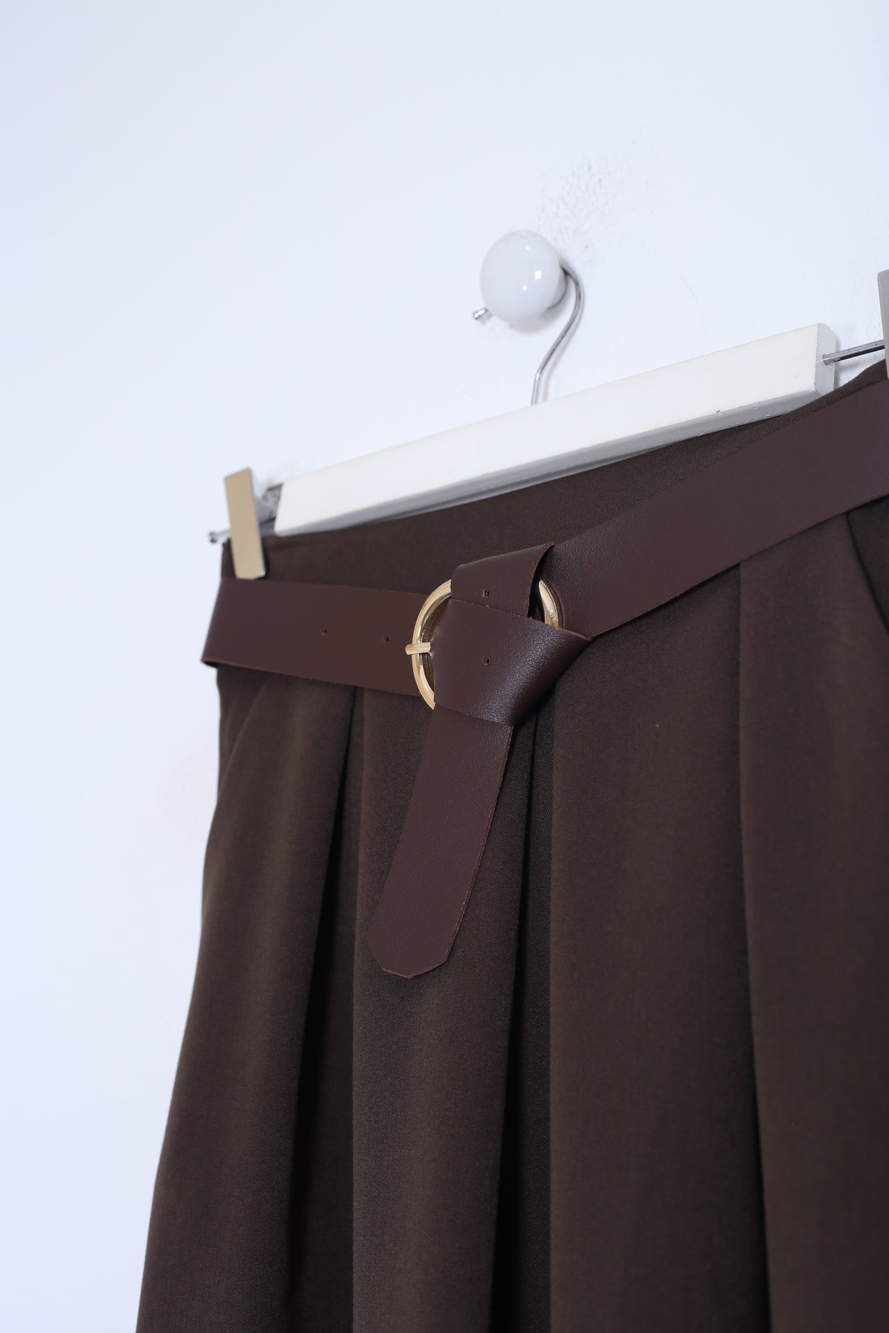 Falda con cintura elástica en trasero, trabillas y cinturón con hebilla metálica. Bolsillos frontales. Detalle de tablas en cintura.