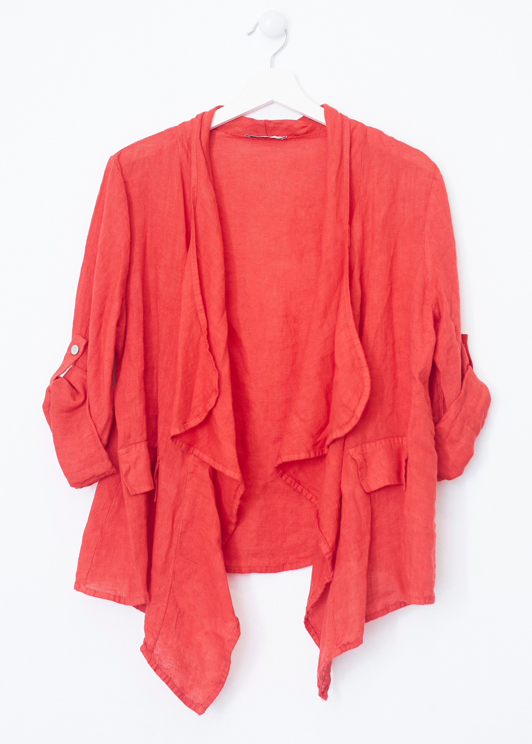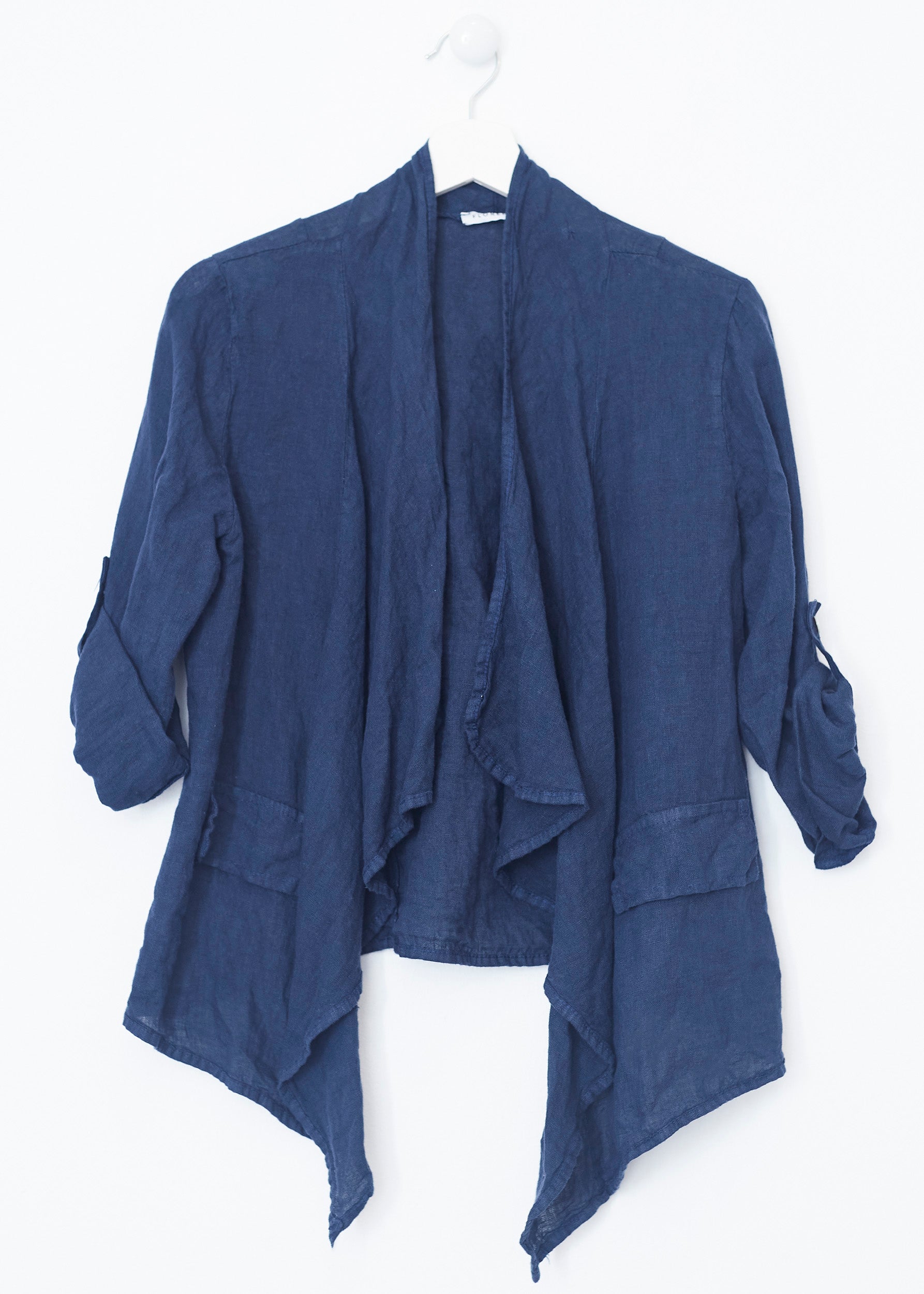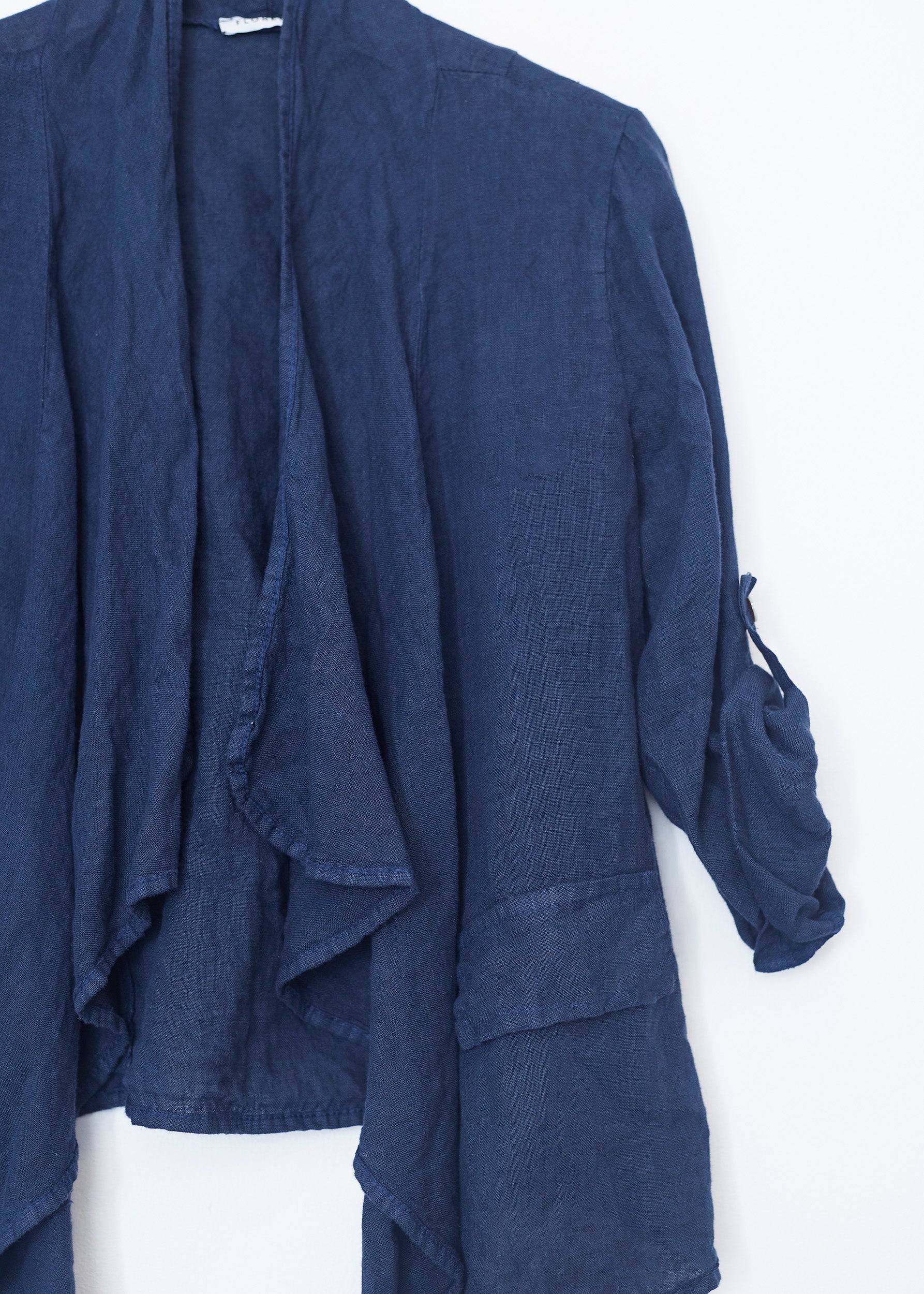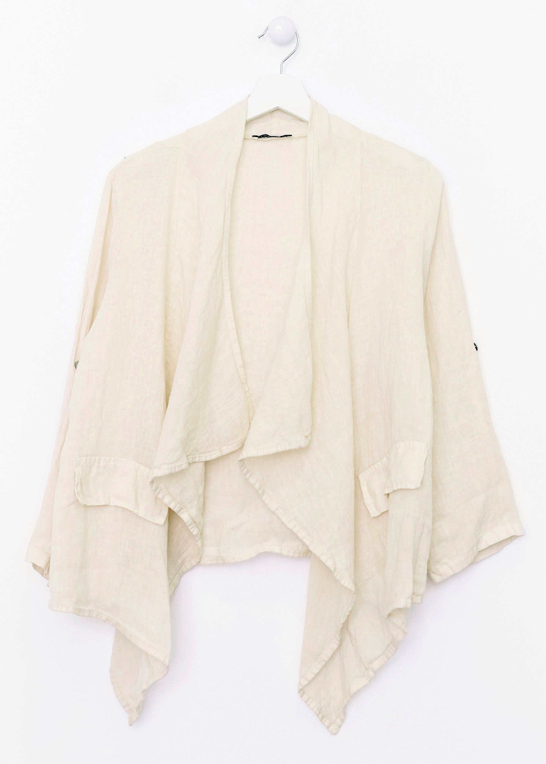 Lightweight open jacket in 100% linen. Sleeves below the elbow finished with a turn-up with a loop and button. Detail of false front pockets with flap. Asymmetric hem.
