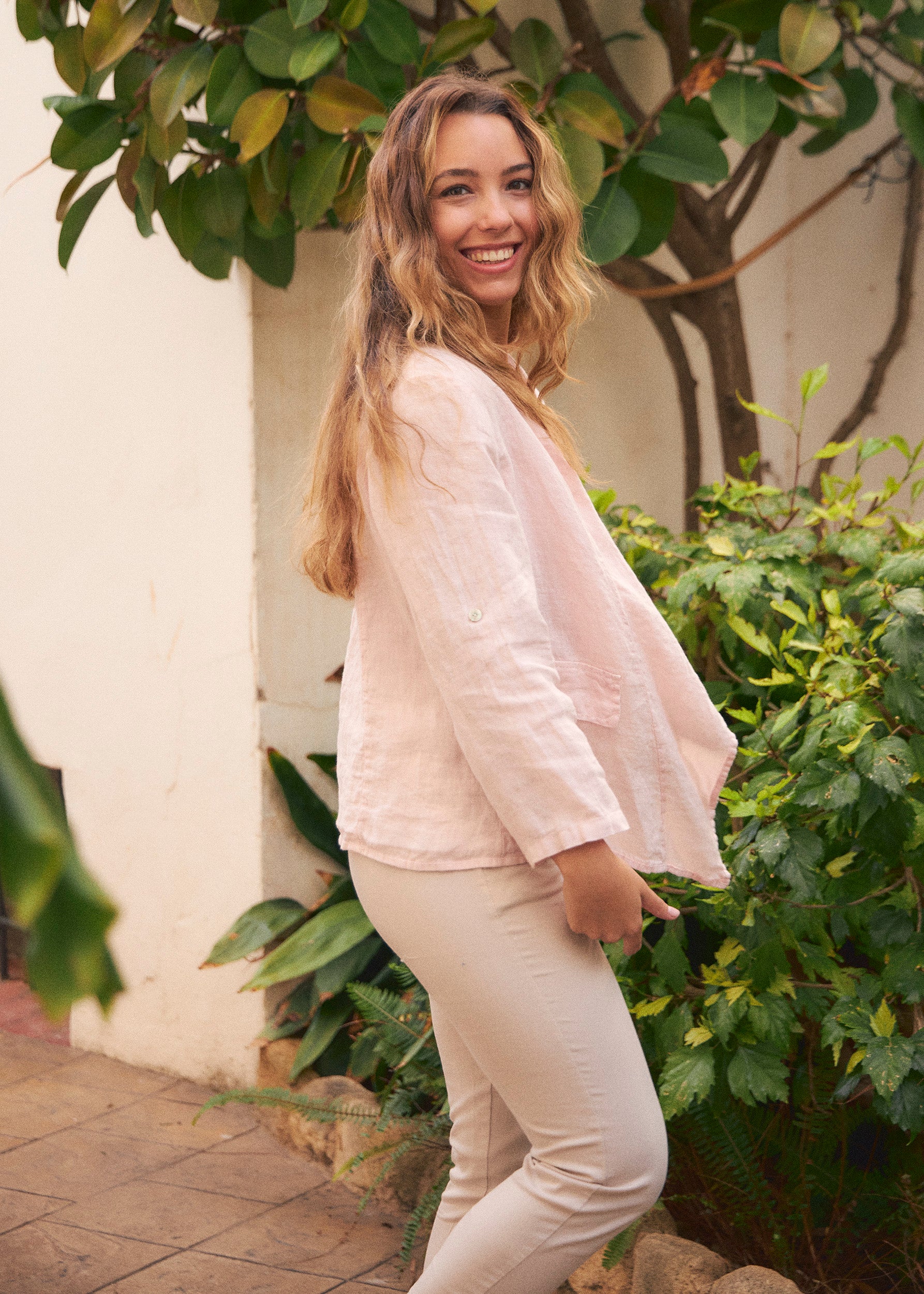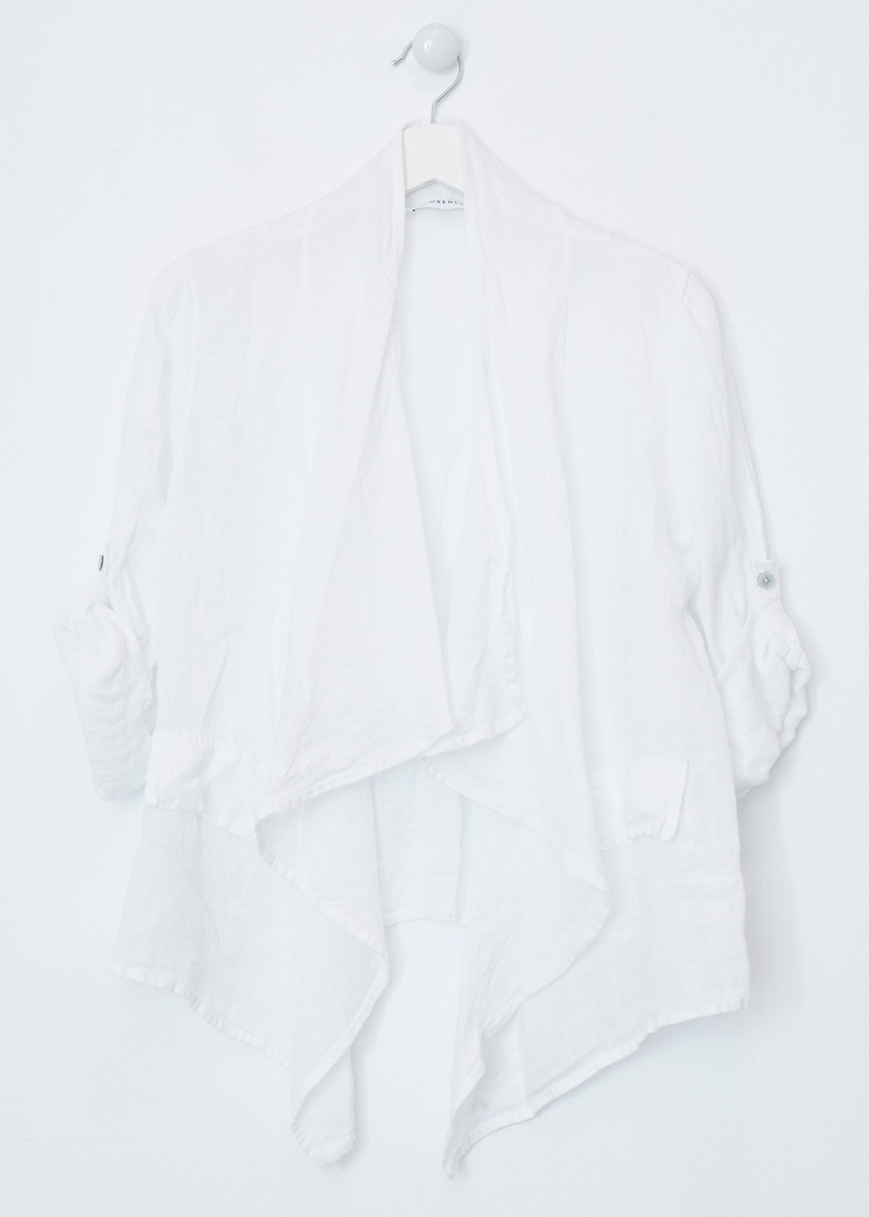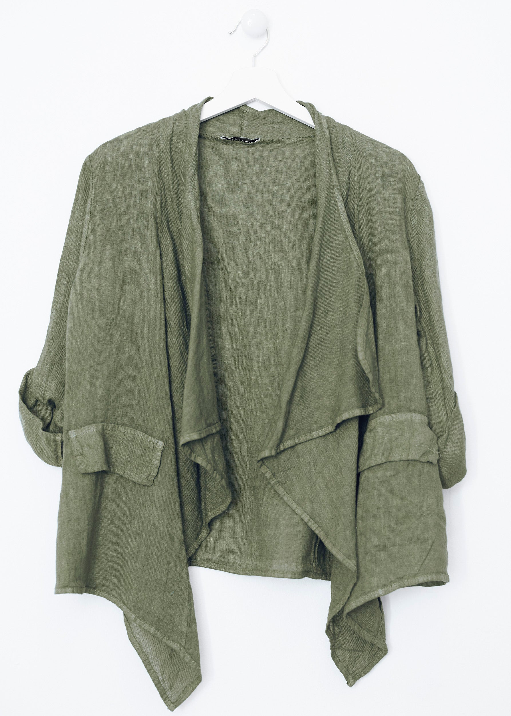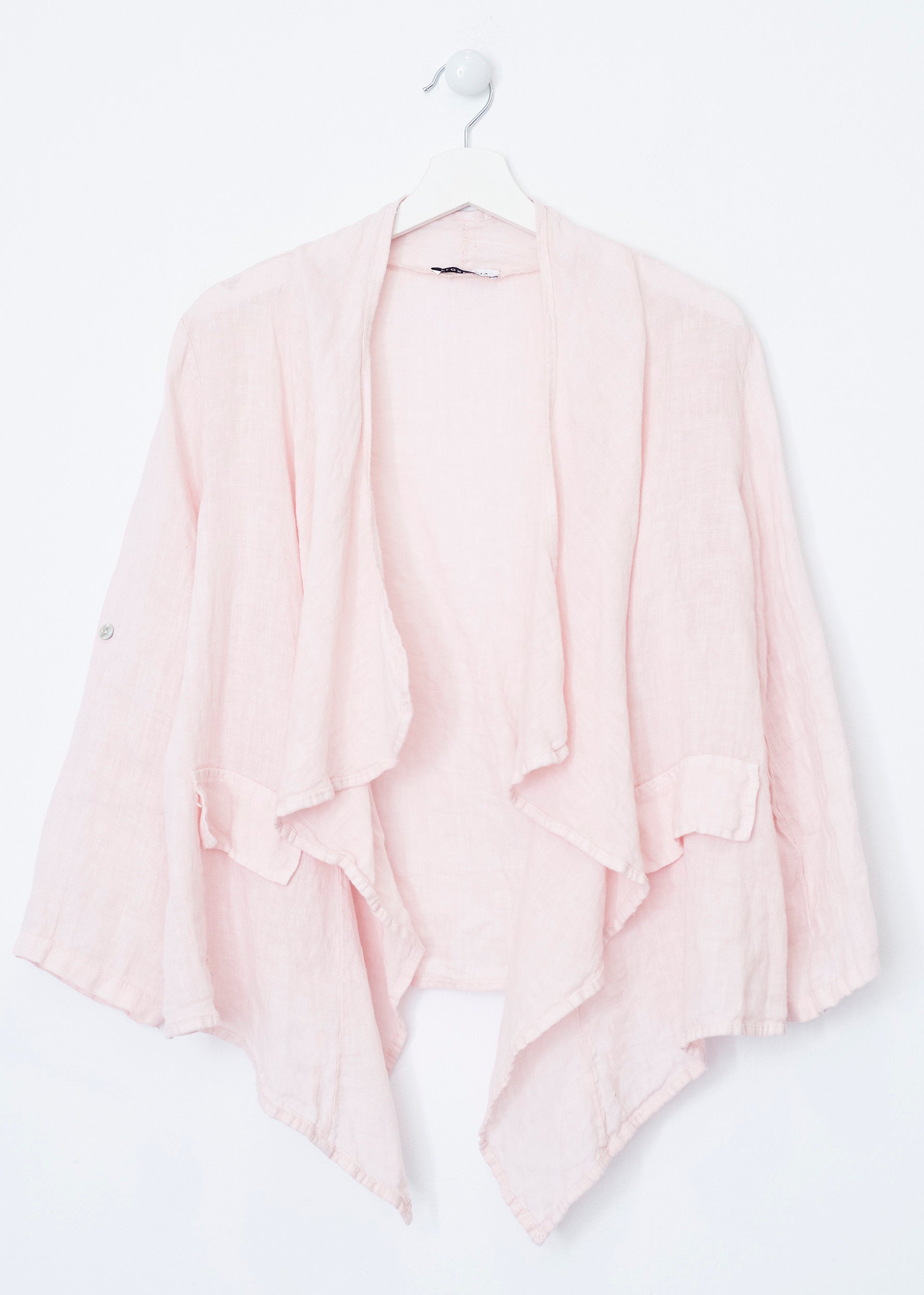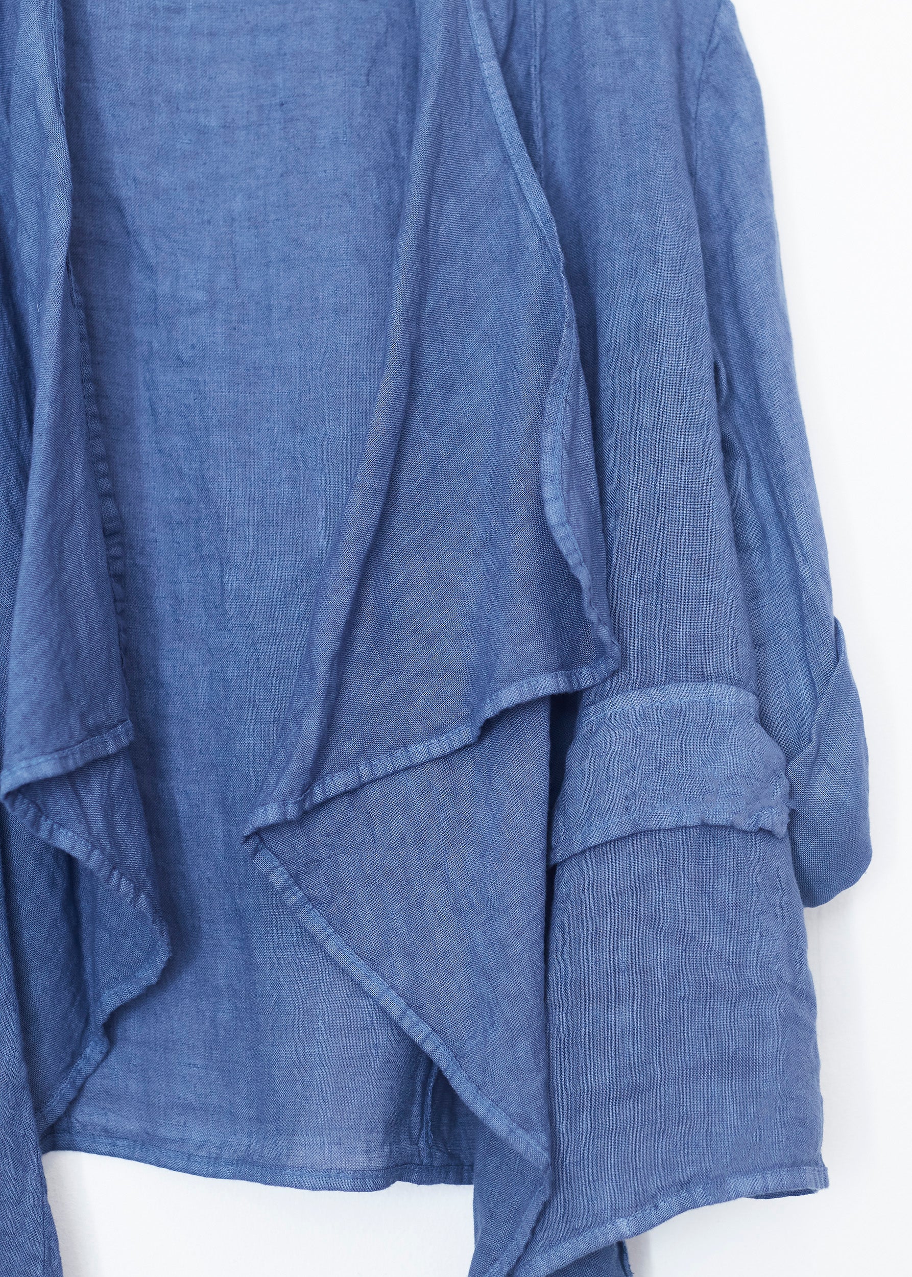 Lightweight open jacket in 100% linen. Sleeves below the elbow finished with a turn-up with a loop and button. Detail of false front pockets with flap. Asymmetric hem.