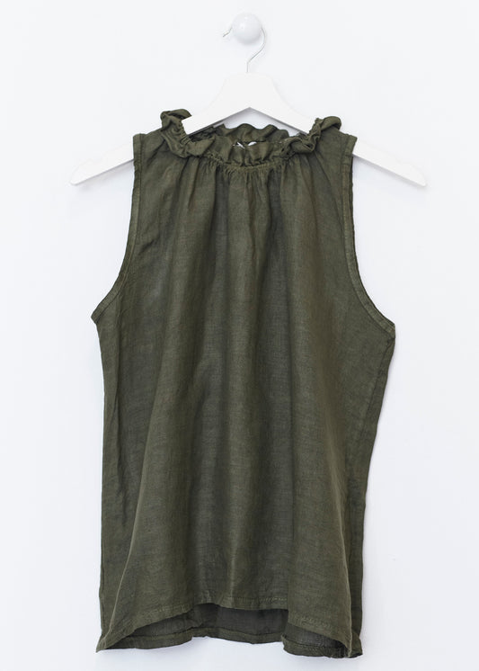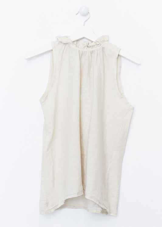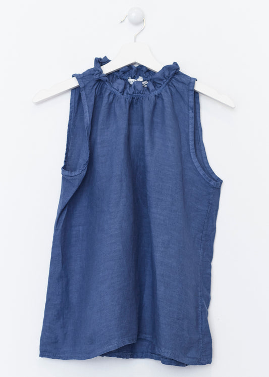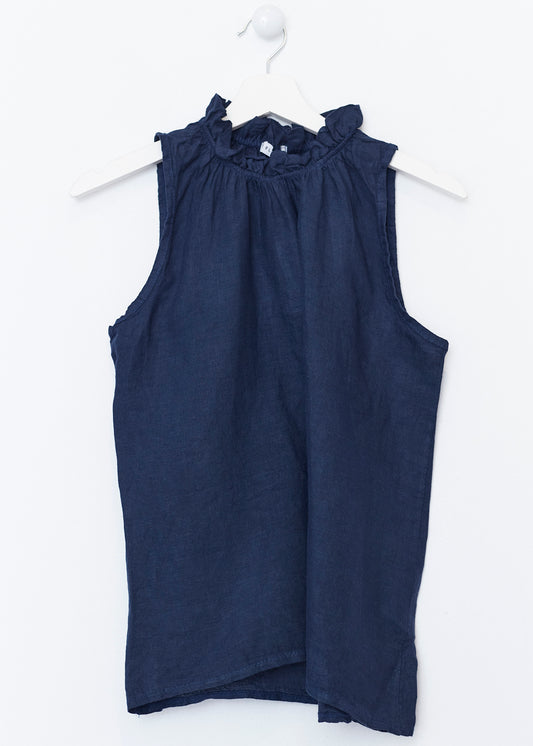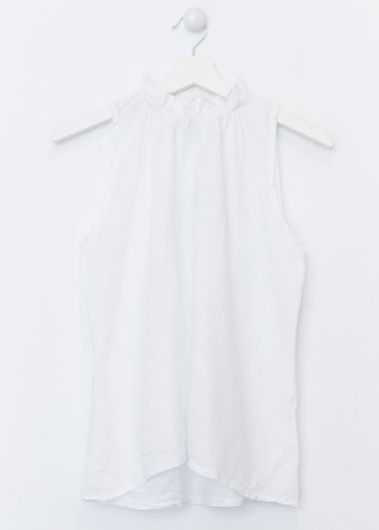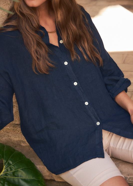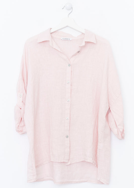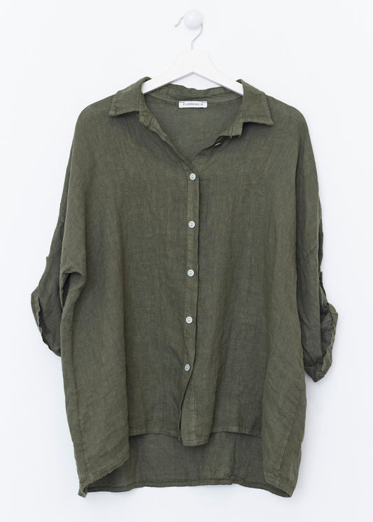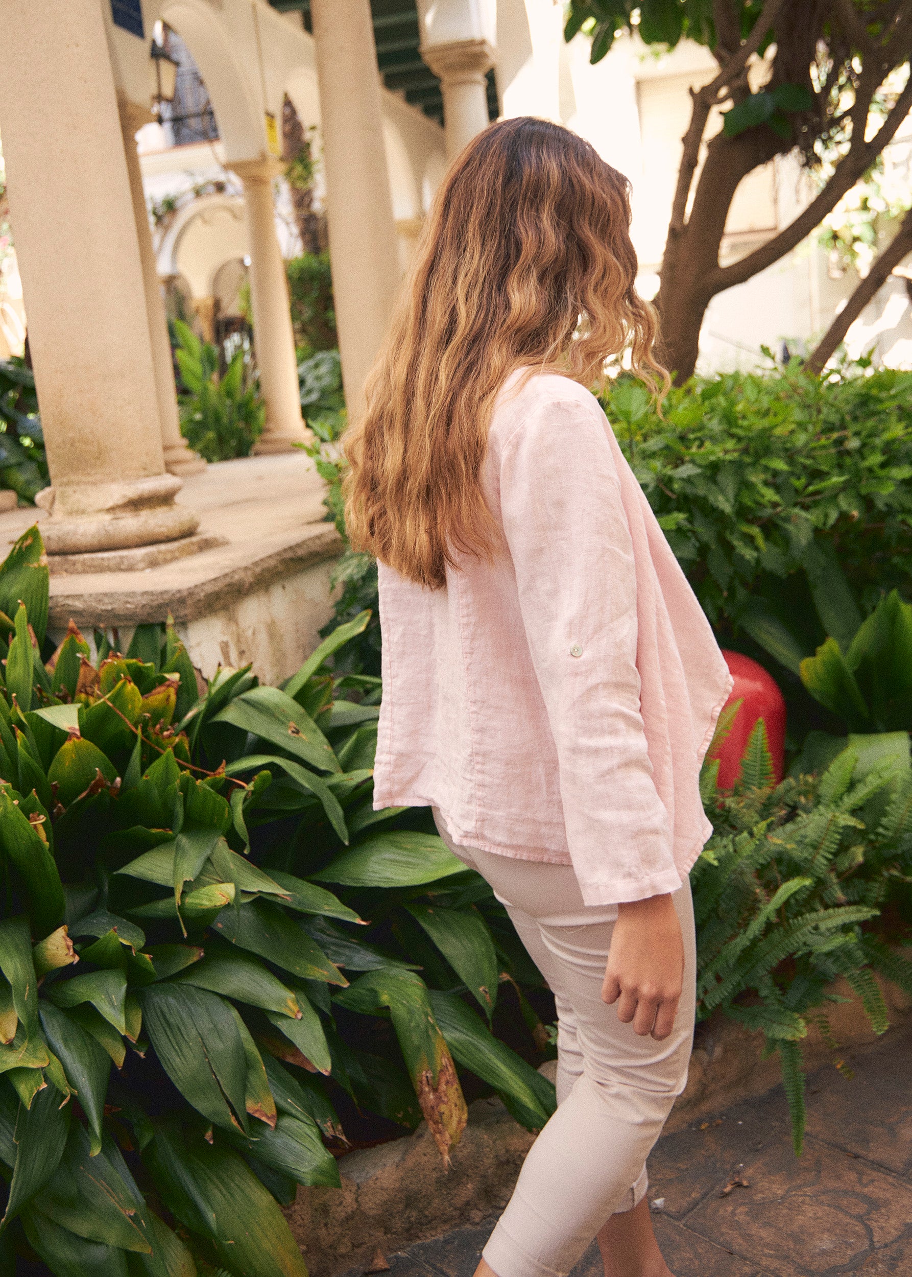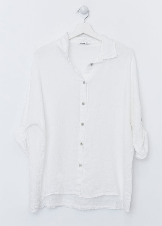 Lightweight open jacket in 100% linen. Sleeves below the elbow finished with a turn-up with a loop and button. Detail of false front pockets with flap. Asymmetric hem.