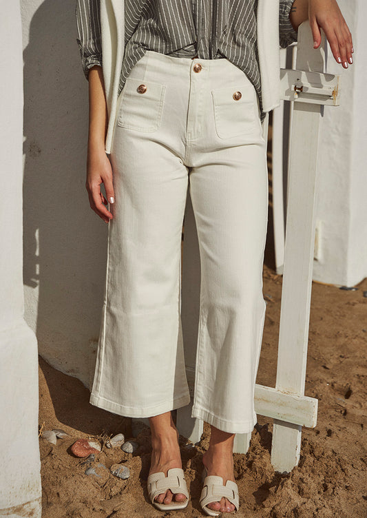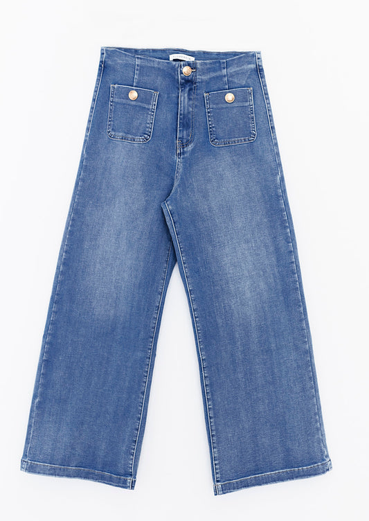 High-waisted jeans. Front button and zipper closure. Three front pockets. Contrast braided belt detail.