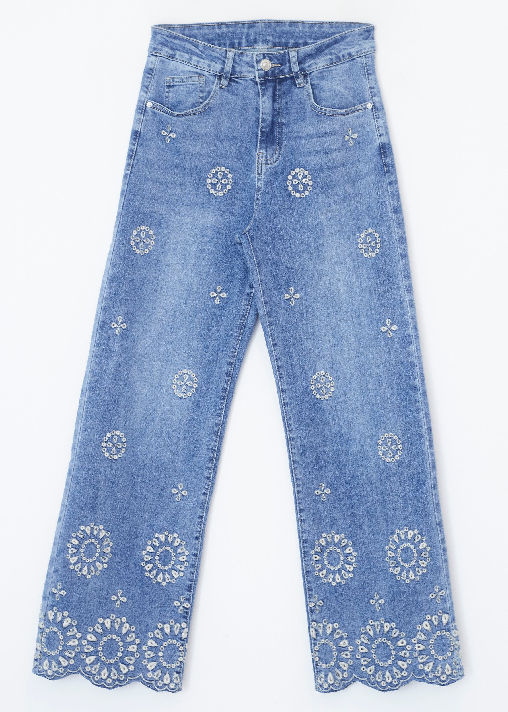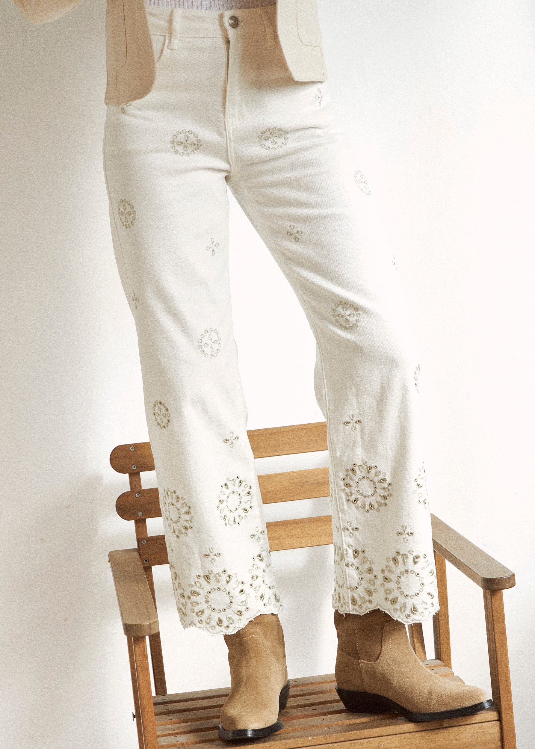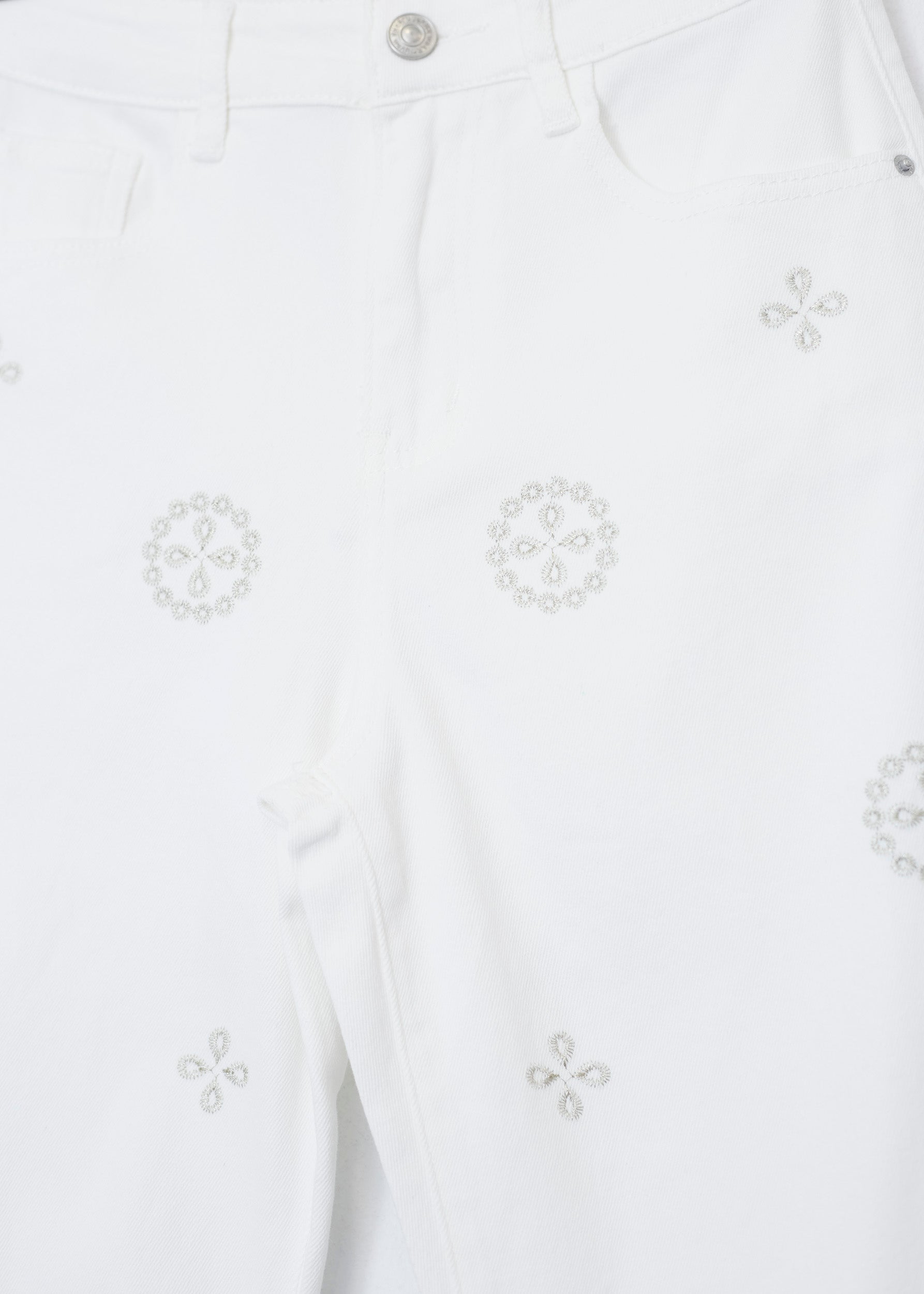 Jeans straight leg de tiro alto. Tres bolsillos frontales y dos bolsillos traseros de plastrón. Detalle de bordados florales perforados. Bajos desflecados.