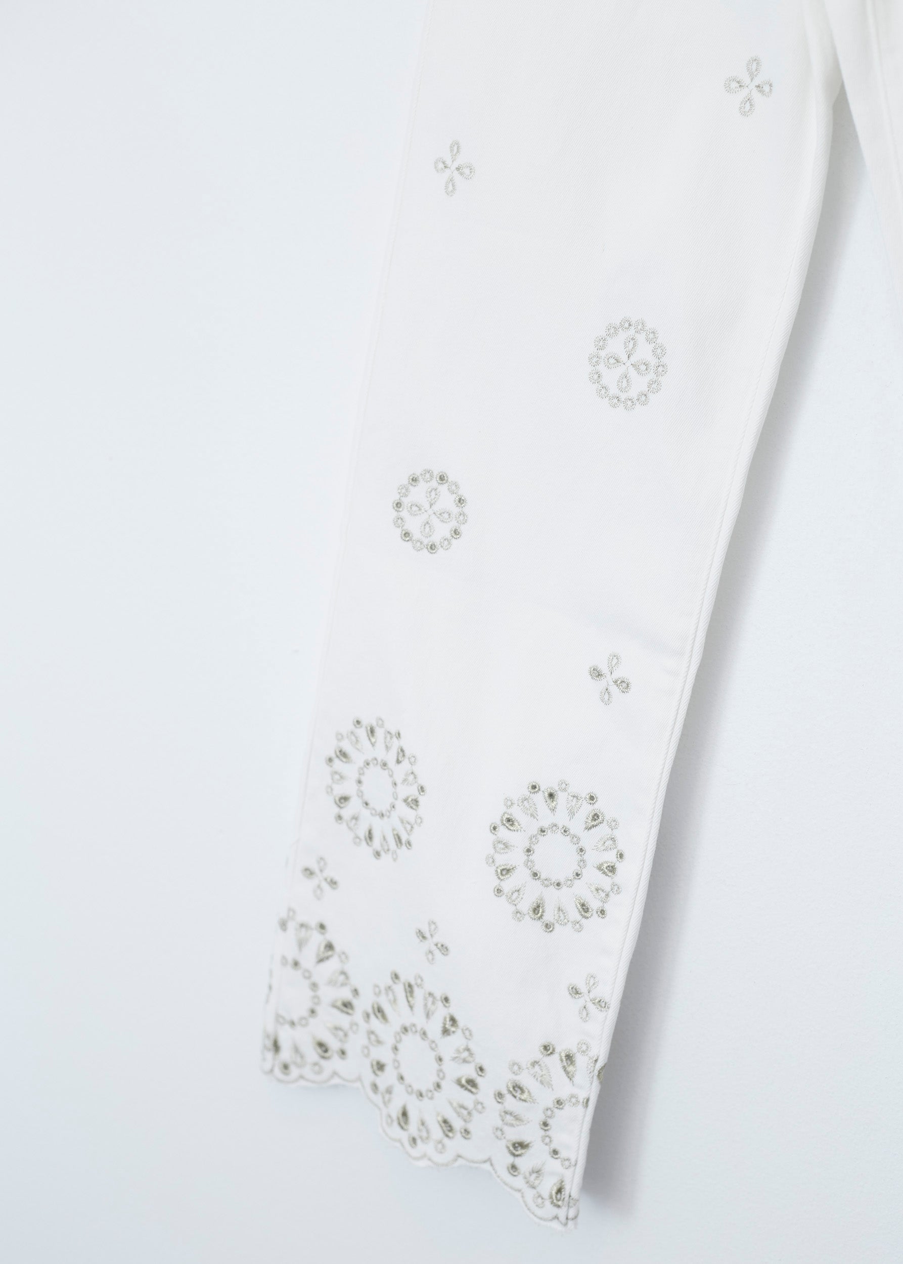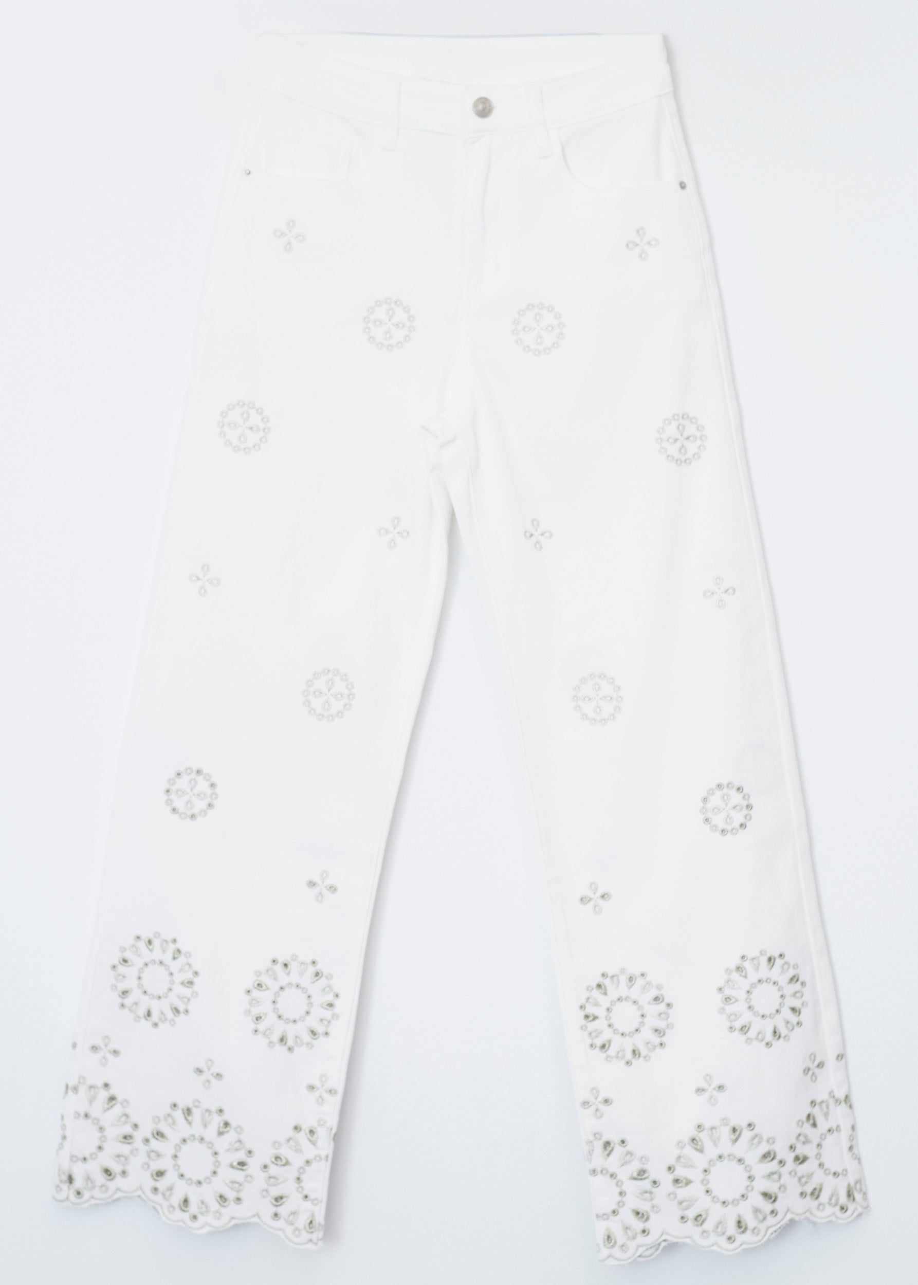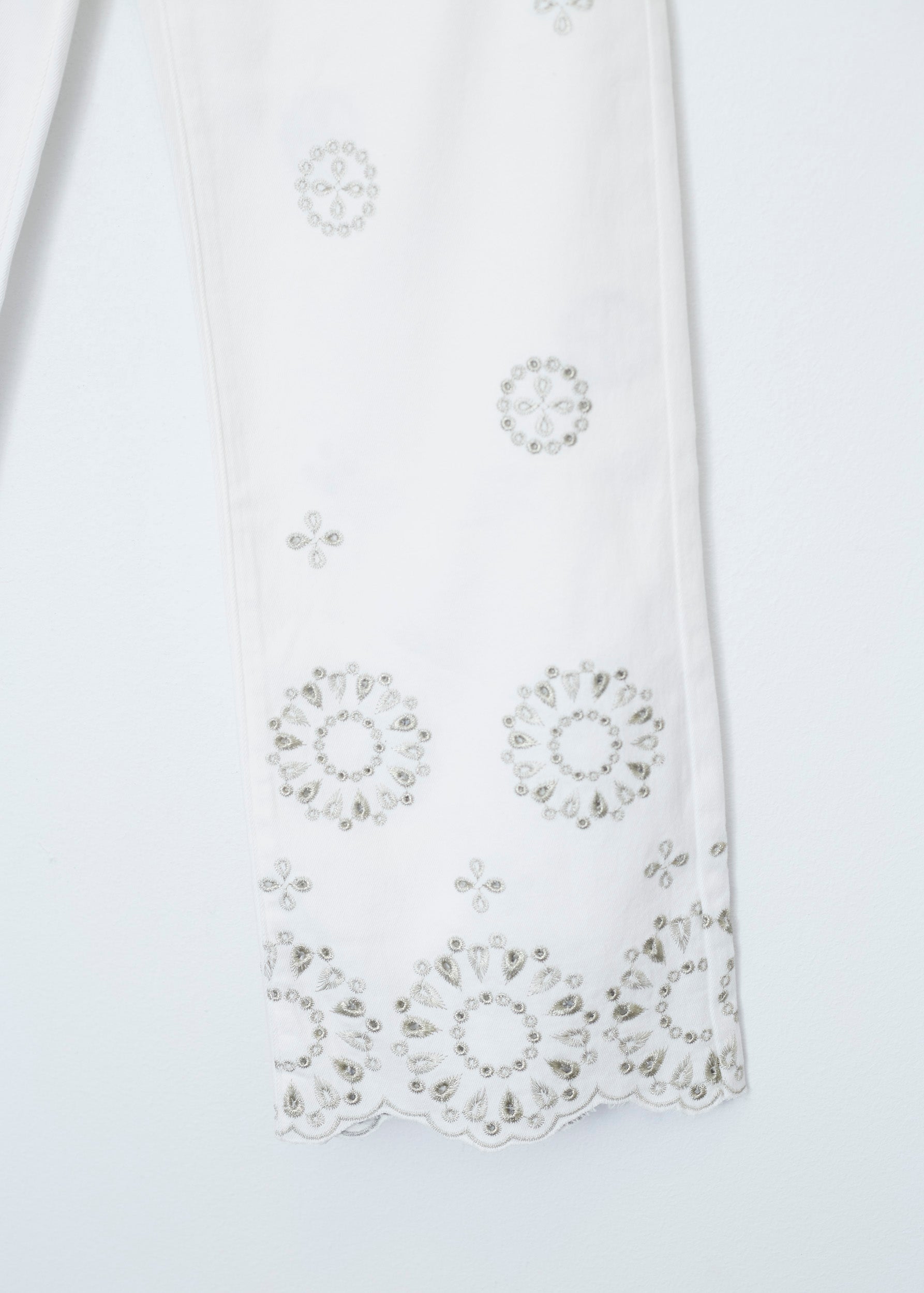 Jeans straight leg de tiro alto. Tres bolsillos frontales y dos bolsillos traseros de plastrón. Detalle de bordados florales perforados. Bajos desflecados.