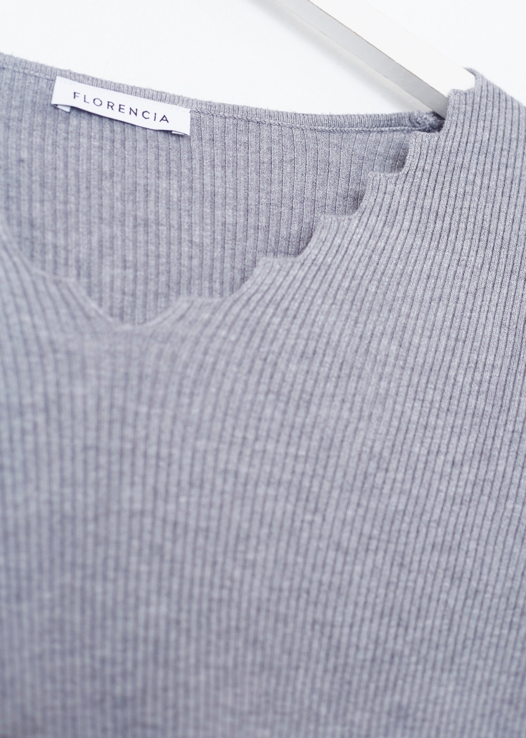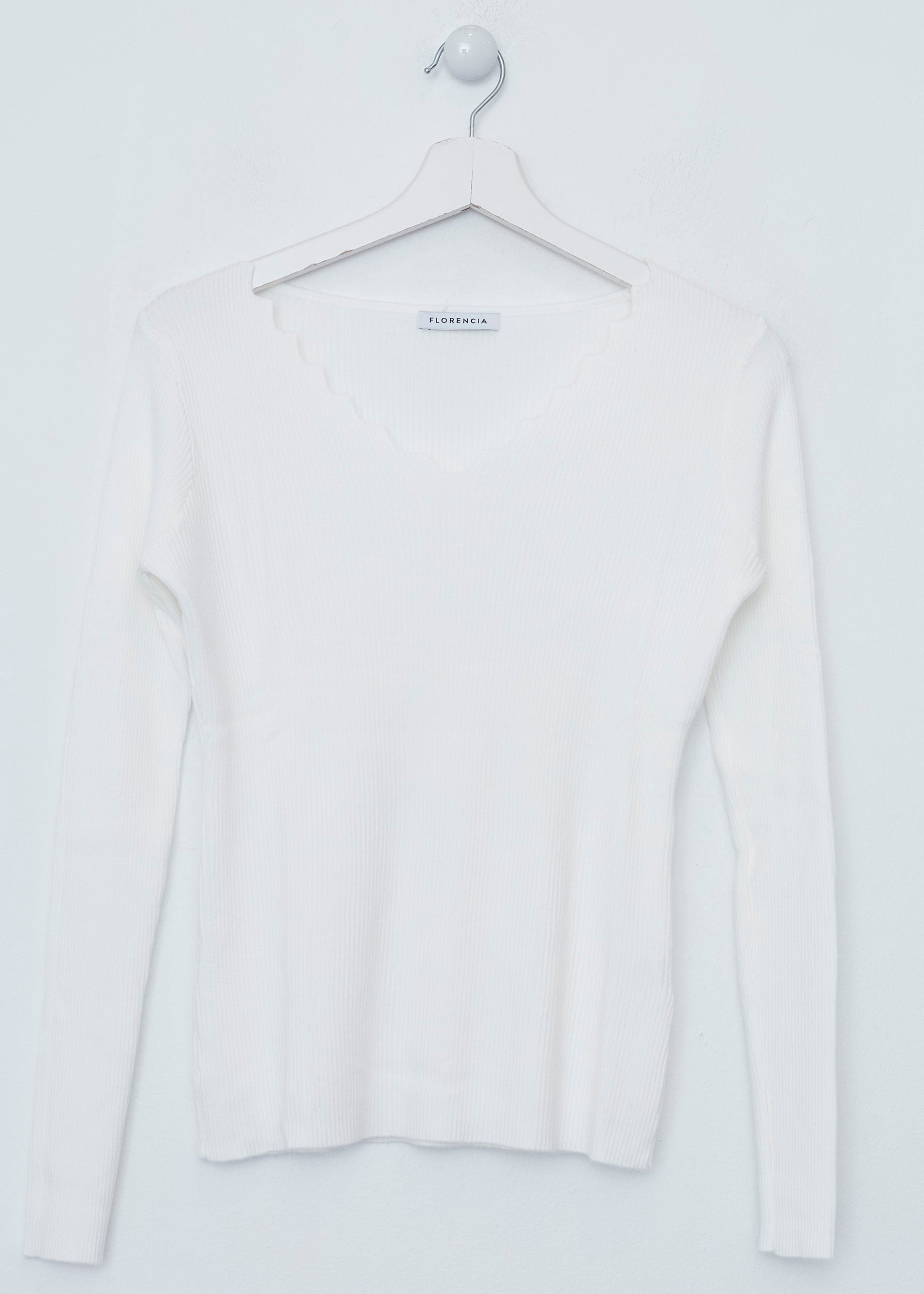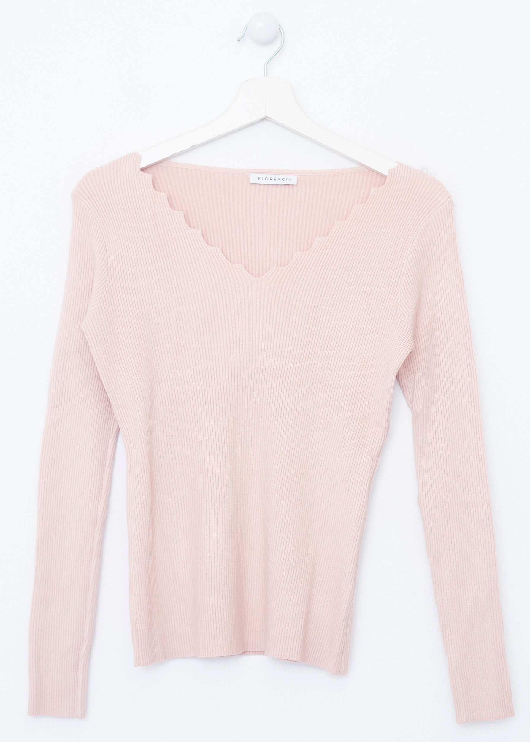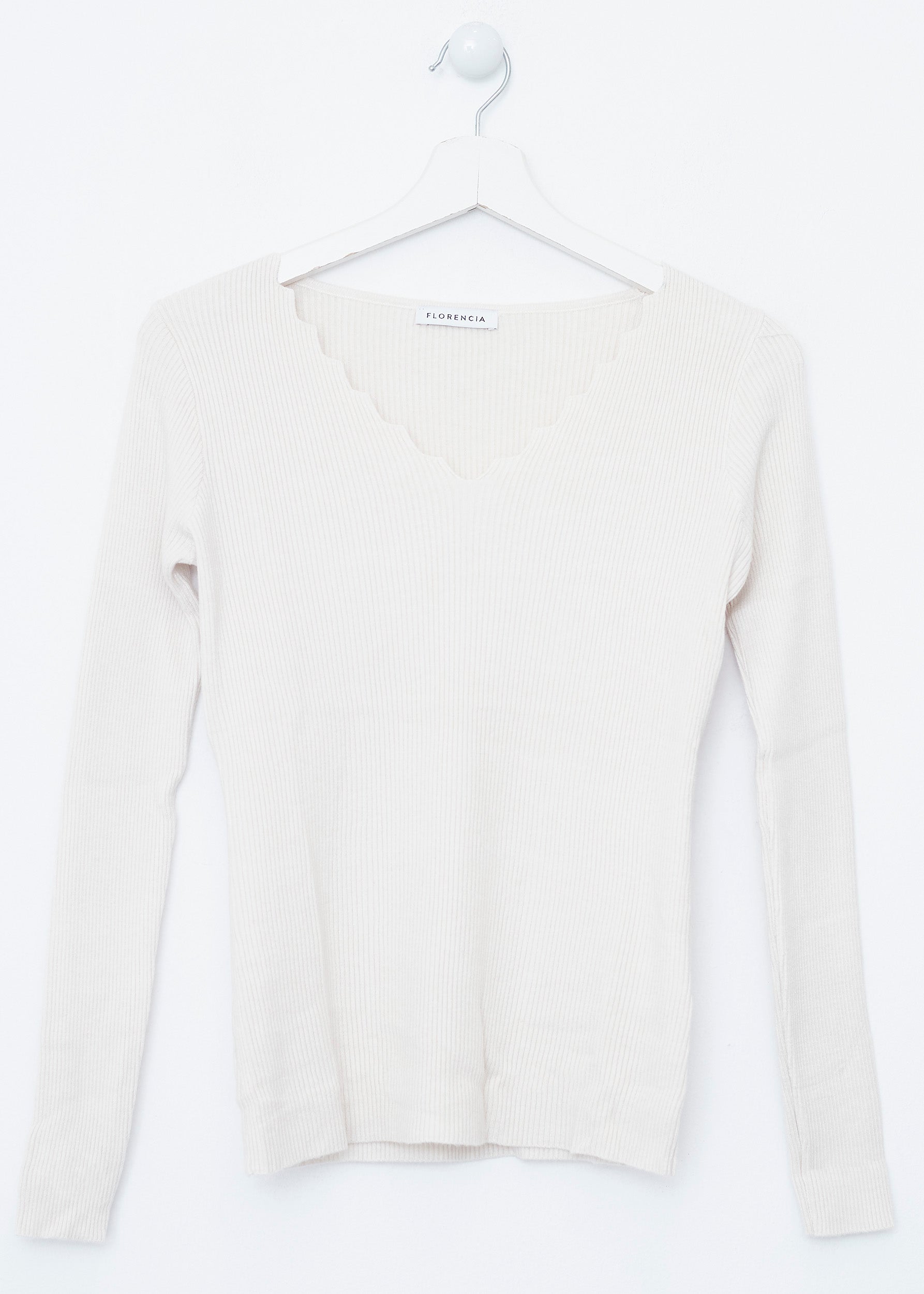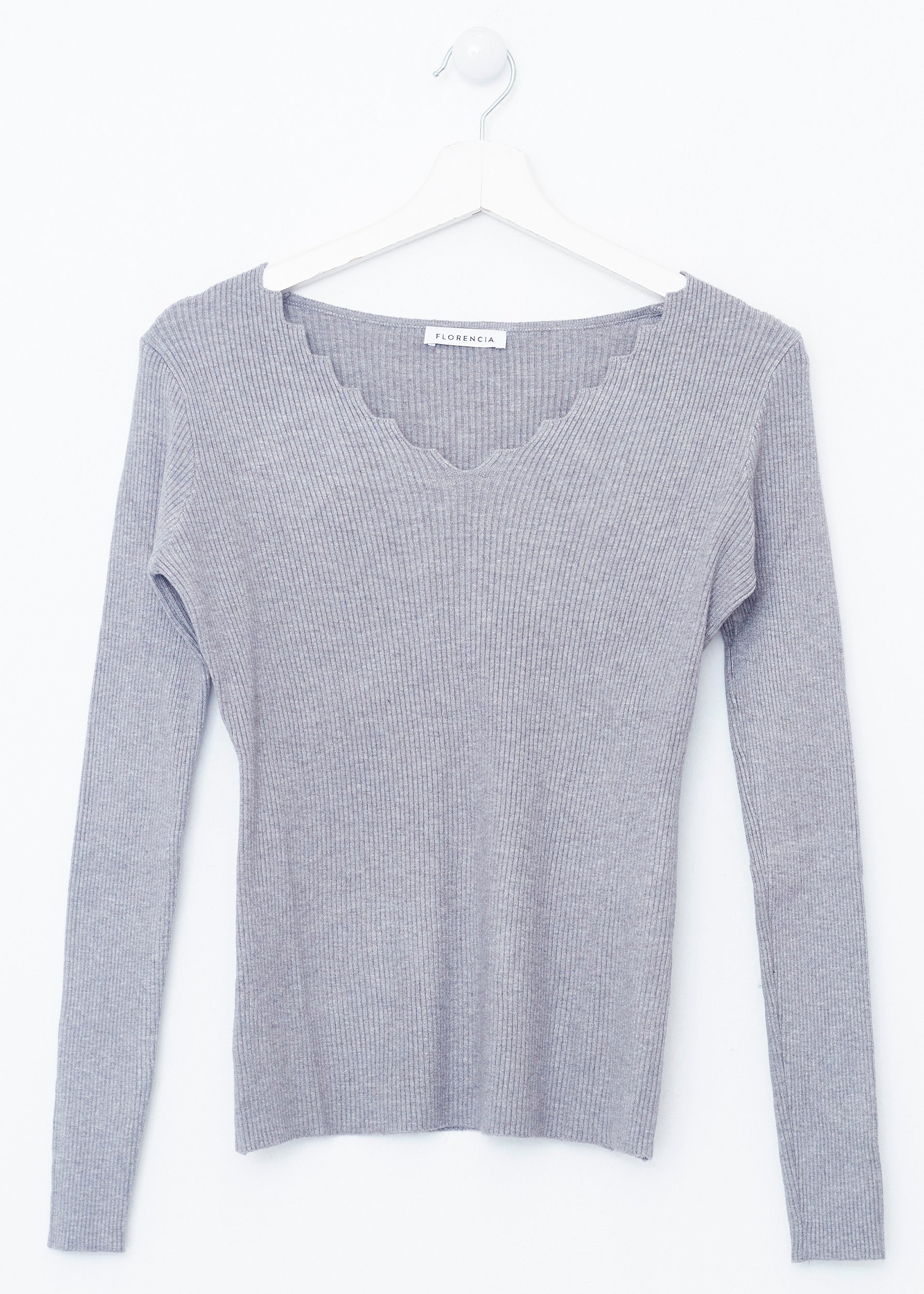 Ribbed sweater with pointed collar and scaled detail. Straight cut.
