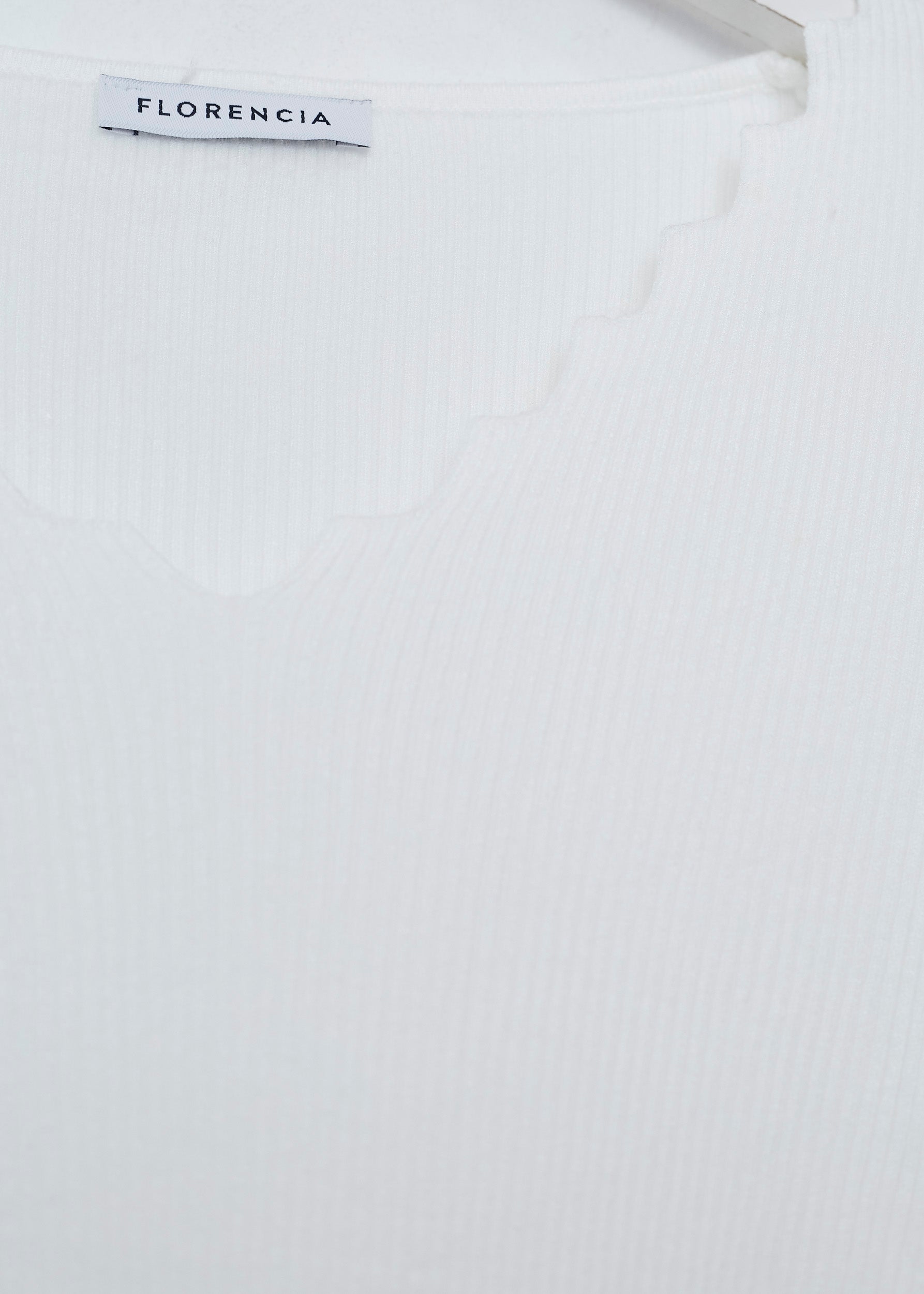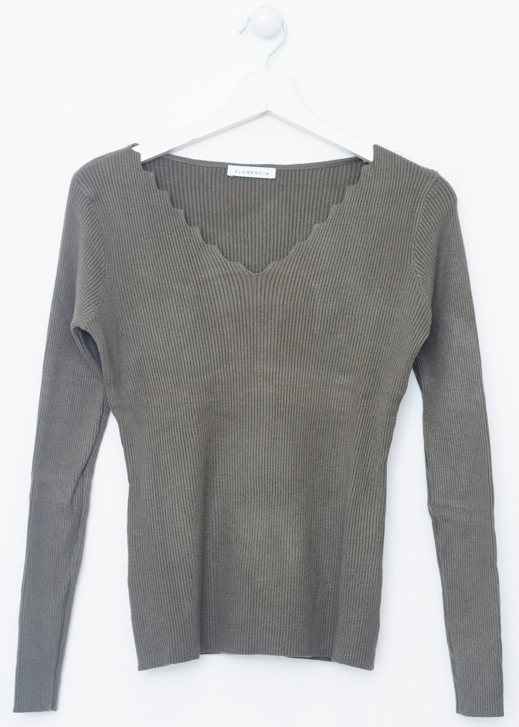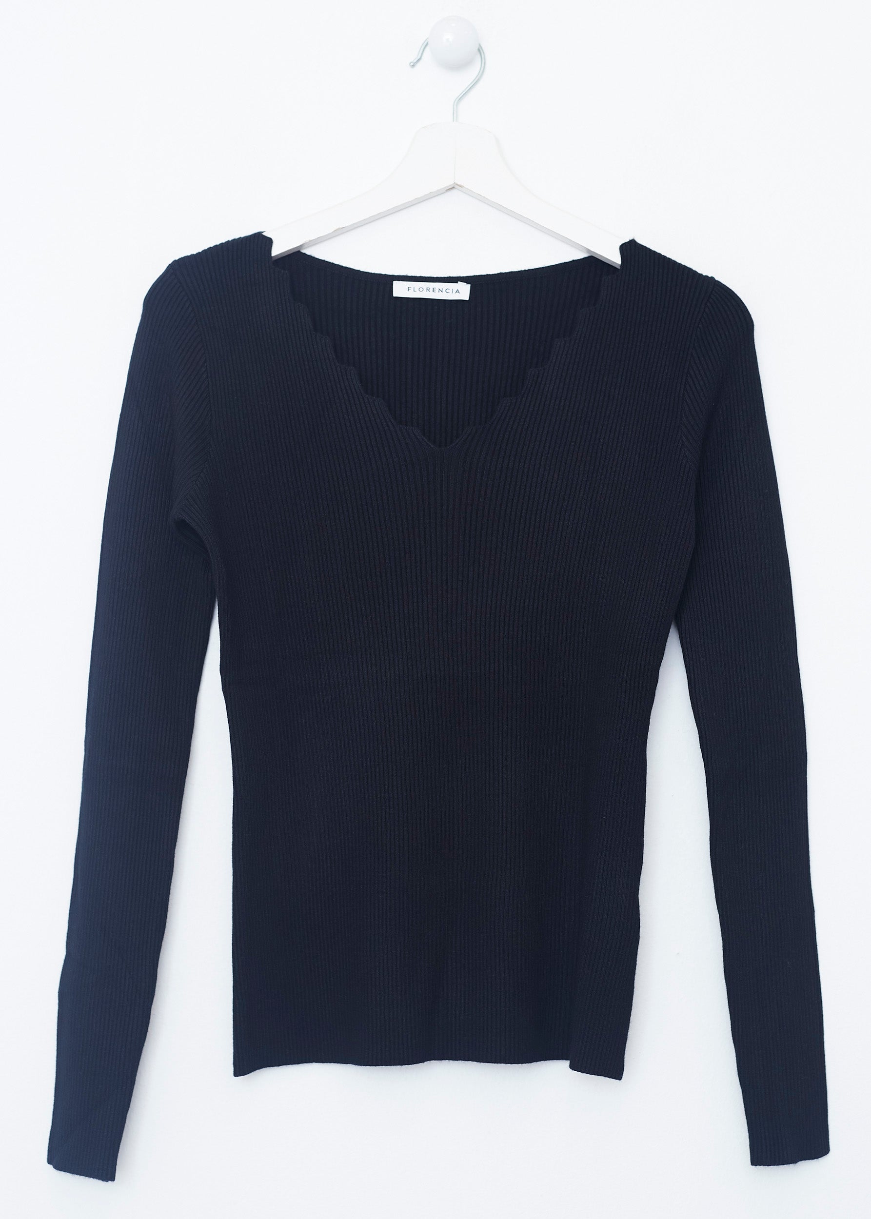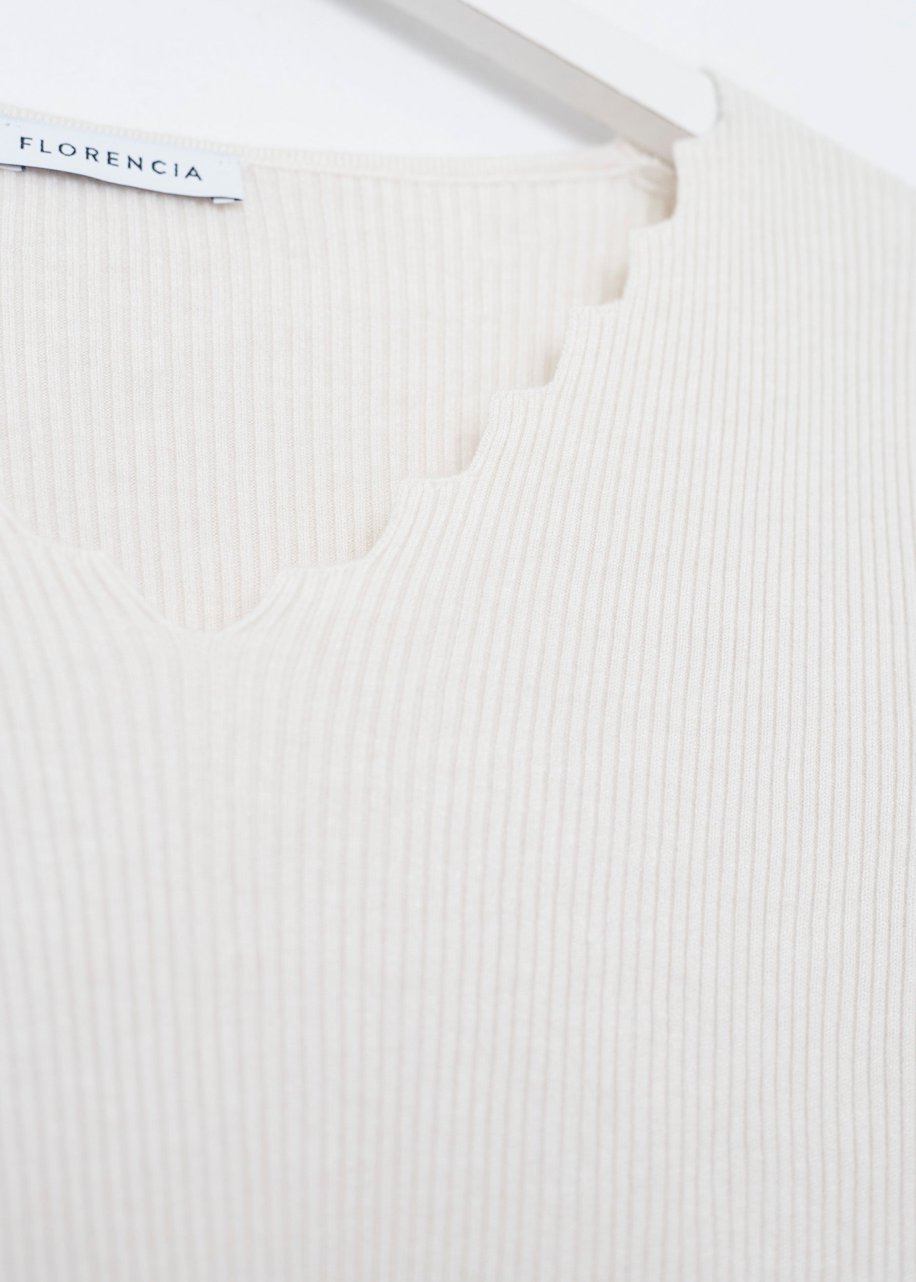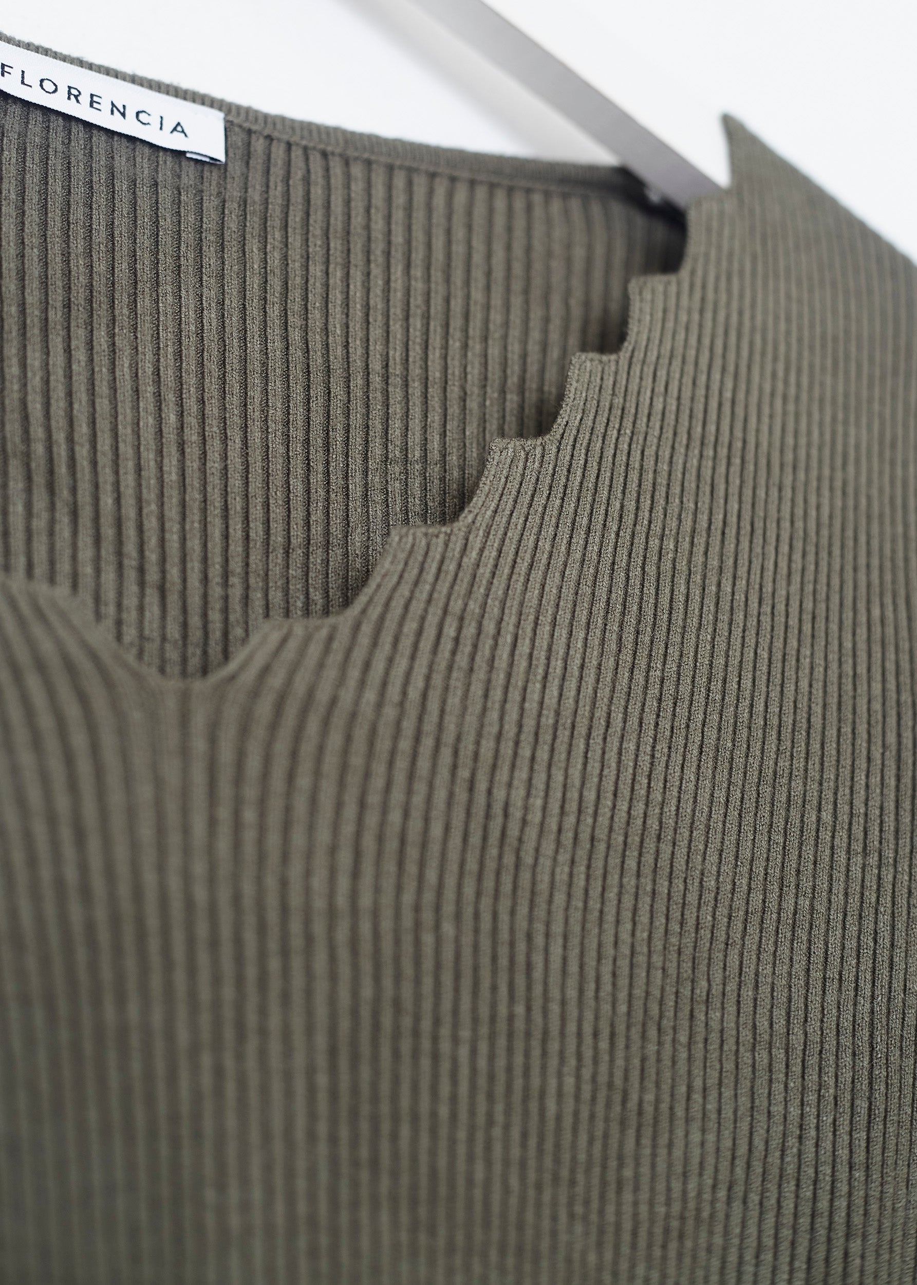 Ribbed sweater with pointed collar and scaled detail. Straight cut.