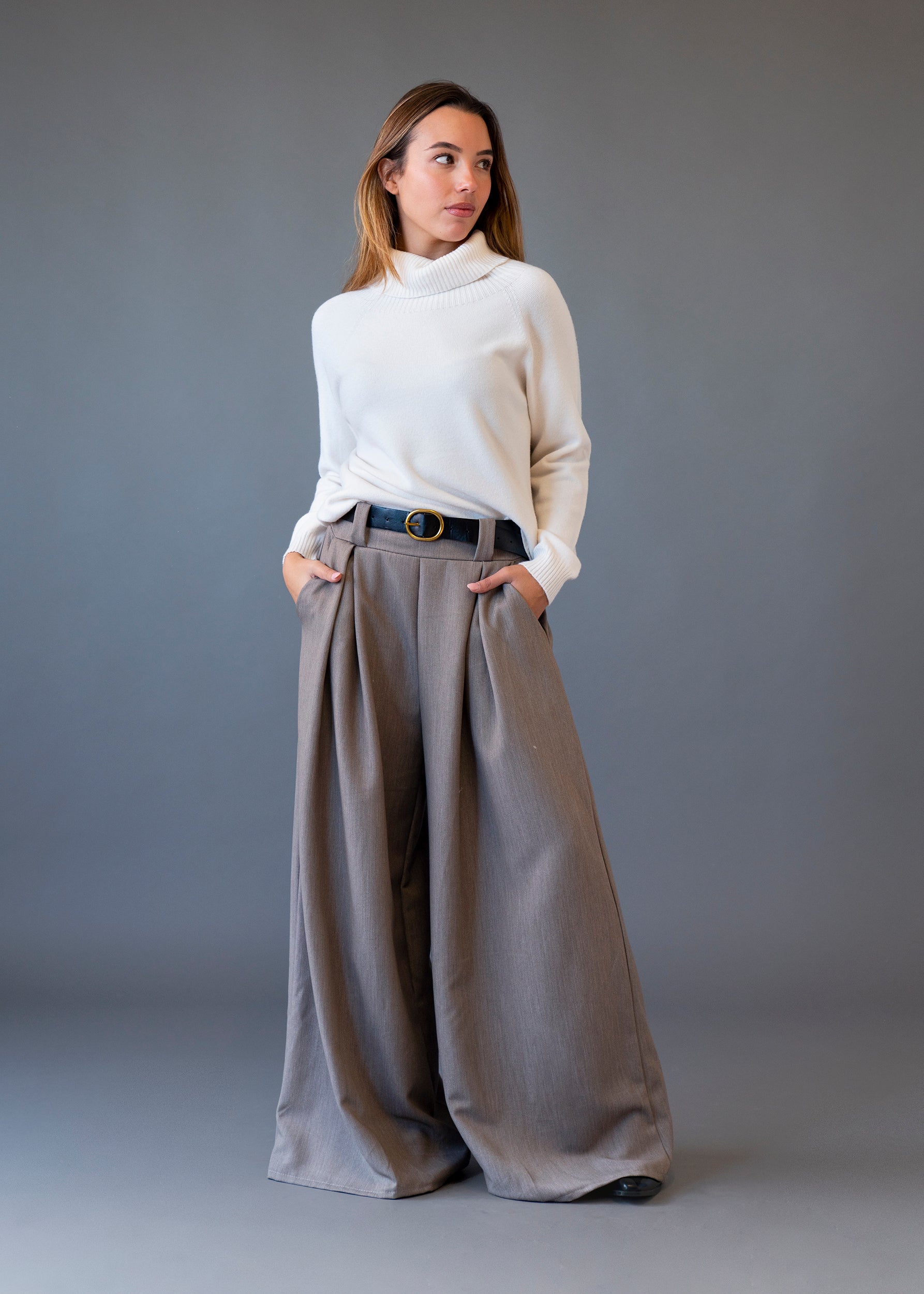 Jersey de cuello alto y manga larga. Corte amplio. Acabados en rib.