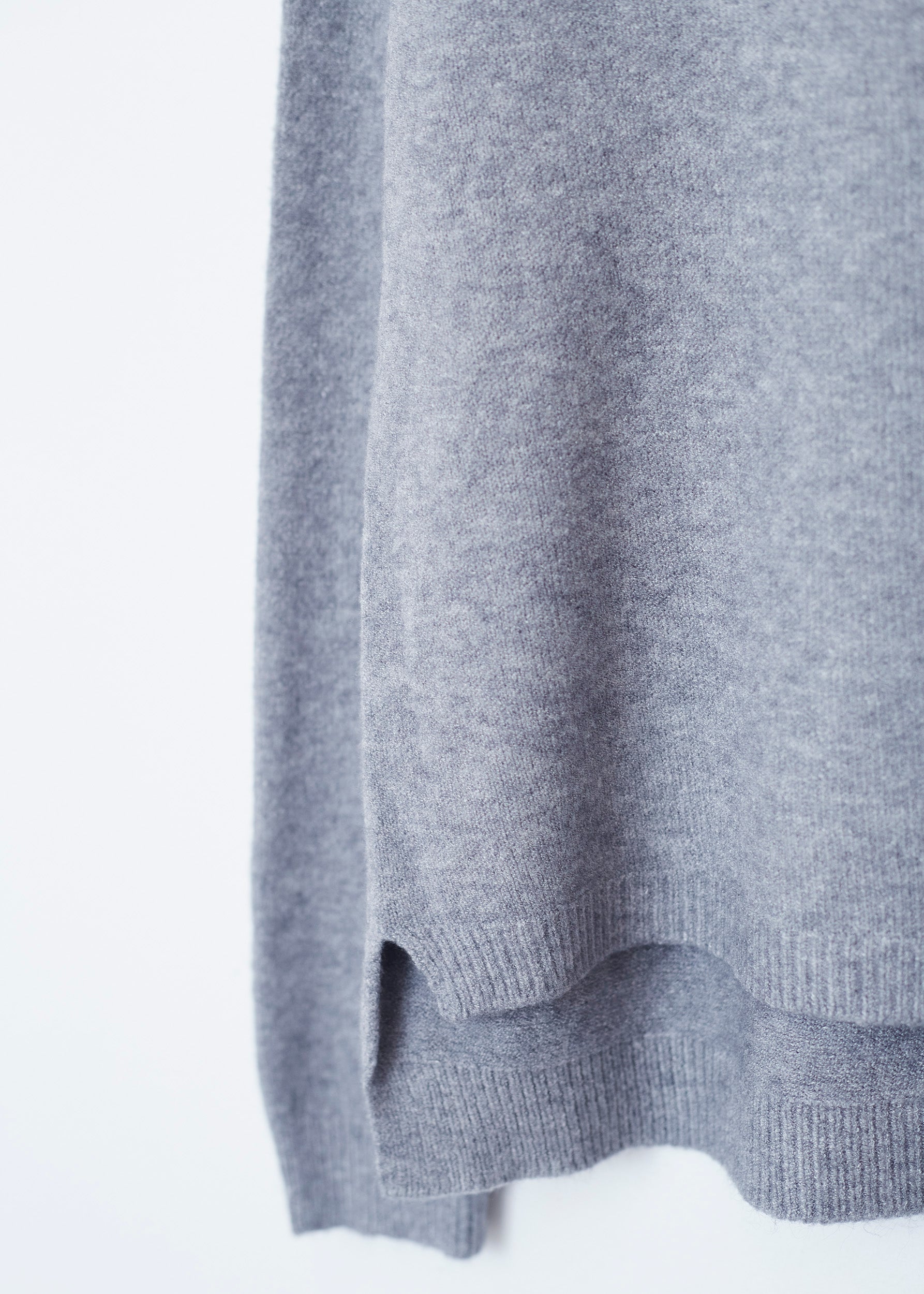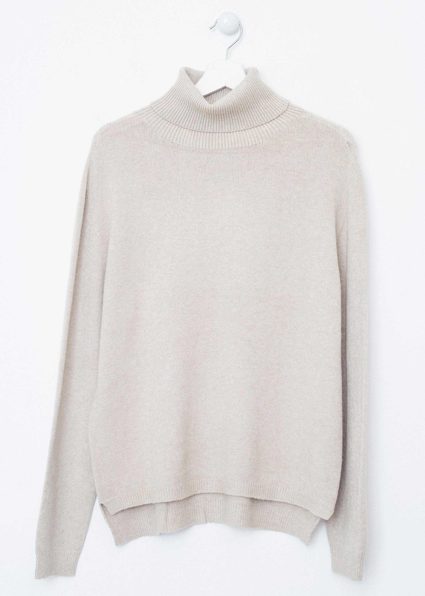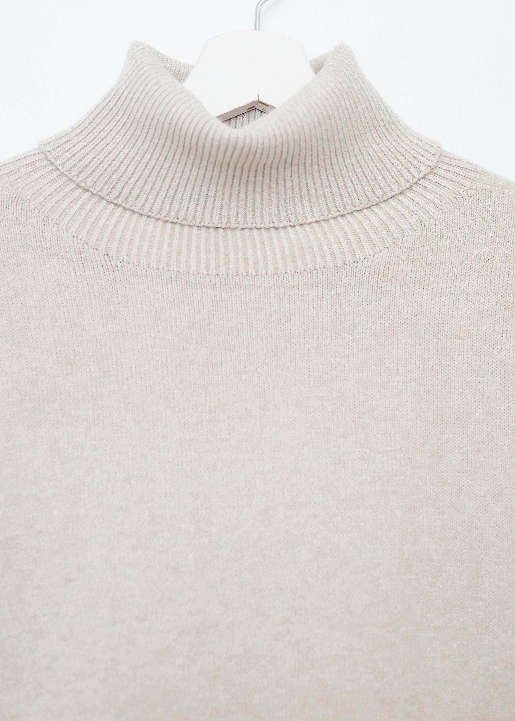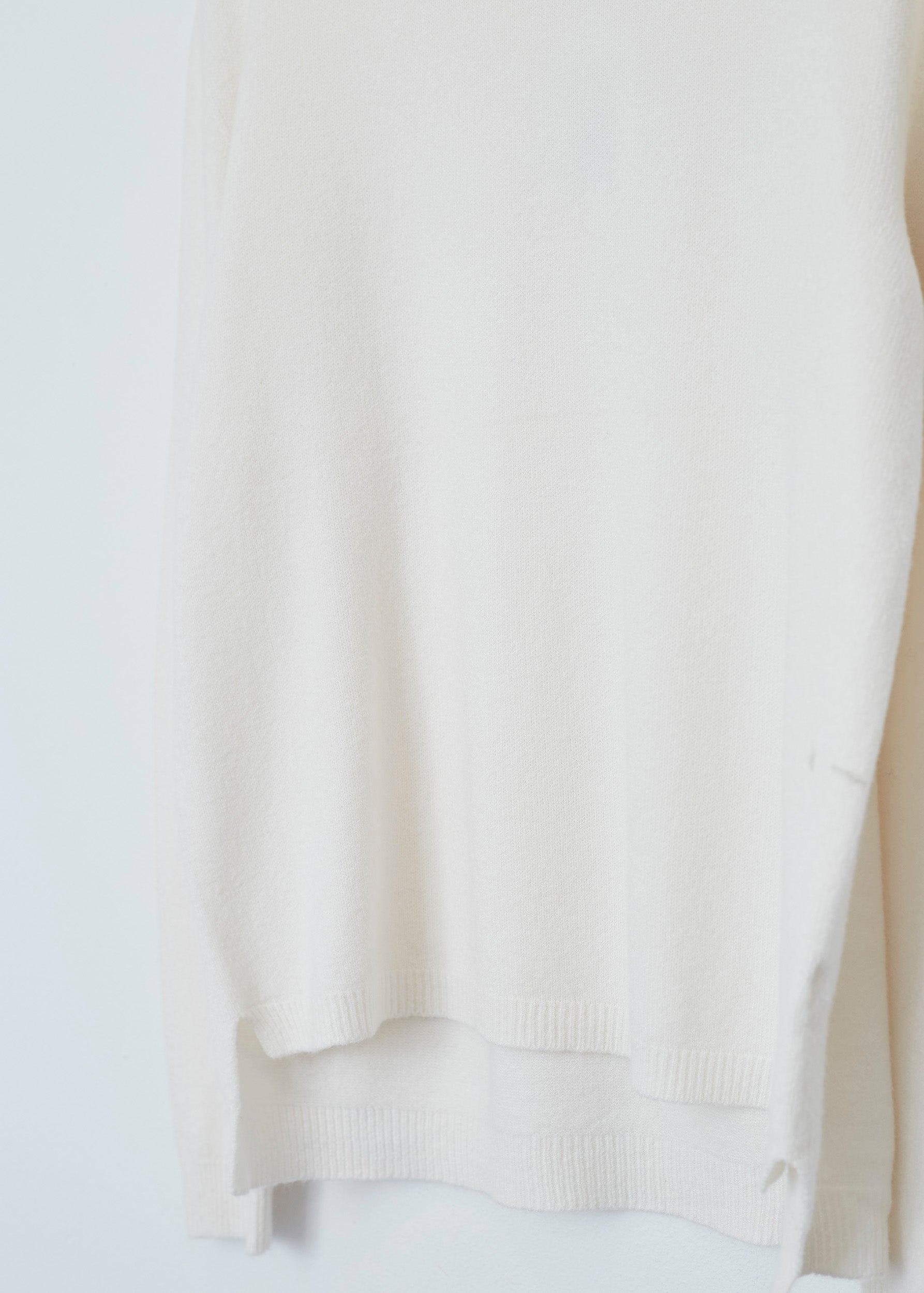 Loose-fitting, high-neck, seamless sweater. Asymmetric hem with slight side slits.
