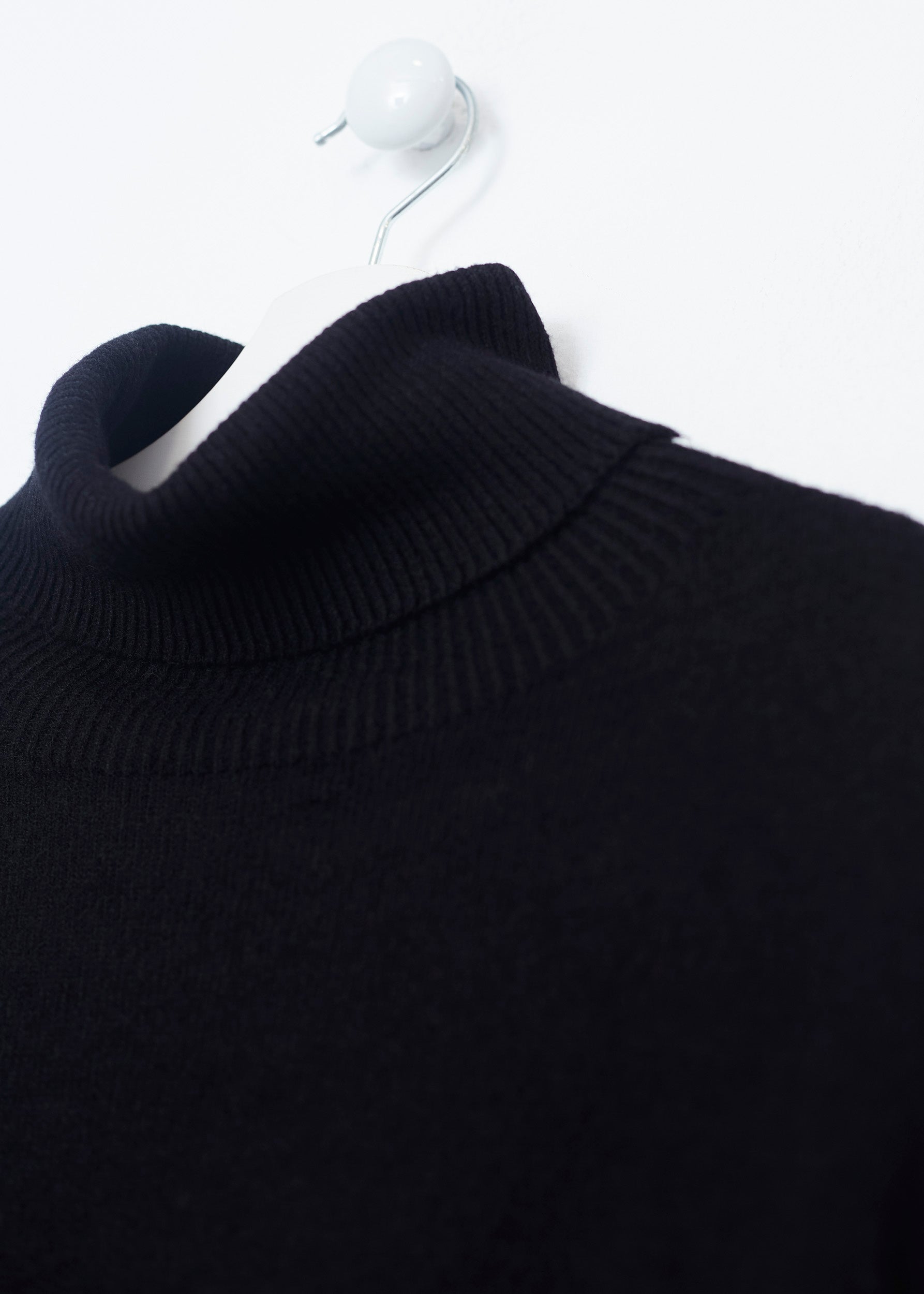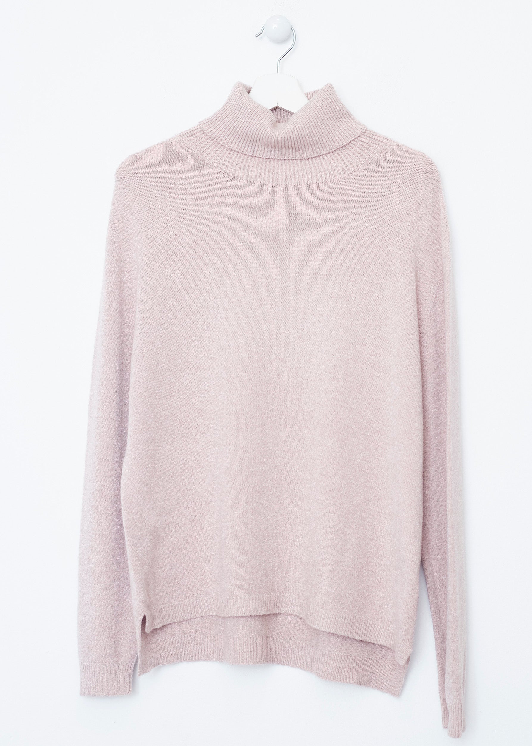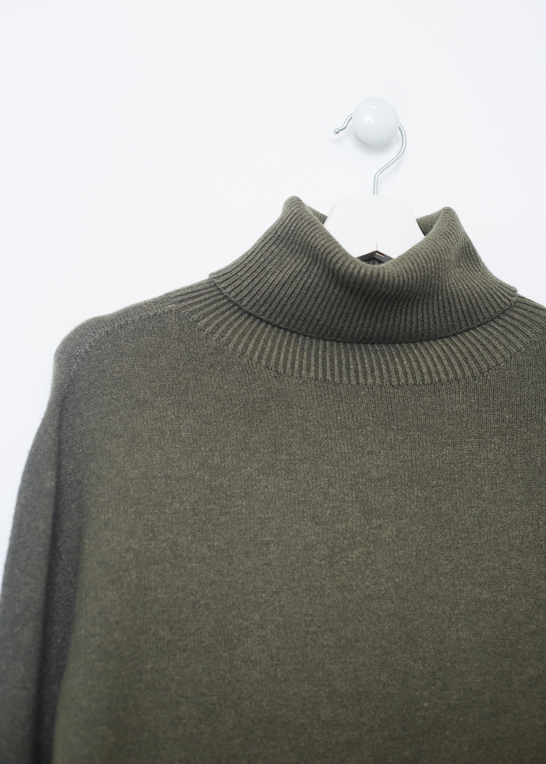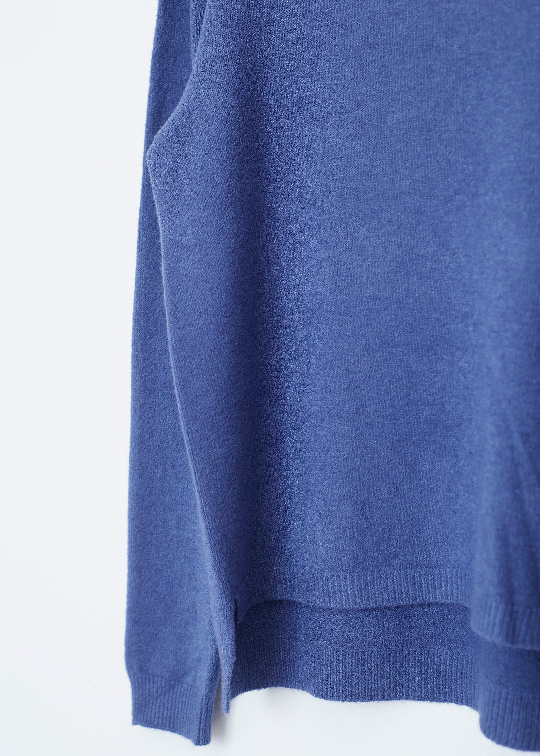 Loose-fitting, high-neck, seamless sweater. Asymmetric hem with slight side slits.