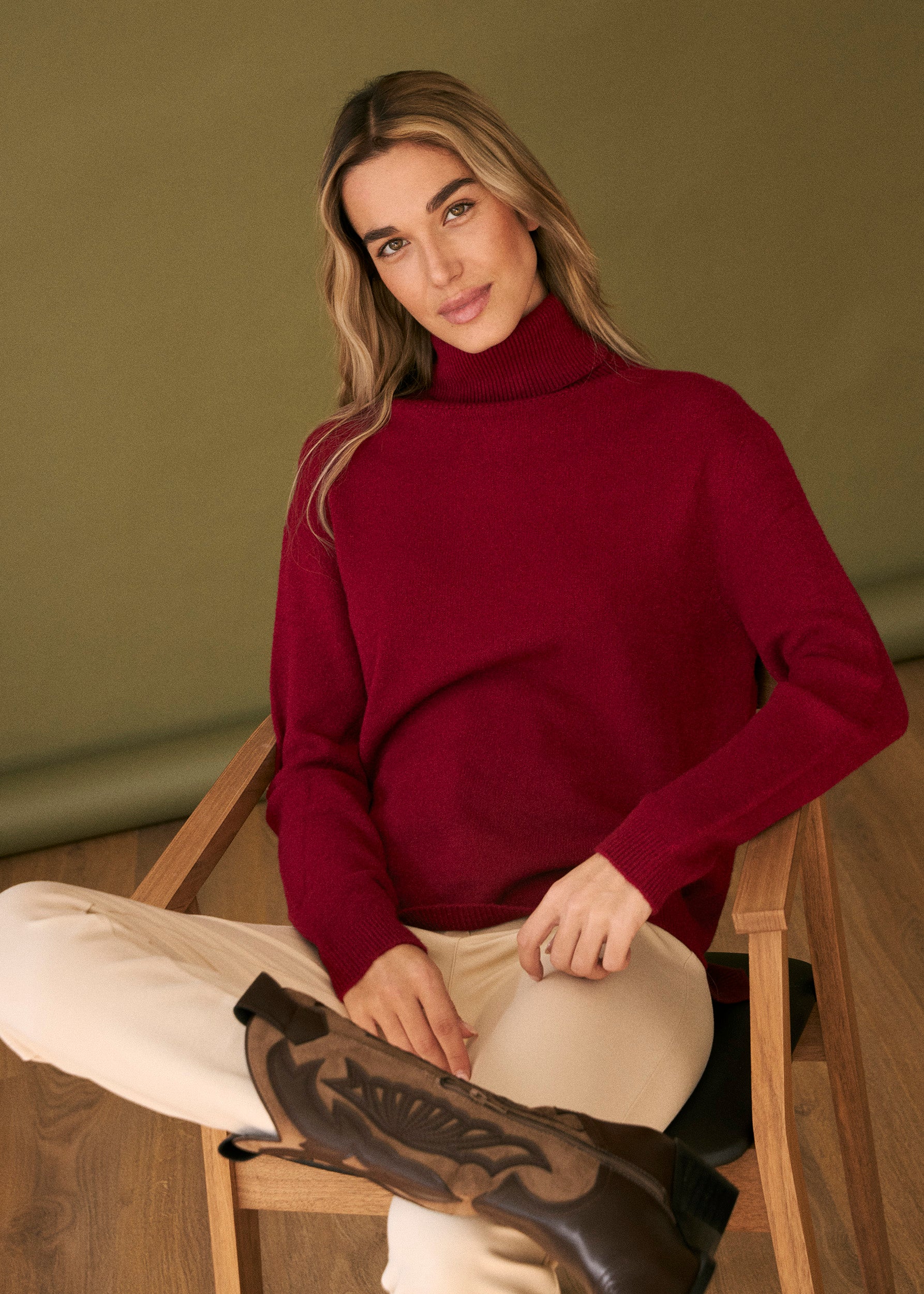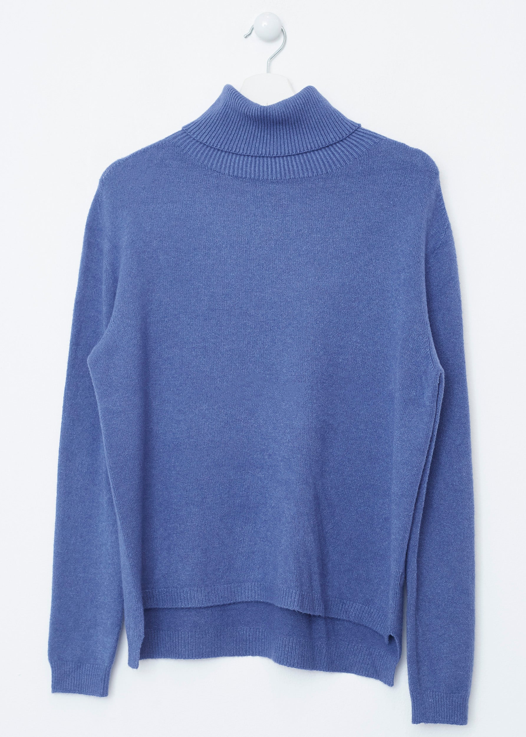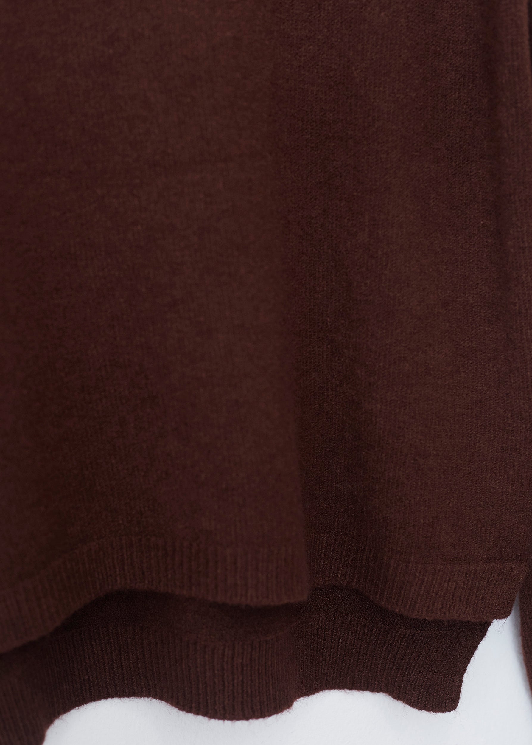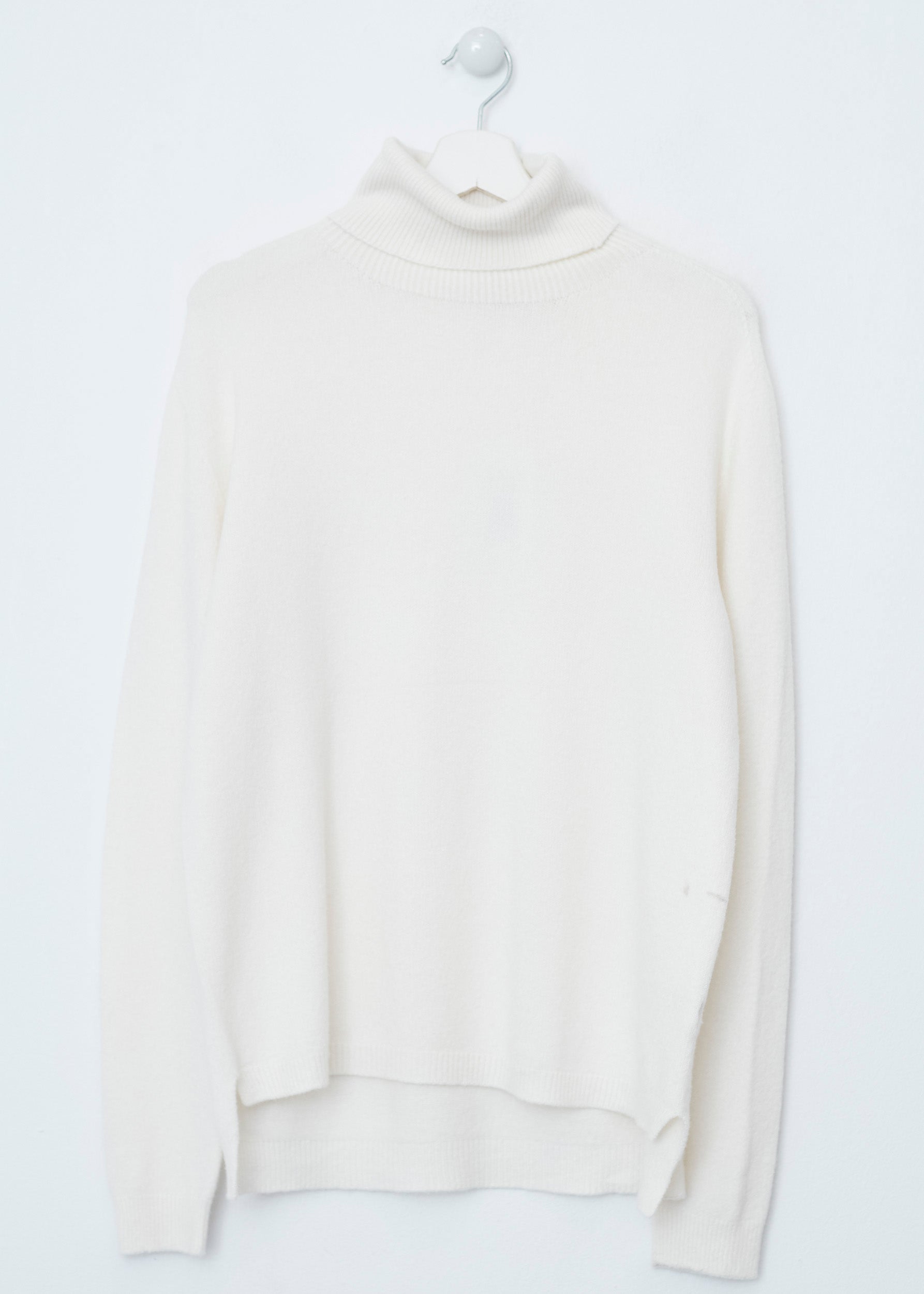 Loose-fitting, high-neck, seamless sweater. Asymmetric hem with slight side slits.