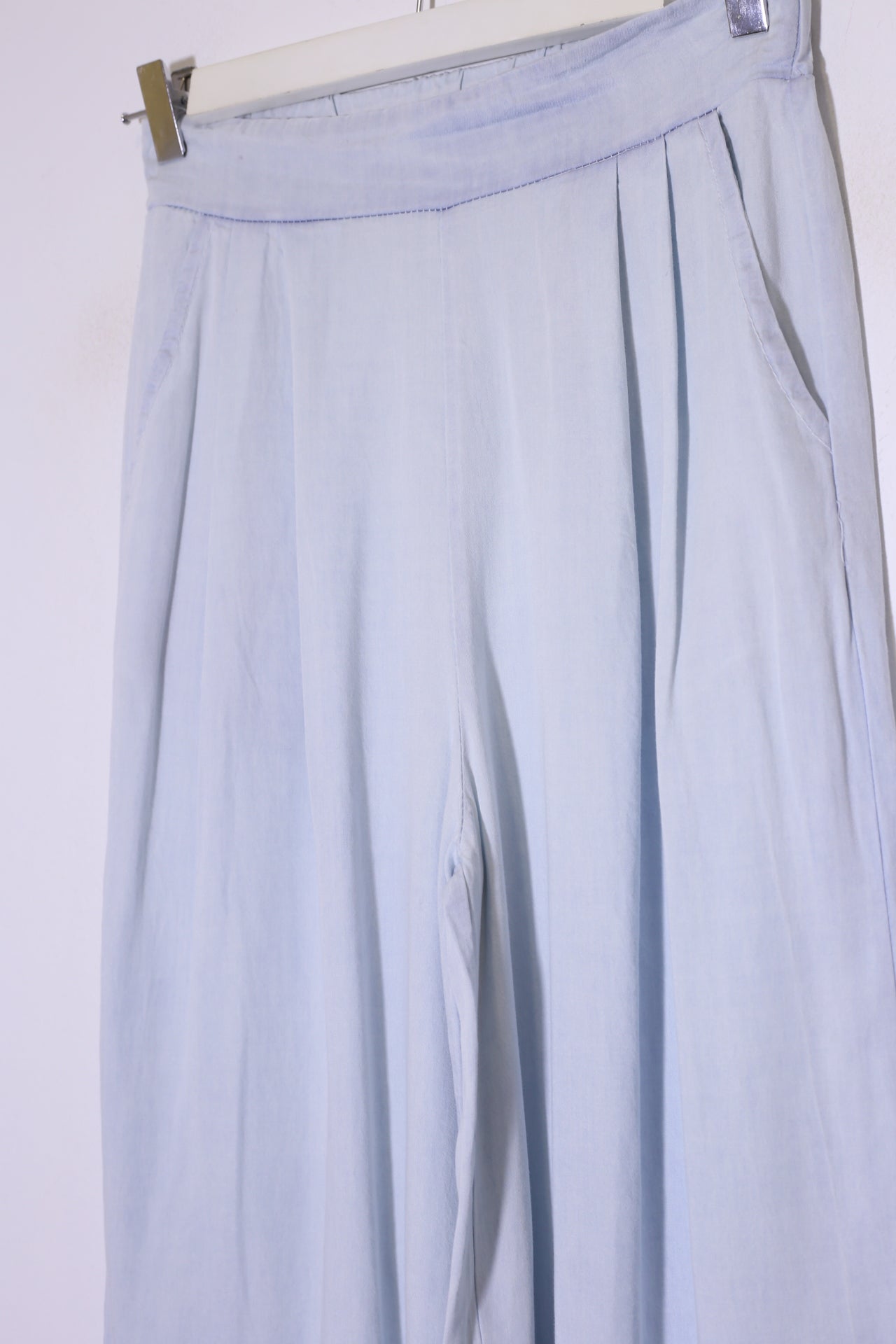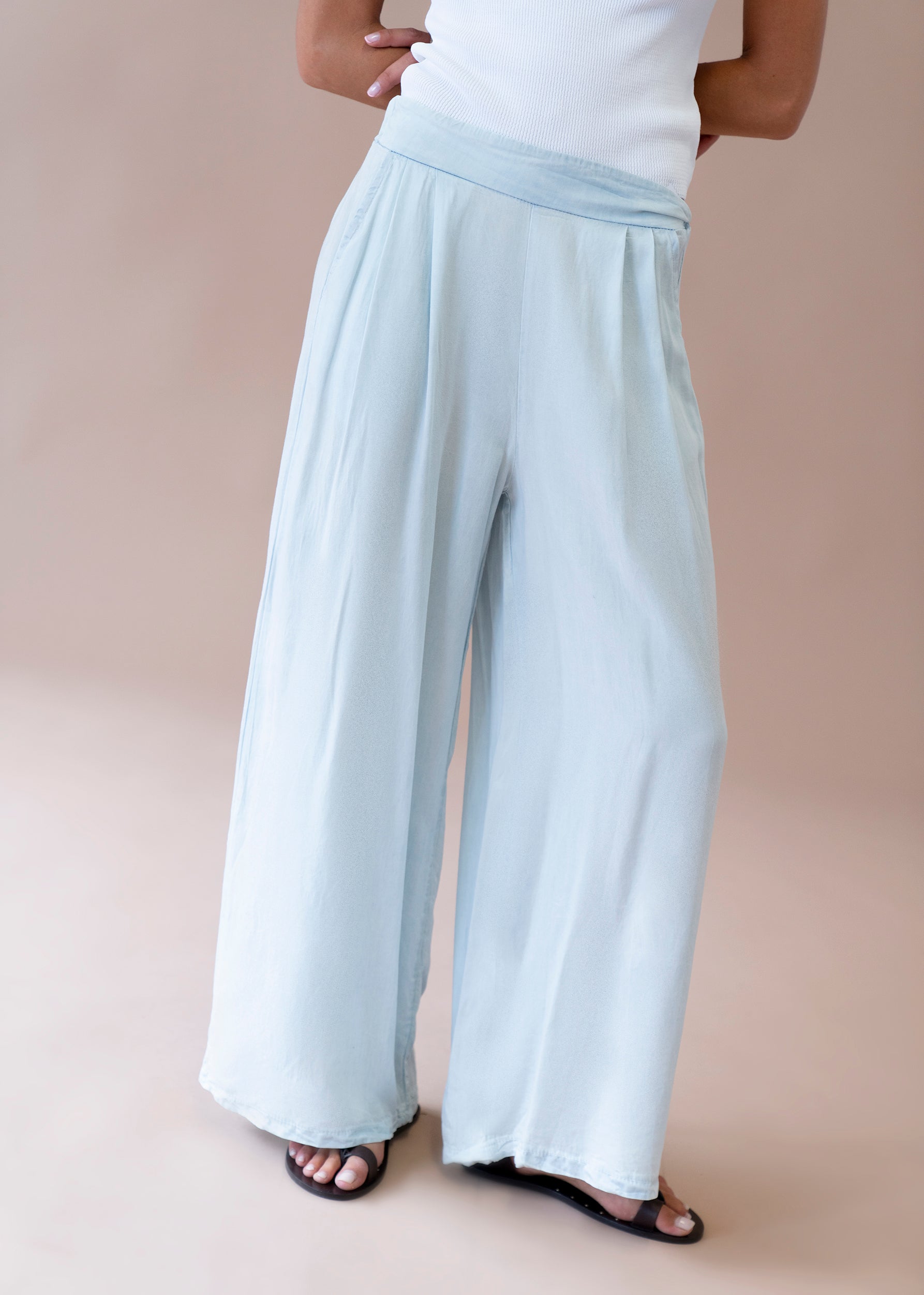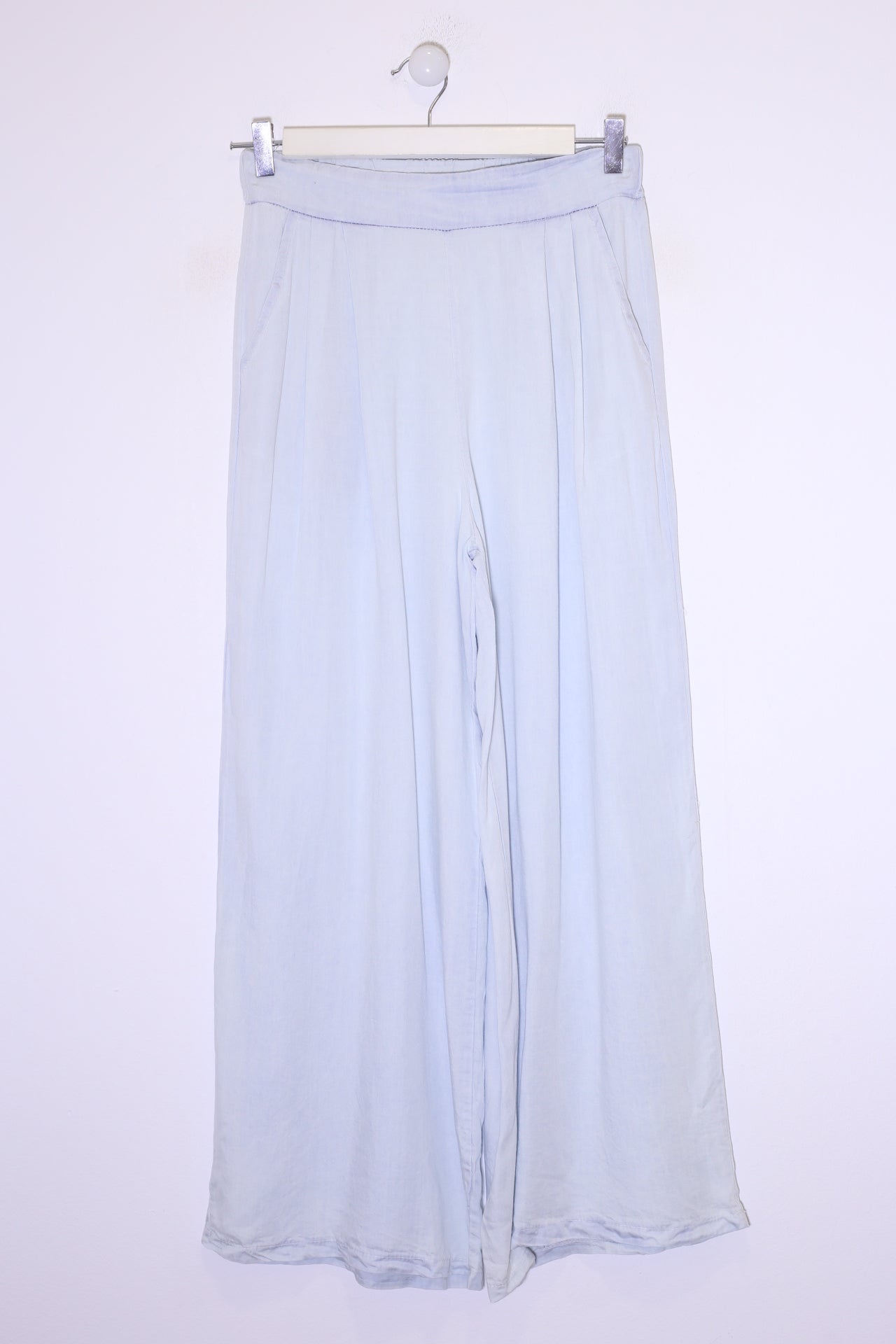 Pantalón de tiro alto y pierna ancha. Detalle de elástico en la parte trasera de la cintura.