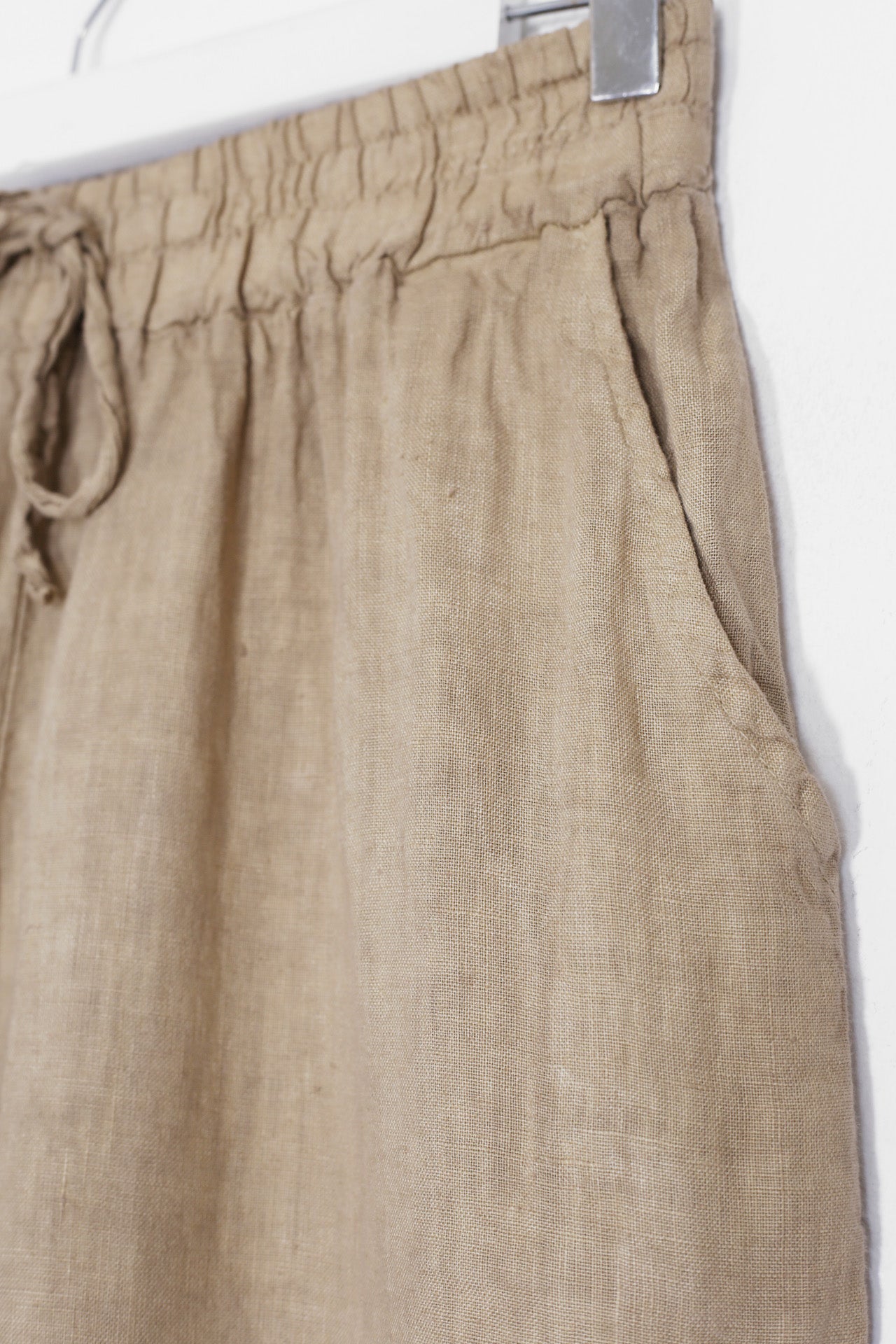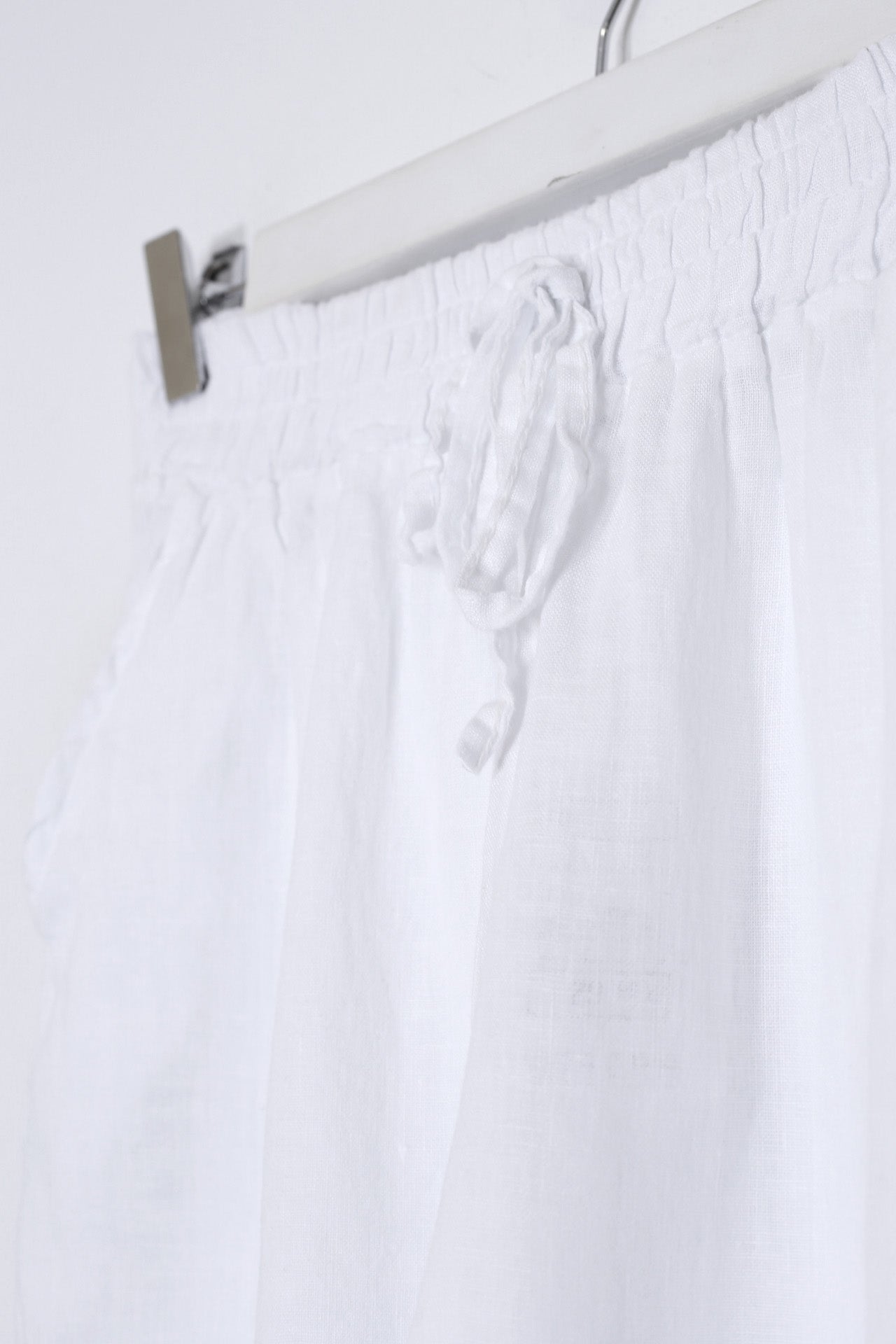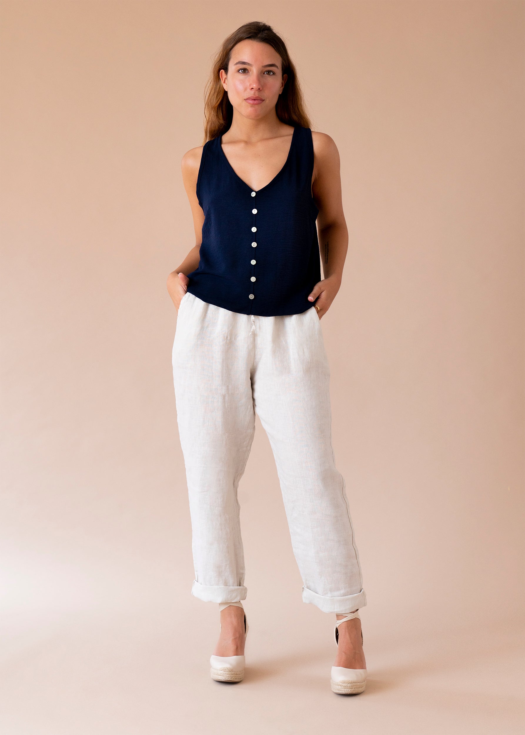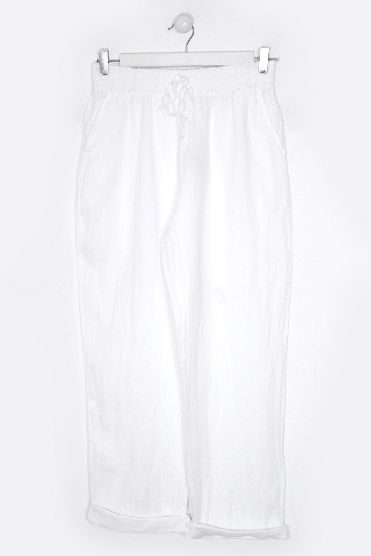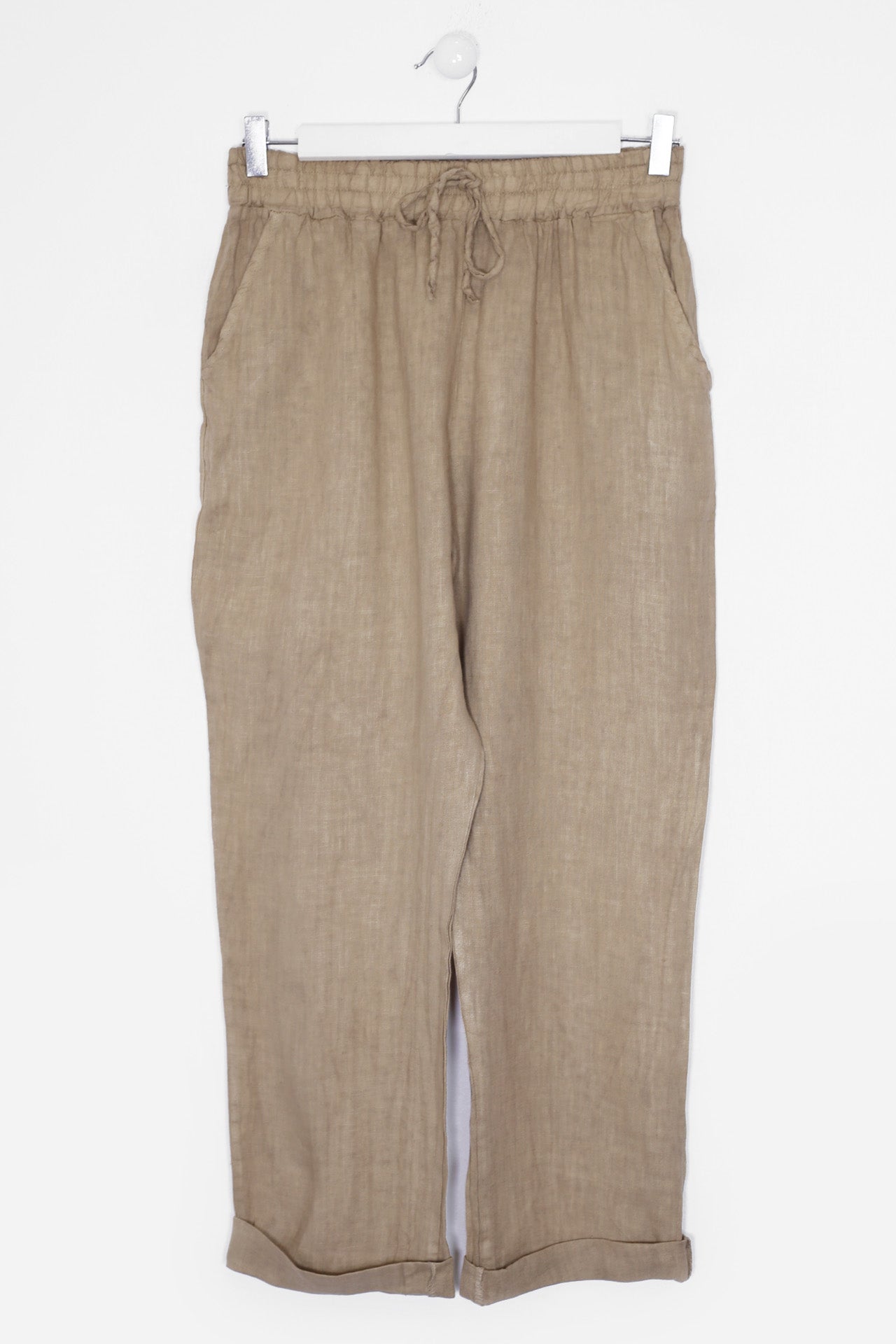 Pantalones de tiro alto estrechos 100% lino. Cintura elástica con detalle de cordón decorativo. Bolsillos laterales.